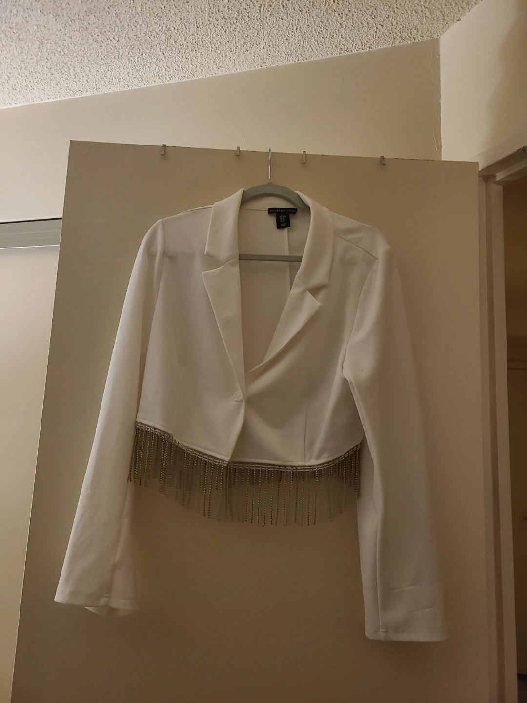Selling a cute white blazer and has a fun, fringed hem. Perfect for dressing up an outfit! Size Large bought in Vegas. I marked down to 5.00 I only wore it once but noticed a couple of catches in the right sleeve which I just got out best I could.