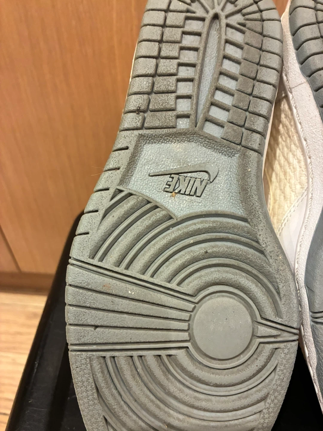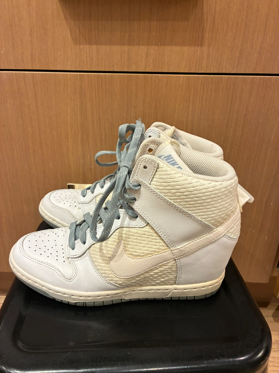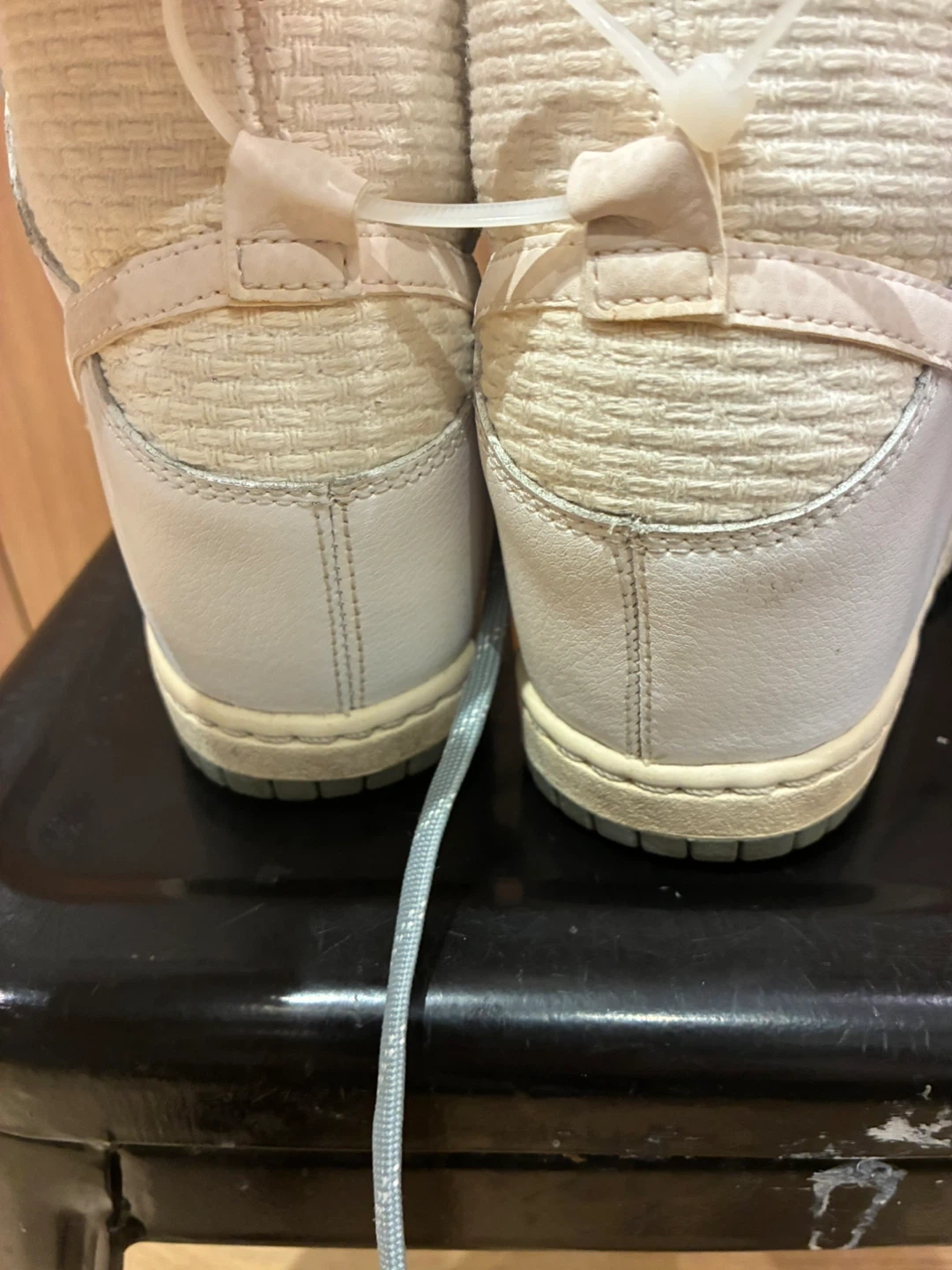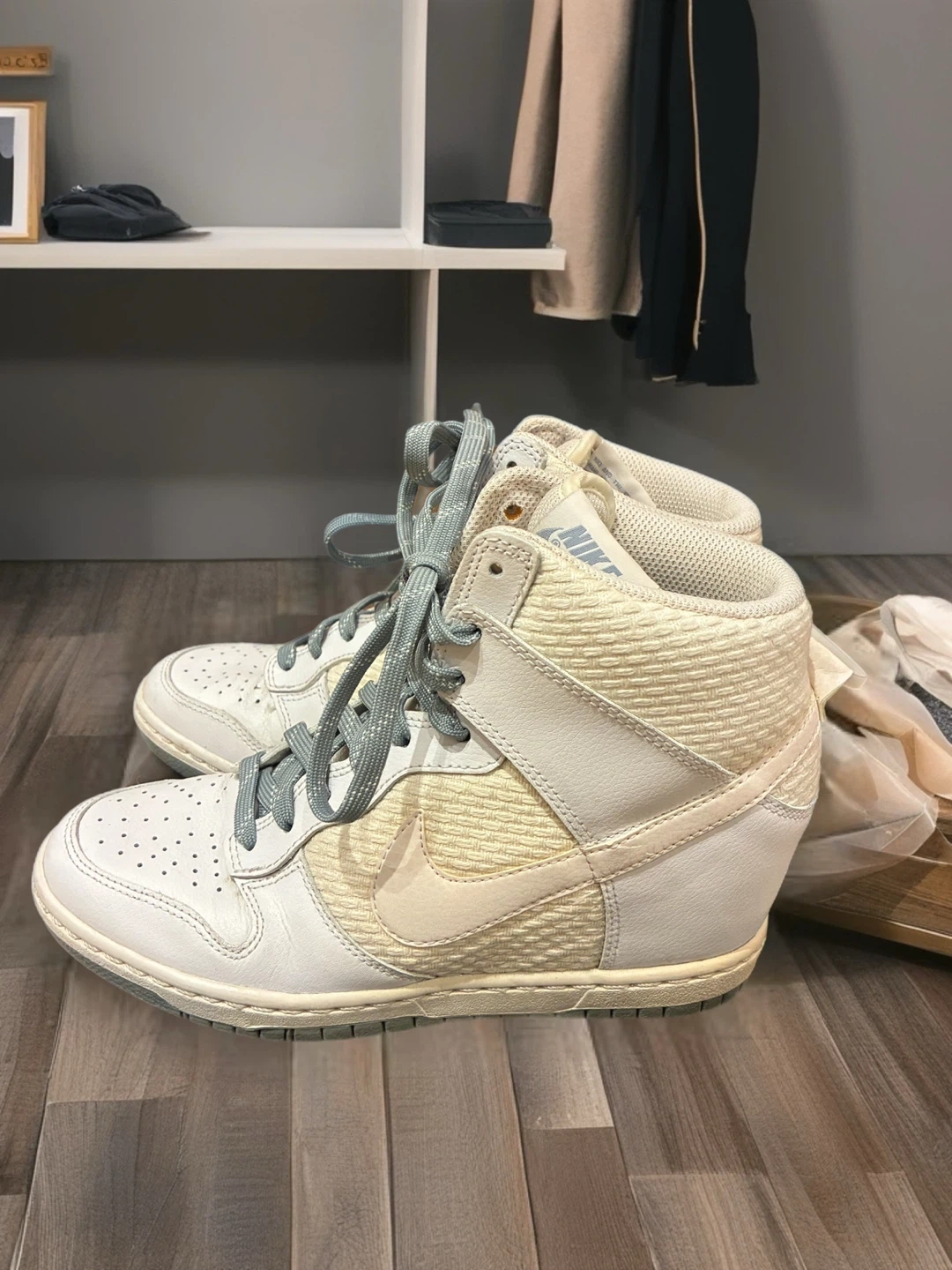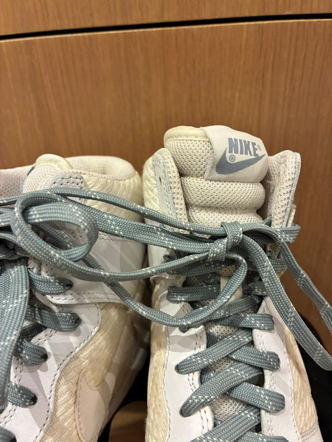 Selling a pair of Nike Dunk High sneakers. They are in good condition with some signs of wear on the soles. The upper material is a mix of leather and woven fabric. These shoes are stylish and comfortable for everyday wear!