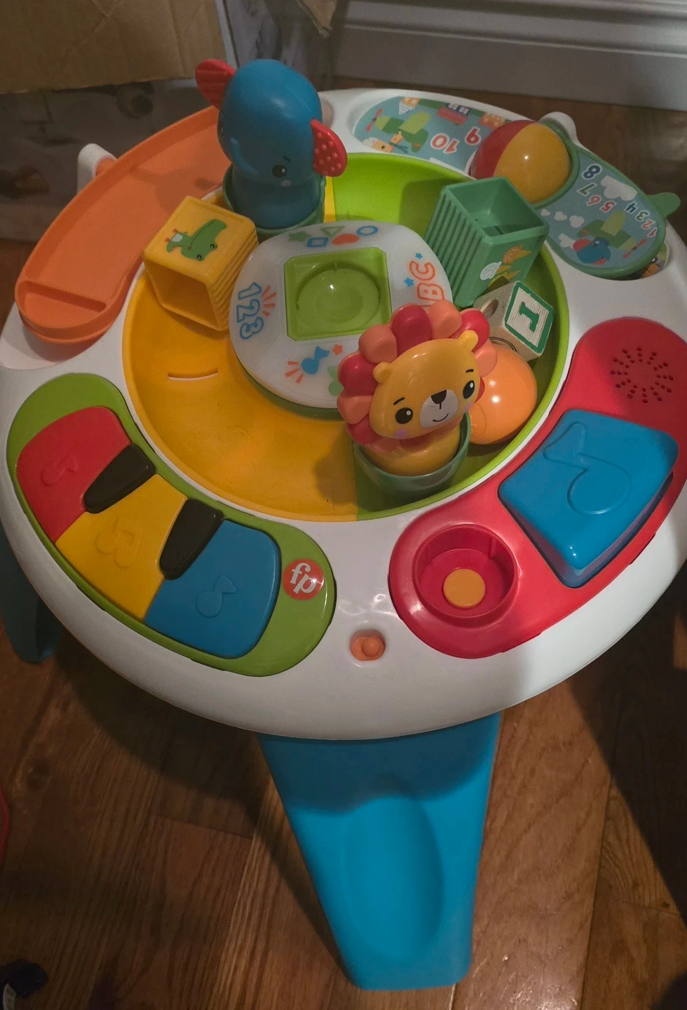 Here's a fun and engaging Fisher-Price activity table! It's perfect for keeping your little one entertained with its colorful design and interactive features. This table is in great condition and ready for a new home
