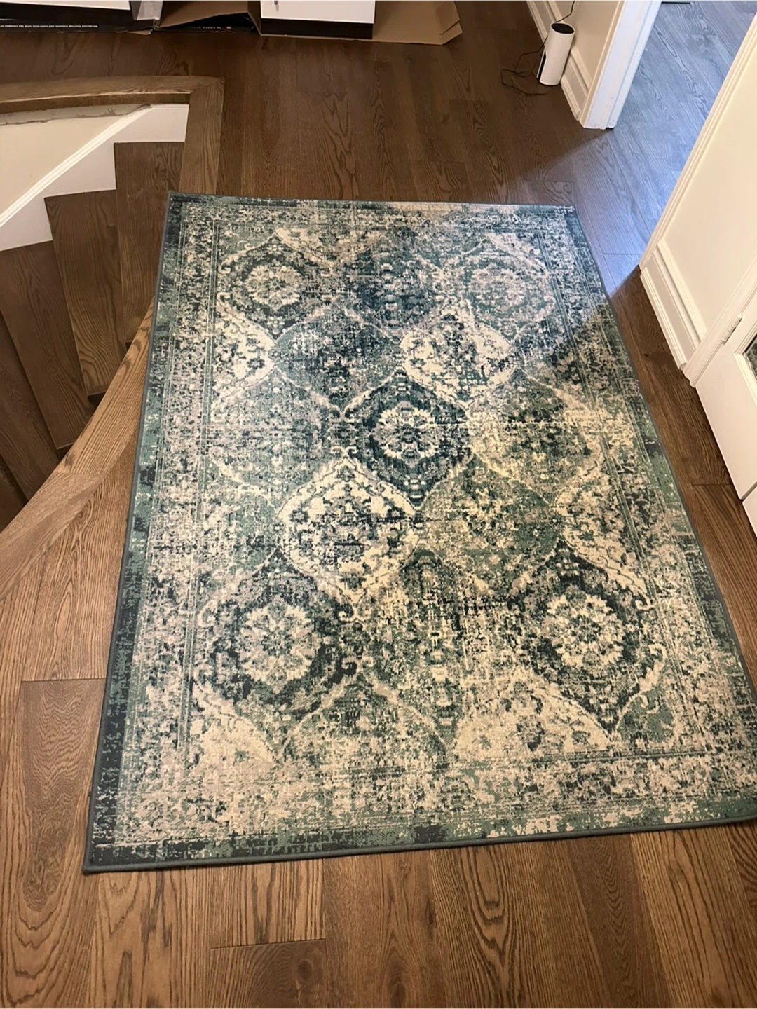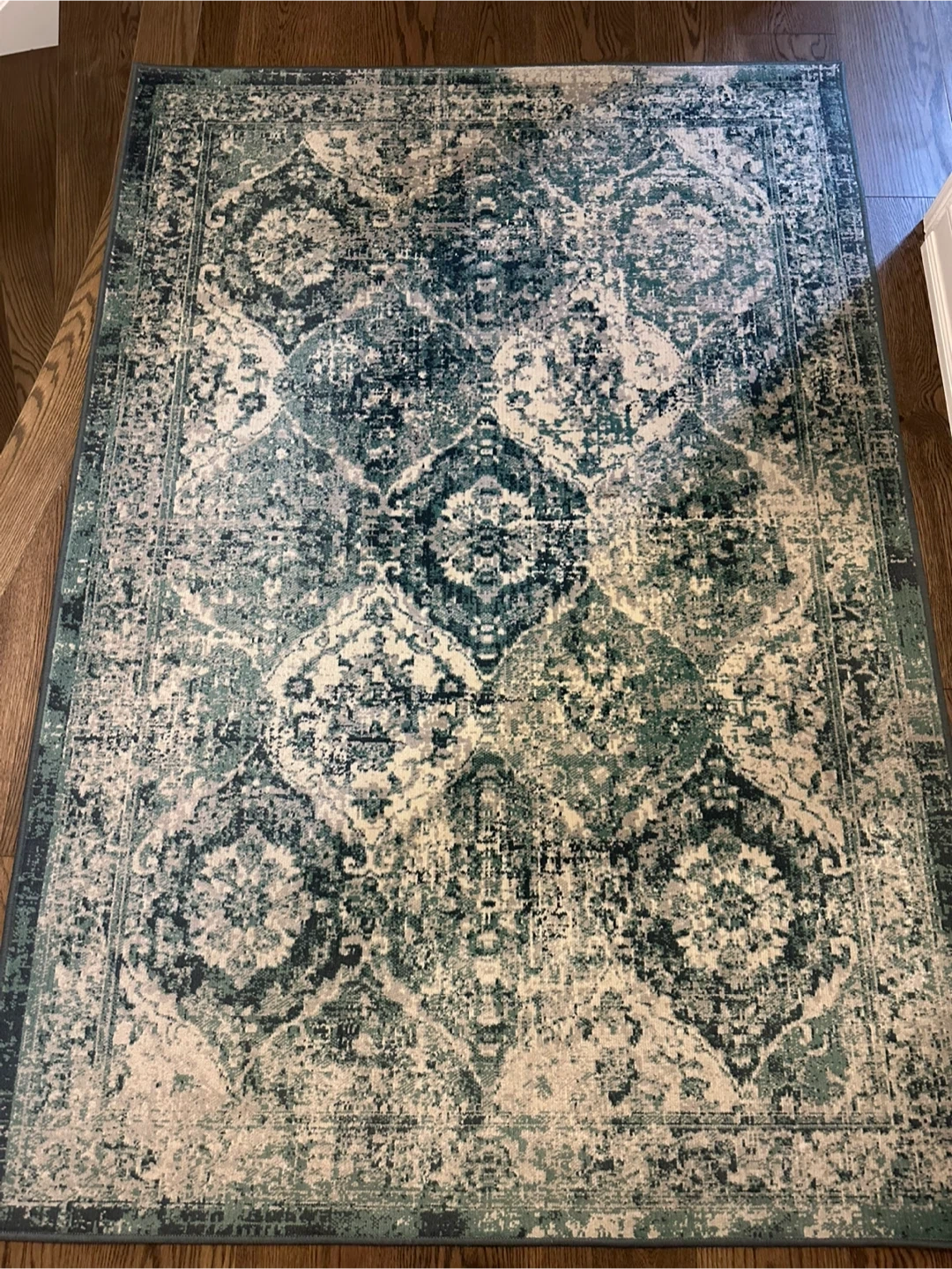 Beautiful IKEA area rug with a blue, teal, and green distressed pattern. Adds warmth and character to any living room, bedroom, or office.