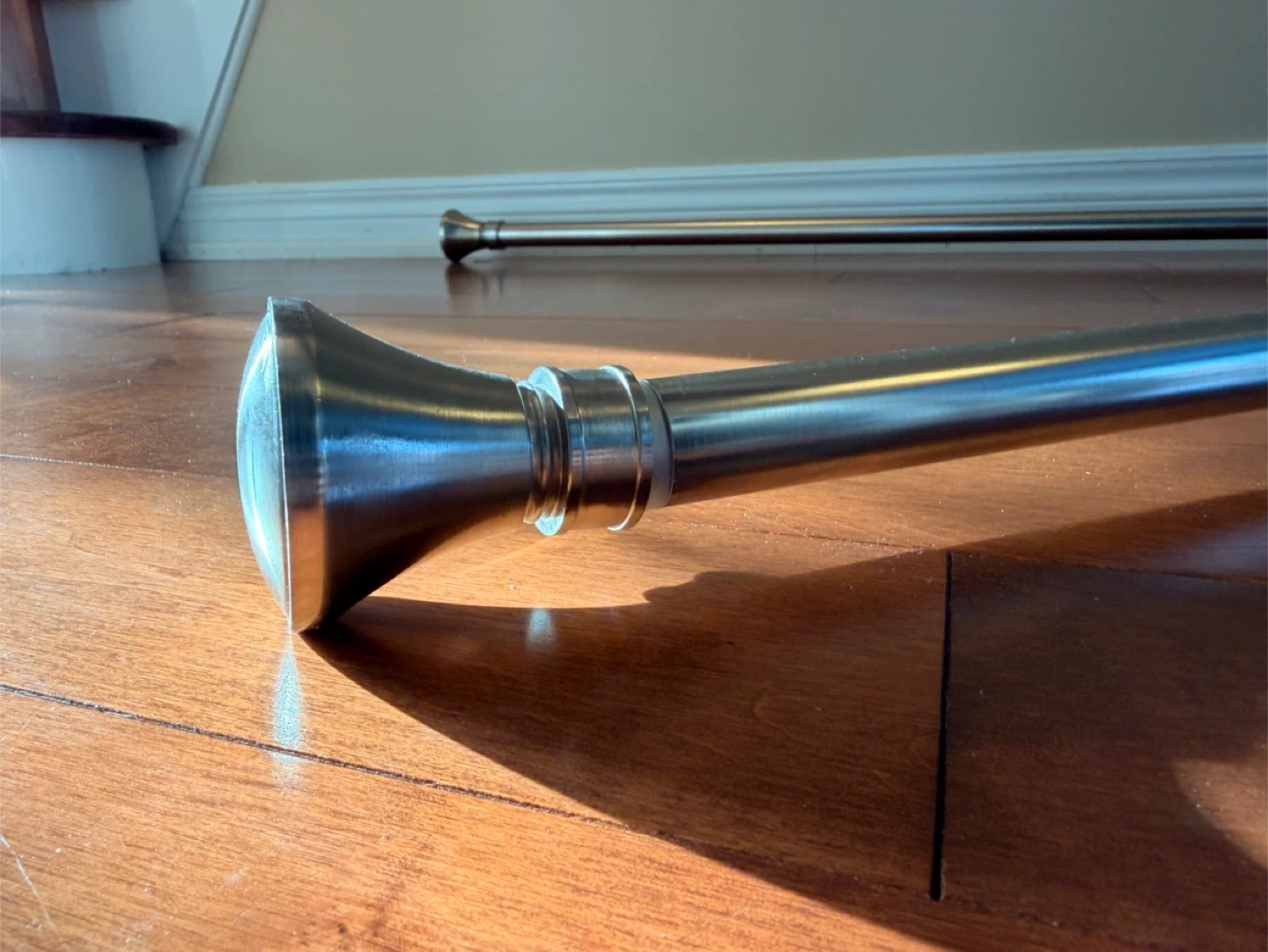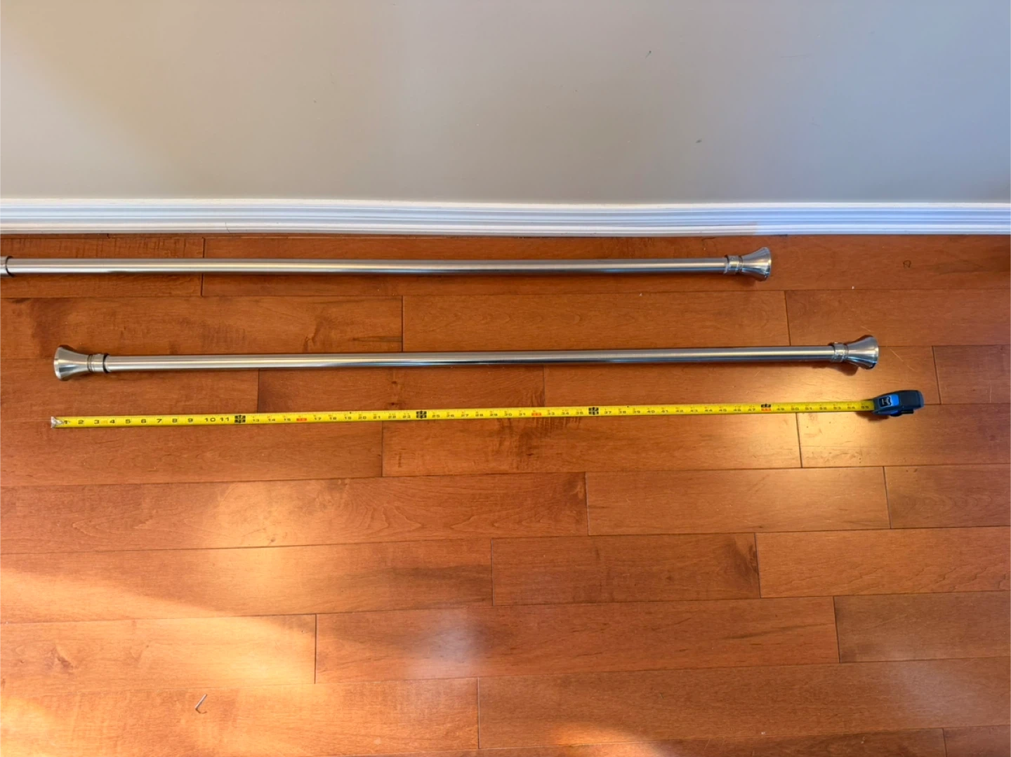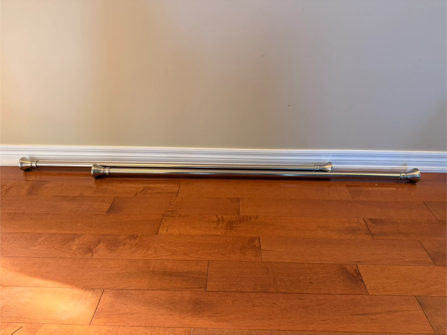 Selling a two adjustable curtain rods. They're in good condition and ready to hang your favourite curtains. The rod measures approximately 100 inches when fully extended, and is about 55 at its shortest. Perfect for adding a touch of elegance to any room!