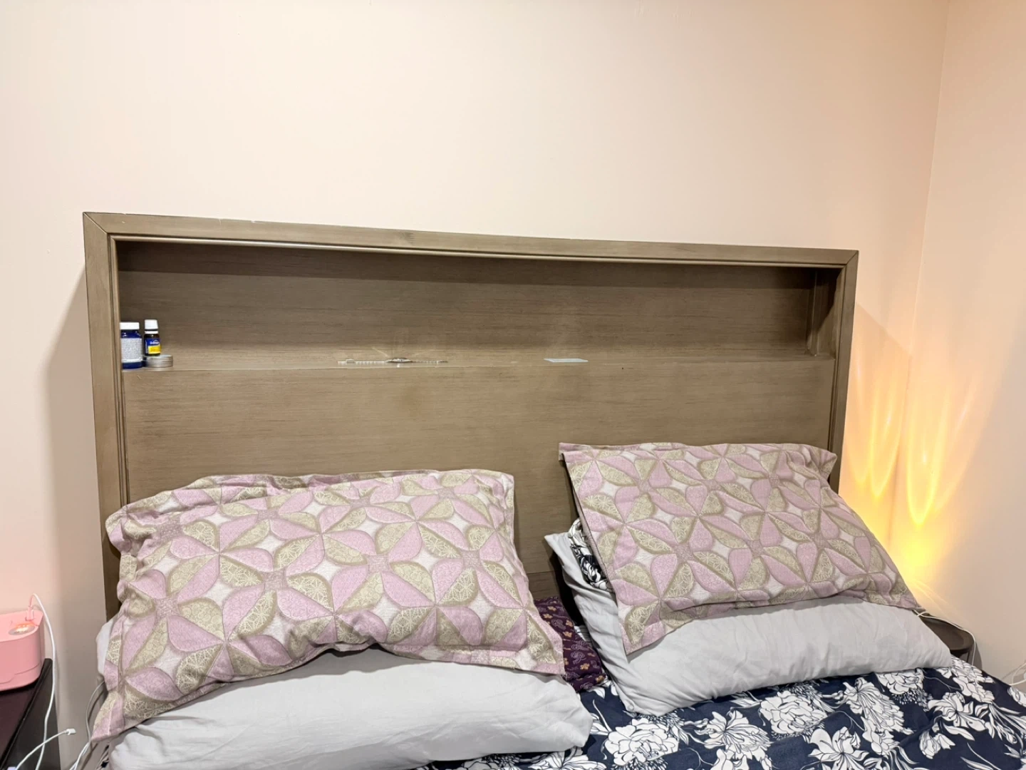 Selling a queen size bed with a headboard. It's in good condition and ready for a new home. The bed features a stylish headboard with built-in storage, perfect for keeping your nighttime essentials close at hand. The bed frame is sturdy and provides excellent support for a comfortable night's sleep