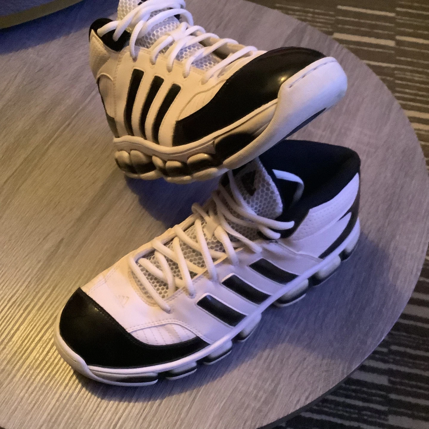 Selling a pair of Adidas basketball shoes in black and white. They're in great shape and ready for the court!
