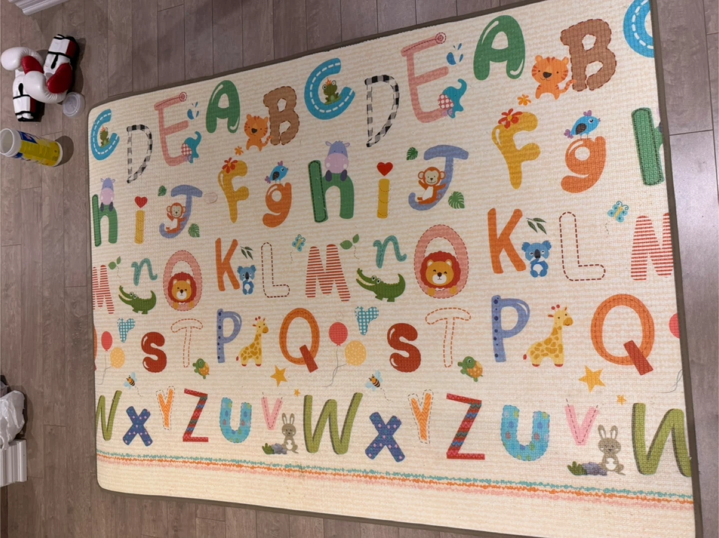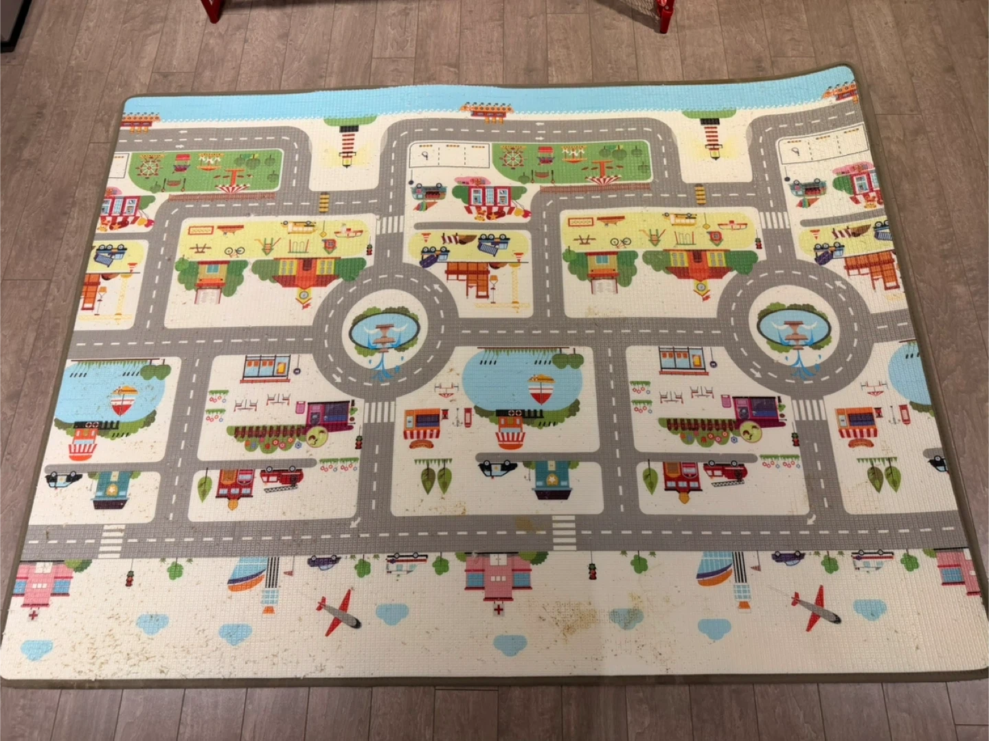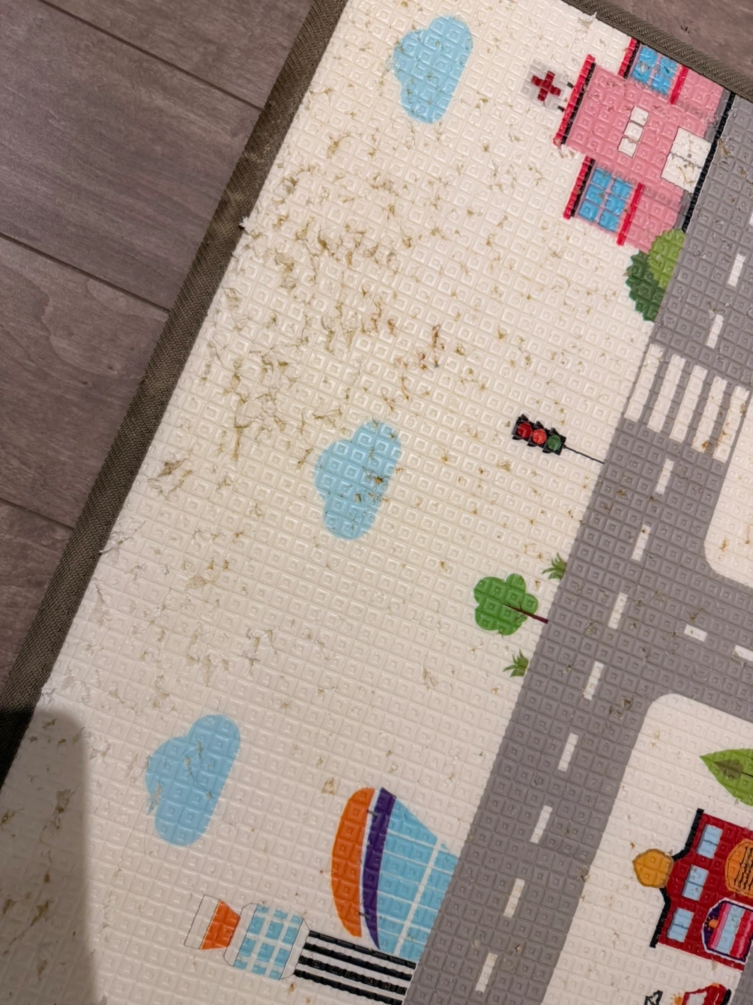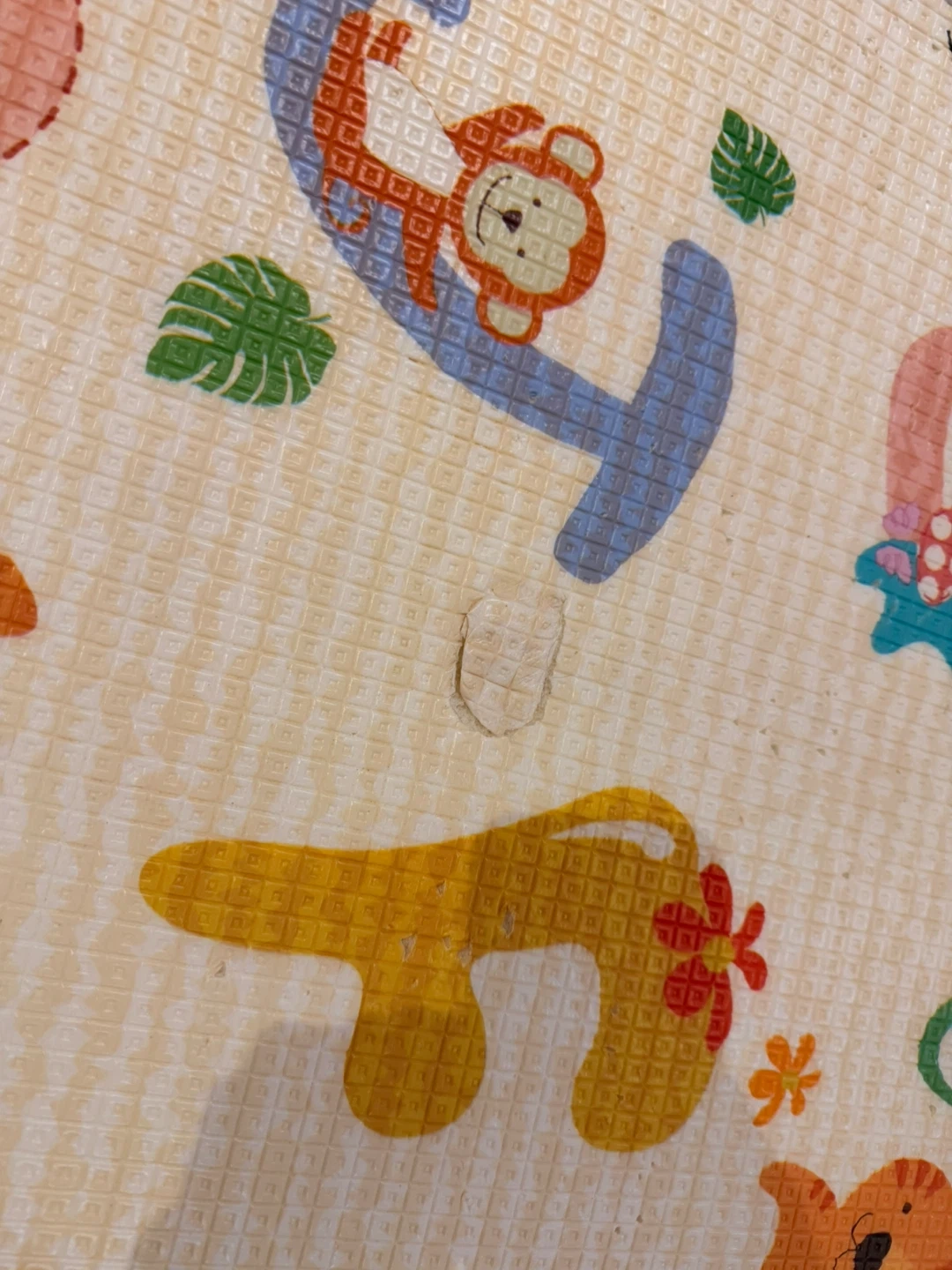 It has some wear and tear, as shown in the photos. Great for tummy time or creating a safe play area! Comes from a cat friendly home (hence all the scratches and holes). Could be good for a mat in the basement or outdoors?