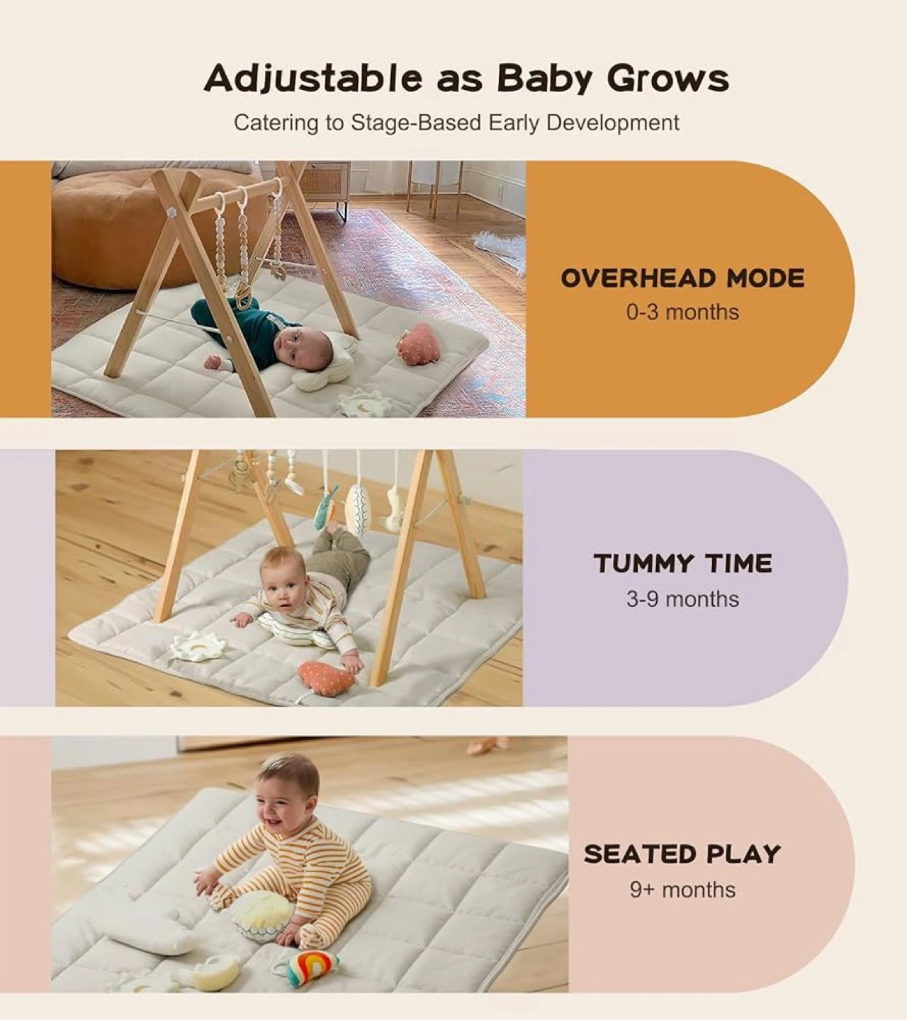 - Adjustable design that grows with your baby (overhead mode for 0-3 months, tummy time for 3-9 months, and seated play for 9+ months)