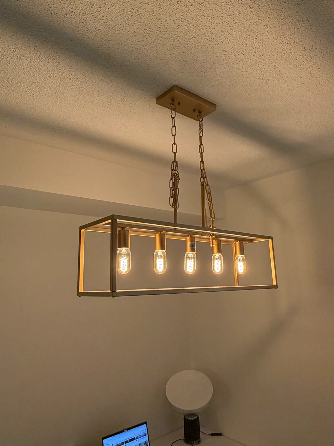 Selling a beautiful gold rectangular farmhouse chandelier! It's in great condition and would look lovely in a dining room or kitchen. It has a modern farmhouse aesthetic that adds a touch of elegance to any space. The rectangular design and gold finish make it a stylish lighting fixture. The chain extends further down but we just tied it up out of the way while moving.