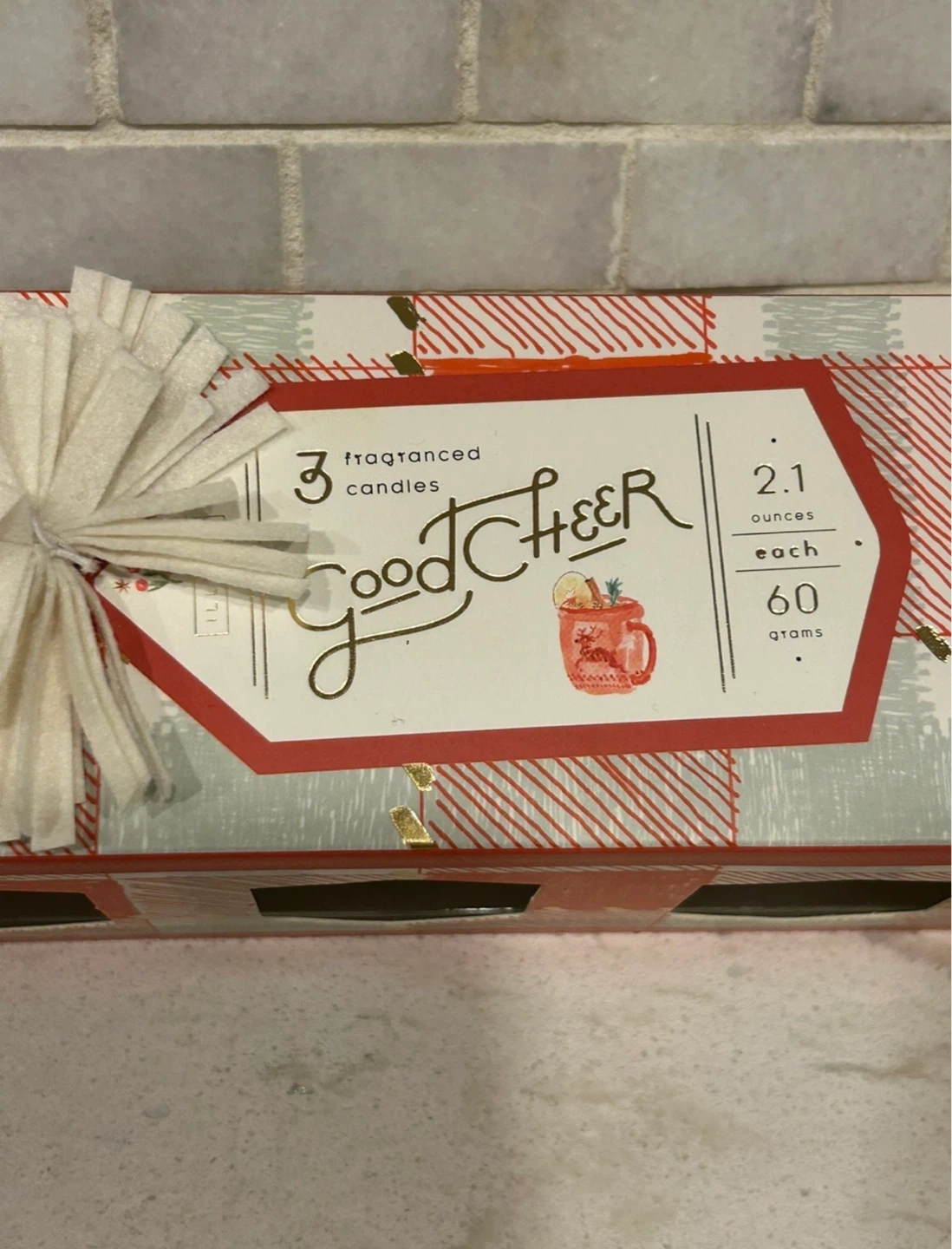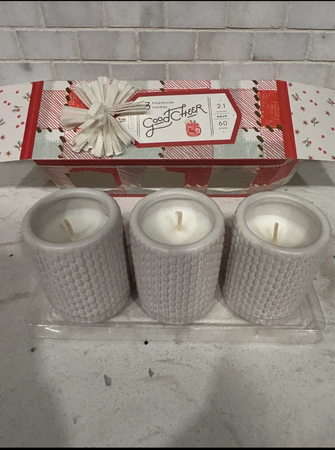 1 / 41 / 4Buy & SellGood Cheer Scented Candle Set - Three 2.1 oz CandlesGood Cheer Scented Candle Set - Three 2.1 oz Candles$15Set of three scented candles. Notes of cider, cinnamon, and clove. Grey textured containers. Holiday theme. New in box.ConditionNewWHERE TO MEETYorkdale Shopping CentreView MapSELLERverifiedYolandaYorkdale1000+156 reviews0 chats·0 favorites·10 viewsSEND CHAT TO SELLERHi Yolanda! I’m interested in your listing.Hi Yolanda! I’m interested in your listing.Get the Karrot app to chatSign In to chat