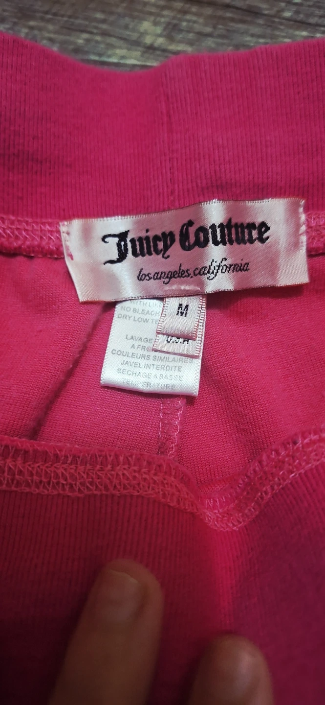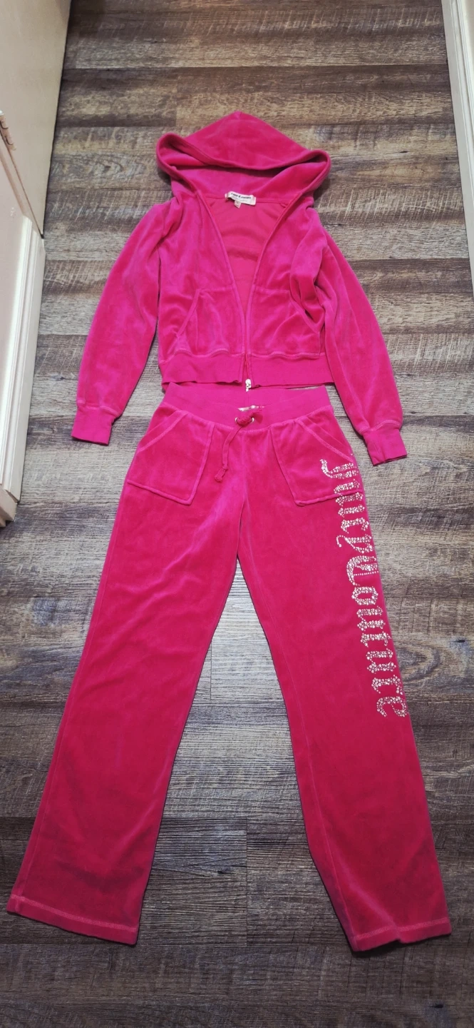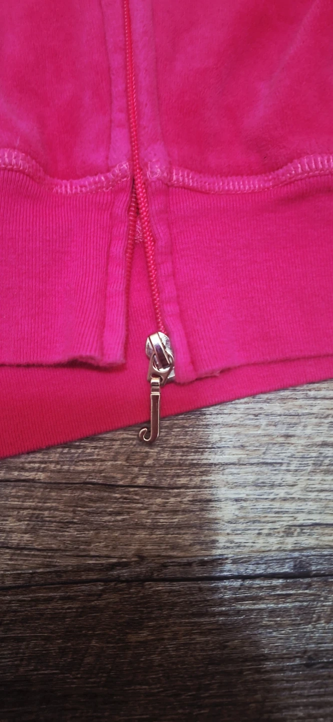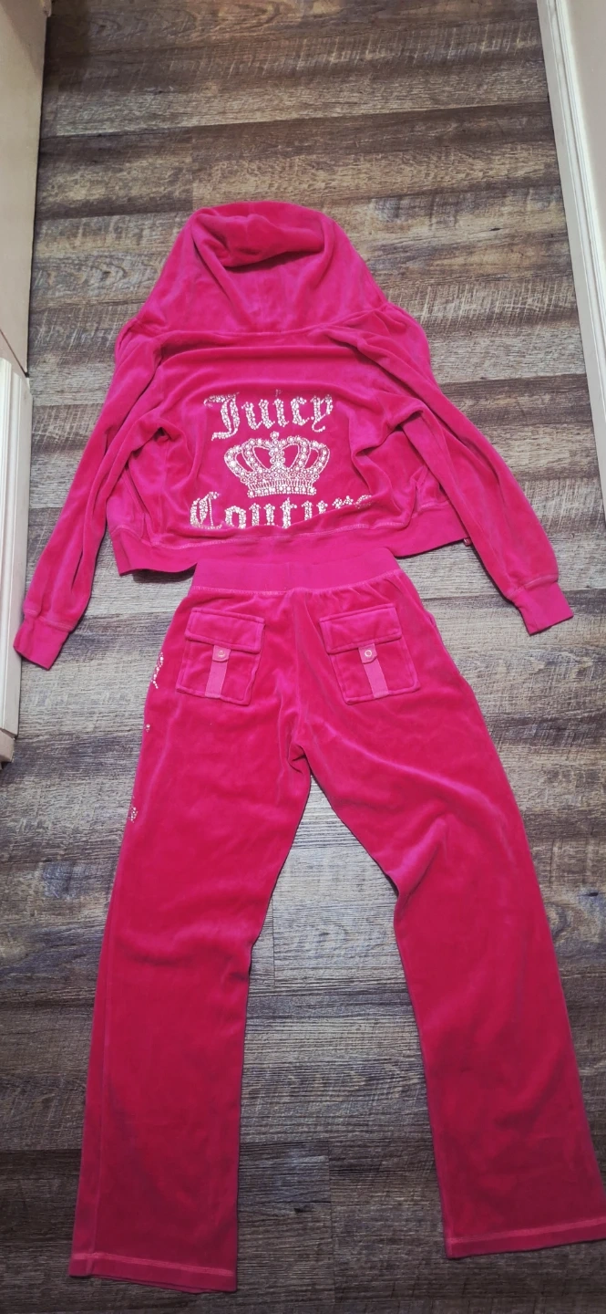 Selling a super cute vintage Juicy Couture velour tracksuit in size medium! It's a vibrant pink colour and features the Juicy Couture logo on the pants. The jacket has a hood and a zipper closure with the iconic 'J' zipper pull. Perfect for a comfy and stylish look!