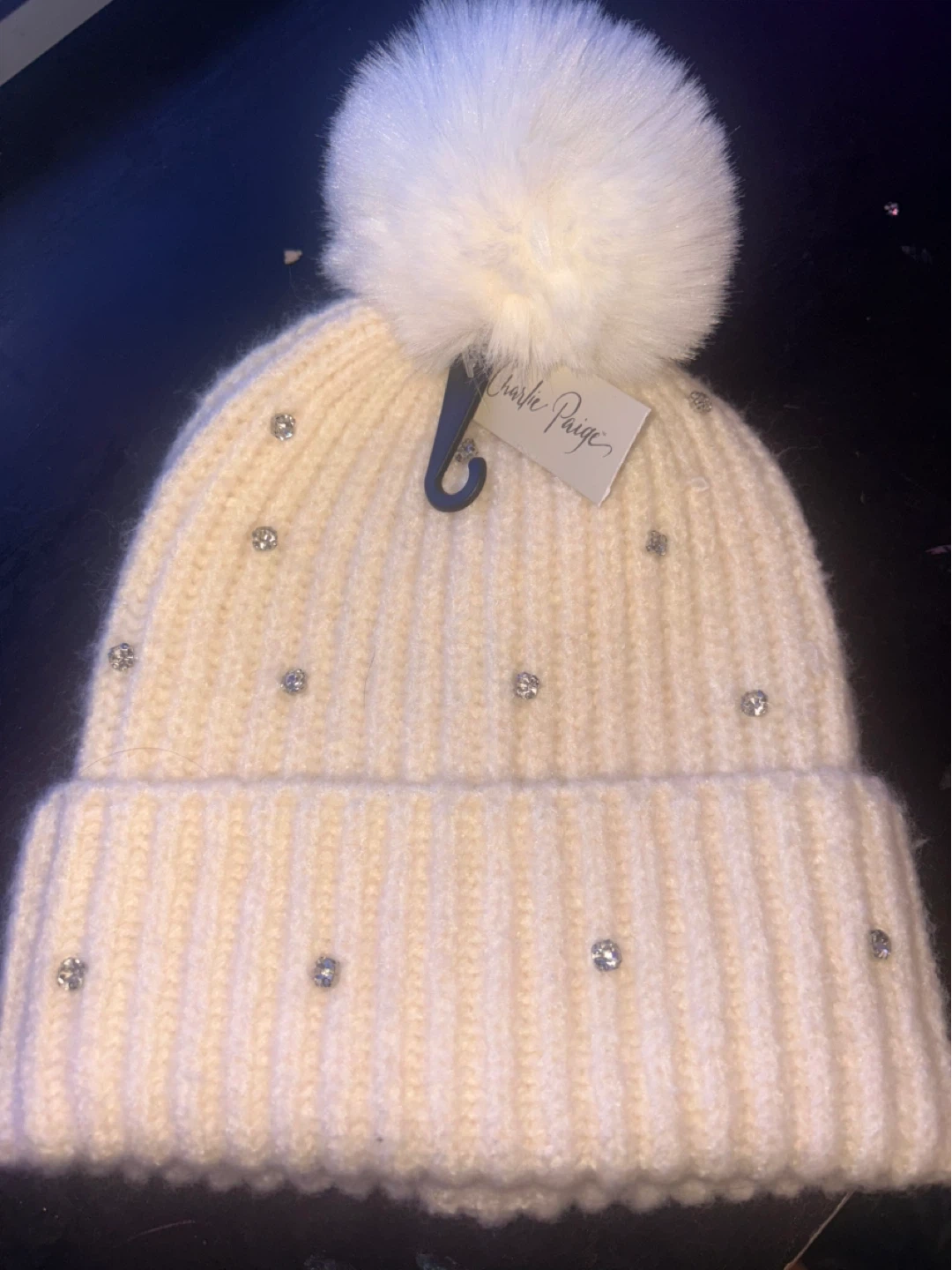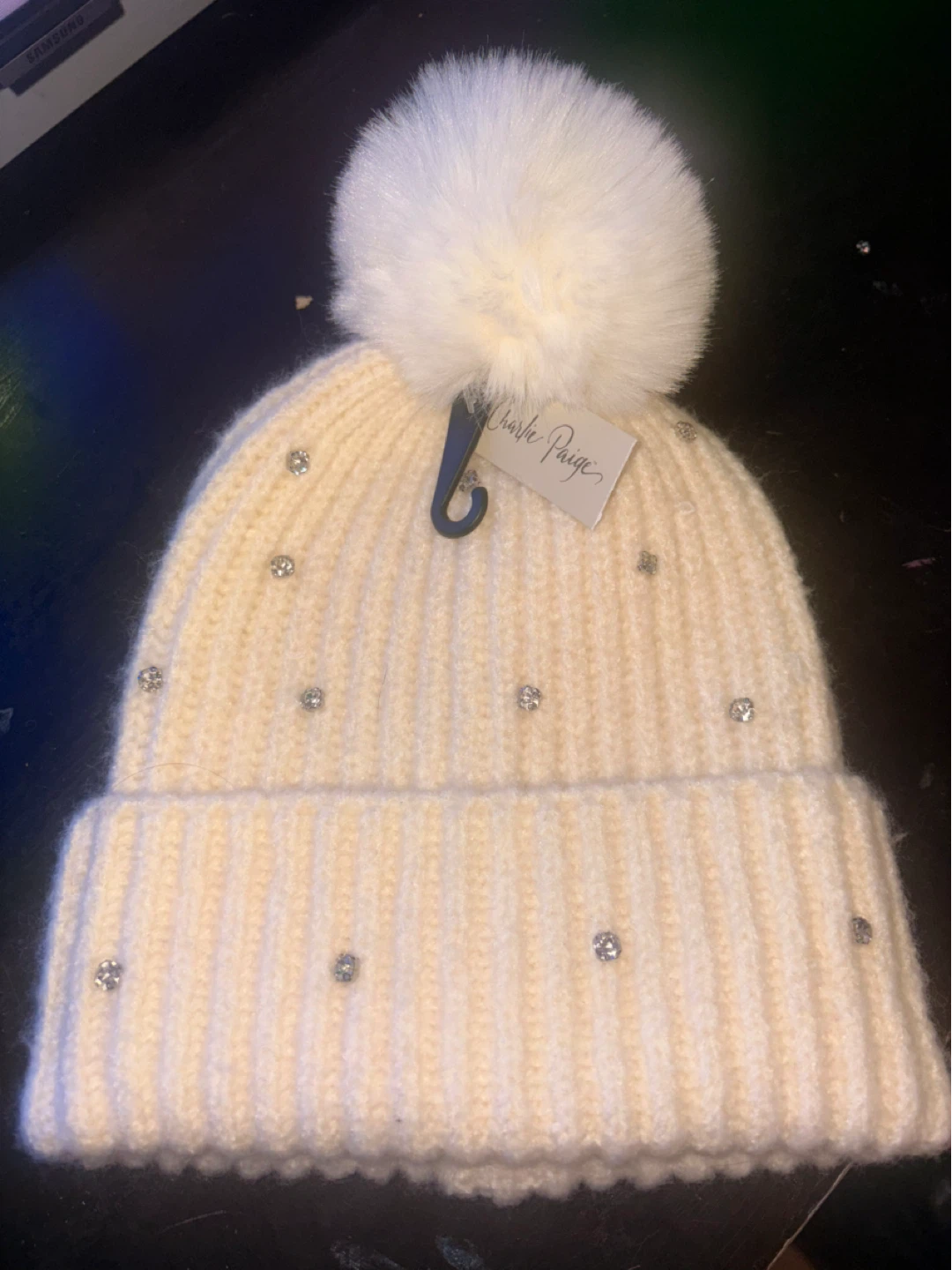 Cozy up with this adorable cream-coloured beanie from Charlie Paige! It features a fluffy pom-pom on top and is embellished with sparkling rhinestones. Perfect for adding a touch of glam to your winter wardrobe!