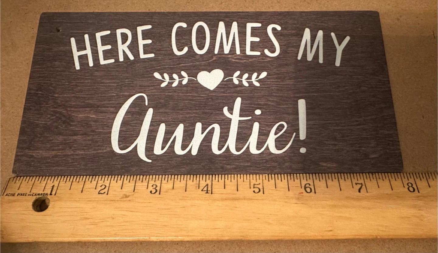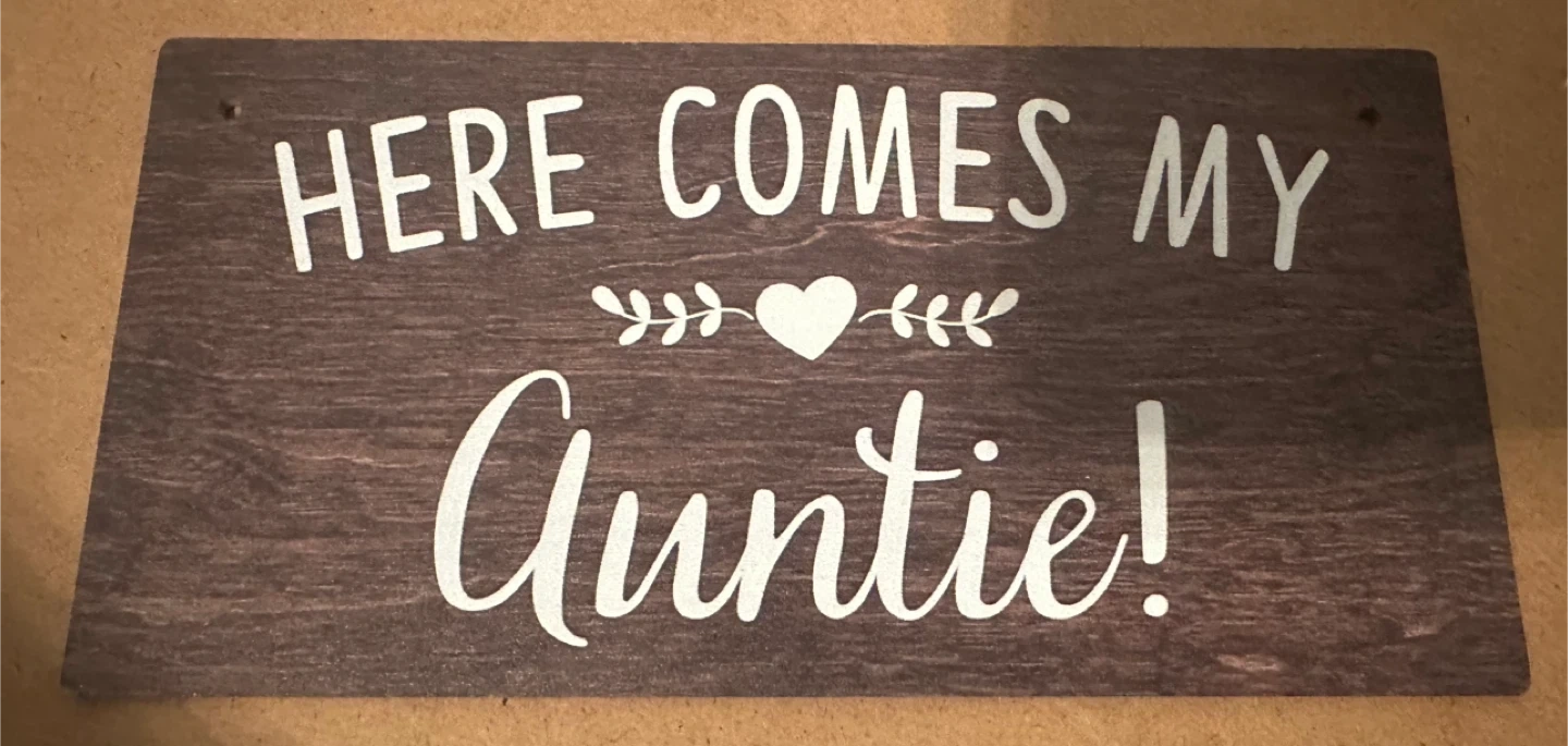 A cute wooden sign that says 'Here Comes My Auntie!' Perfect for a little one to carry at a wedding. Approx. 7.8 in wide, 3.9 in high.