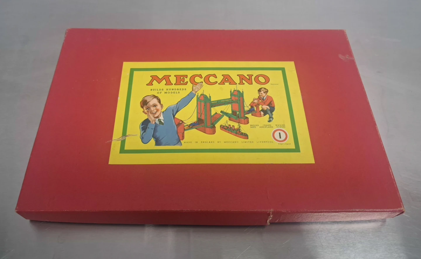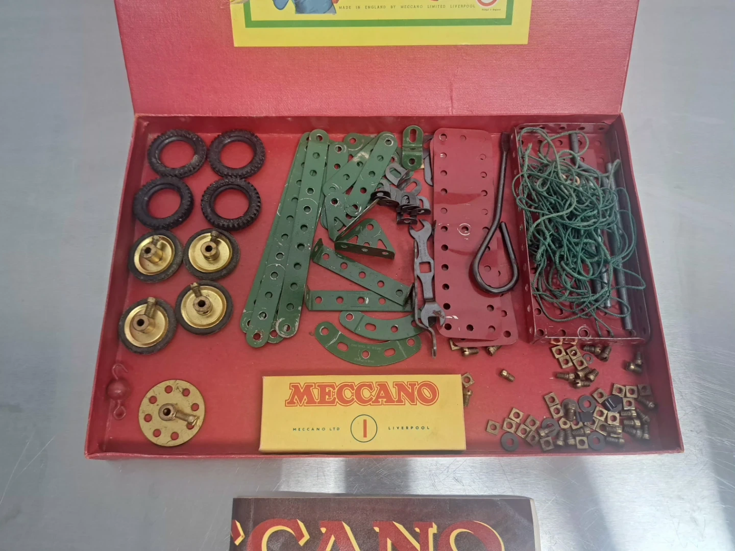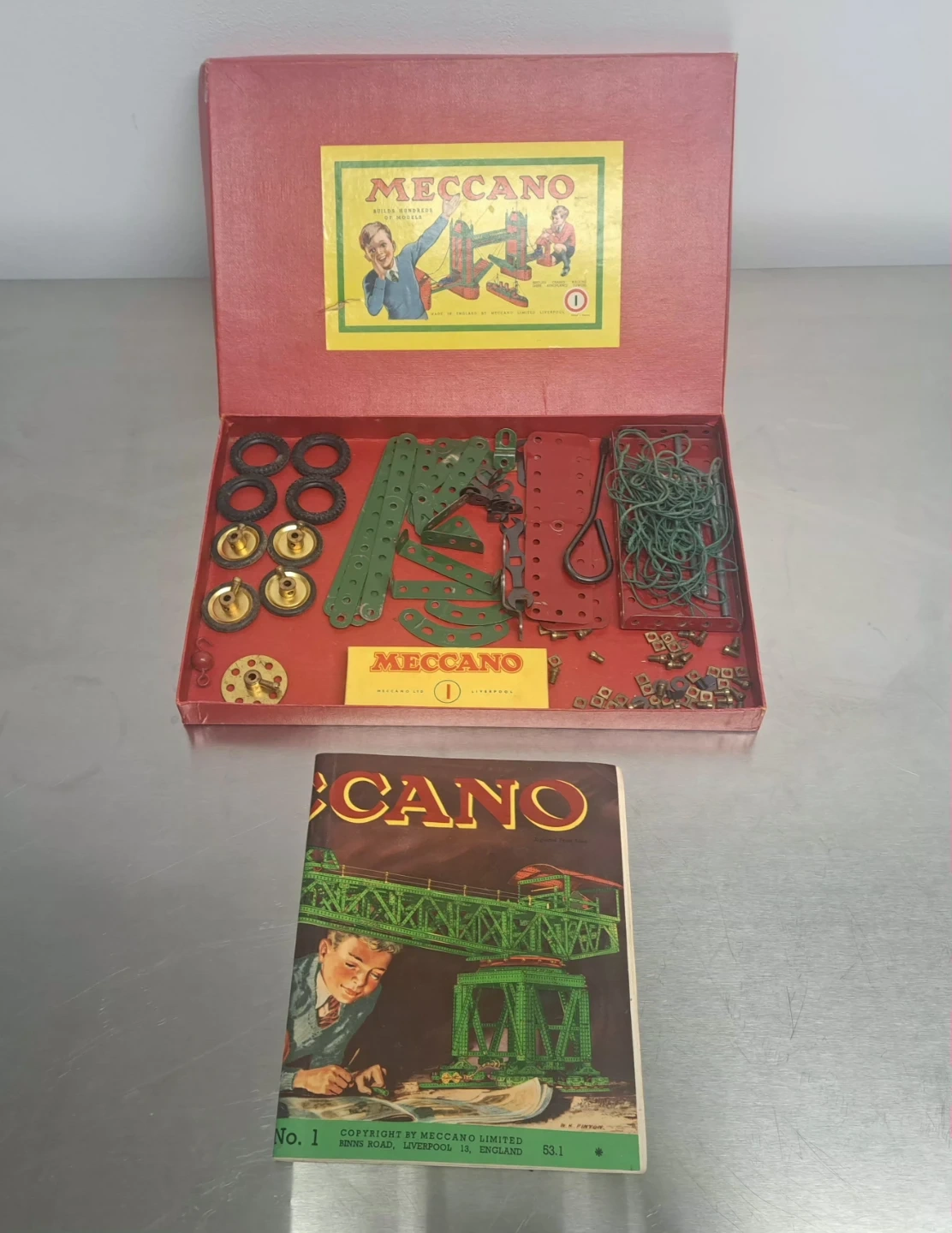 Selling a vintage 1950's Meccano Set No. 1! This classic construction set comes with its original box and manual. It includes various metal strips, gears, wheels, and other components to build different models. A great set for collectors or anyone interested in vintage toys!