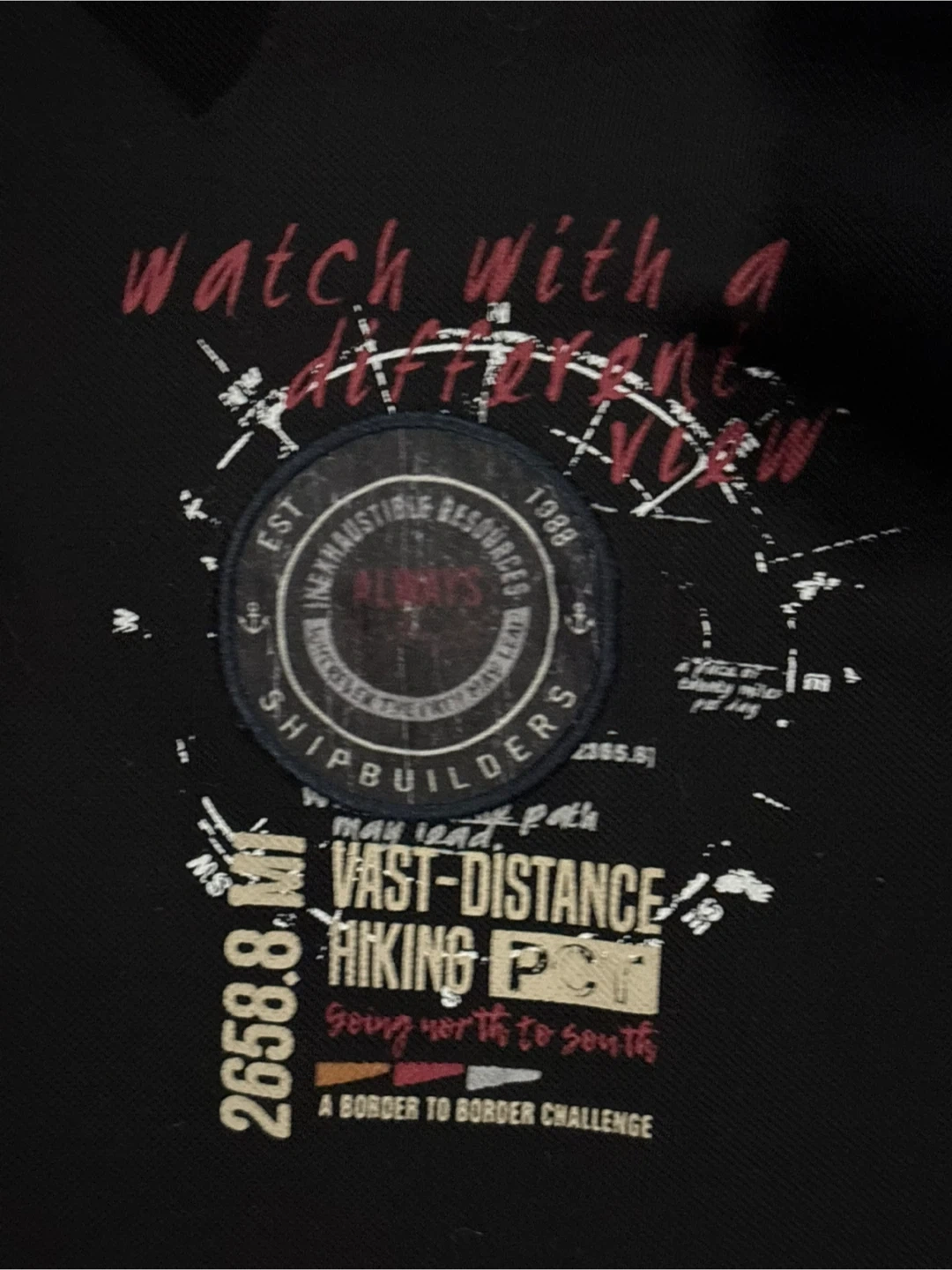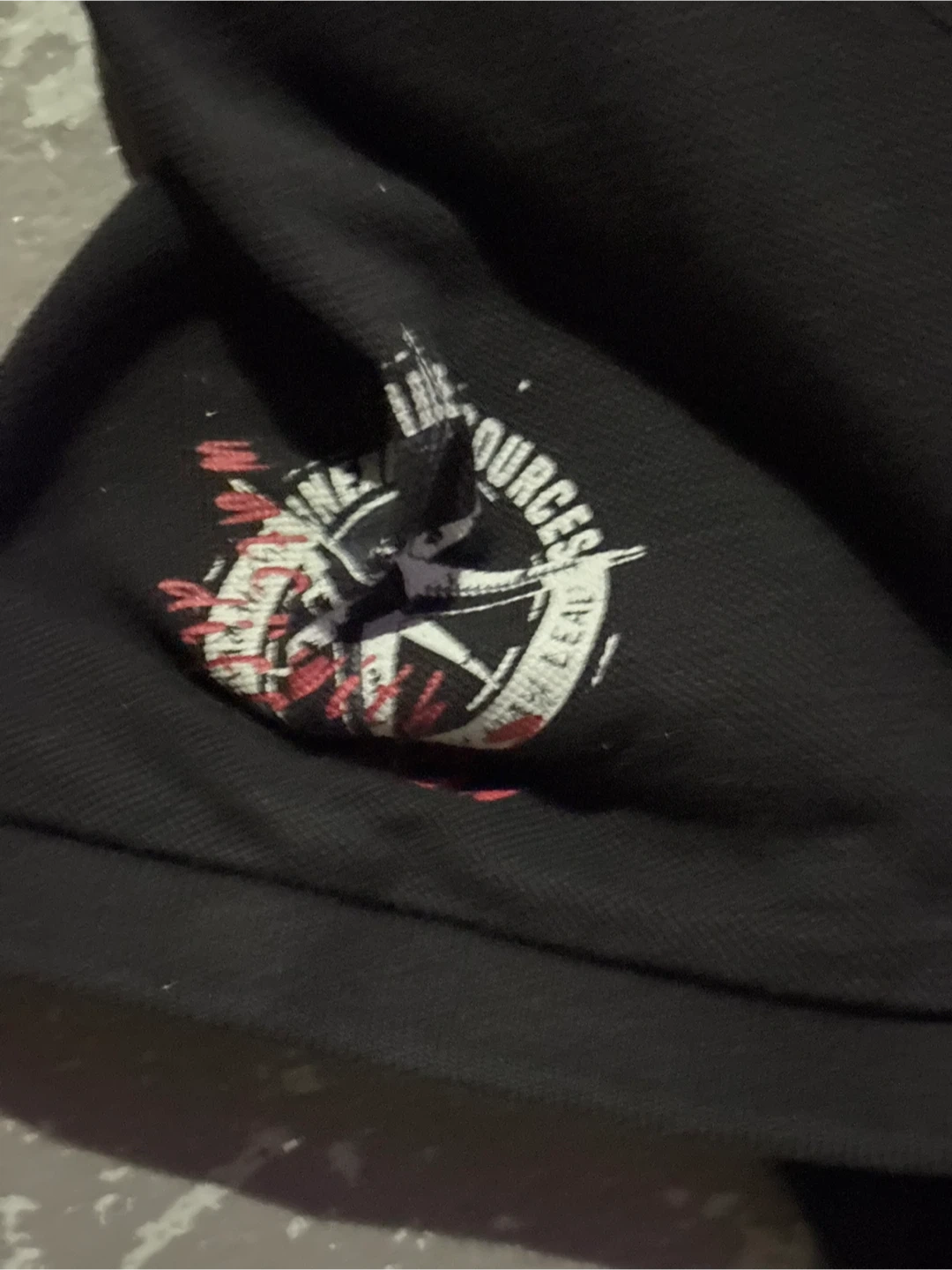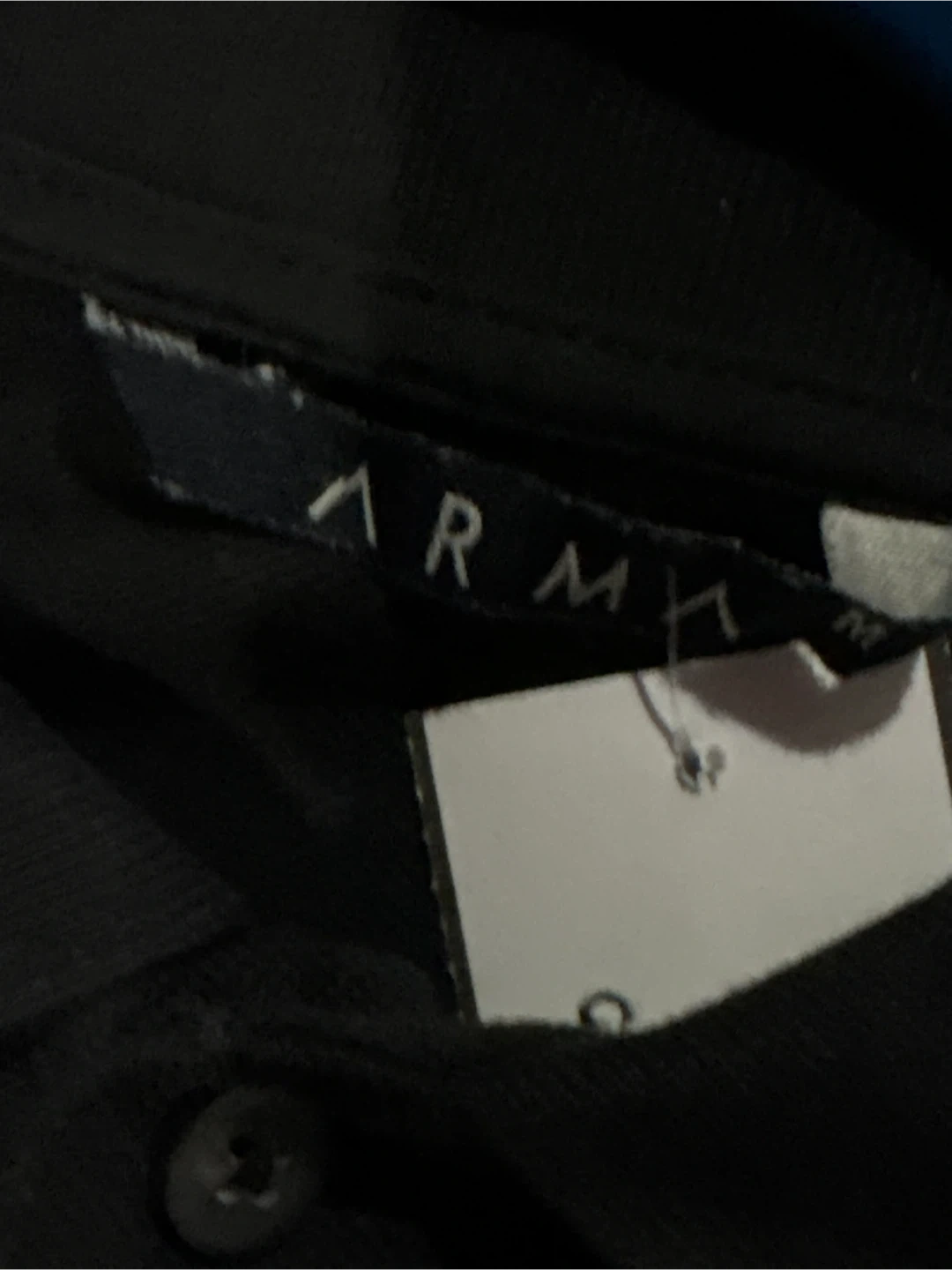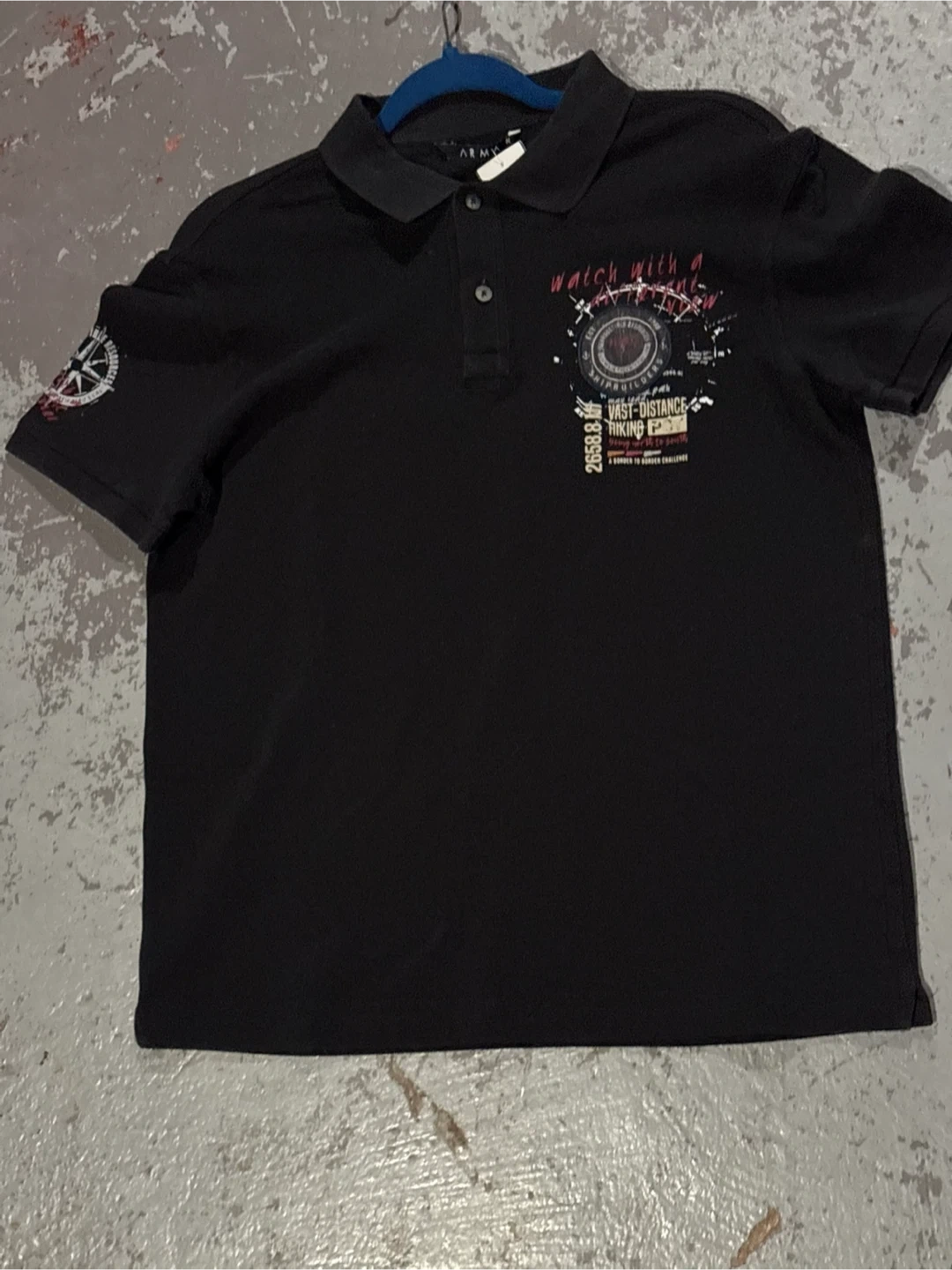 Here's a cool black Arma polo shirt in size M. It has some interesting designs on it, like a compass on the sleeve and a badge on the front. The shirt is in good condition and ready for a new owner