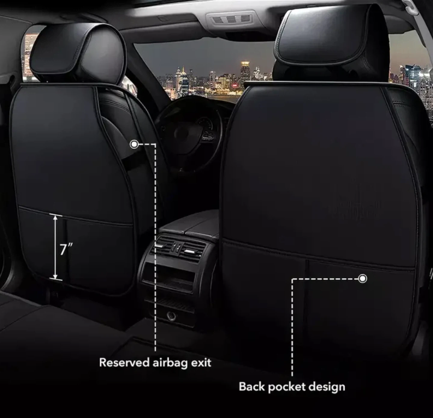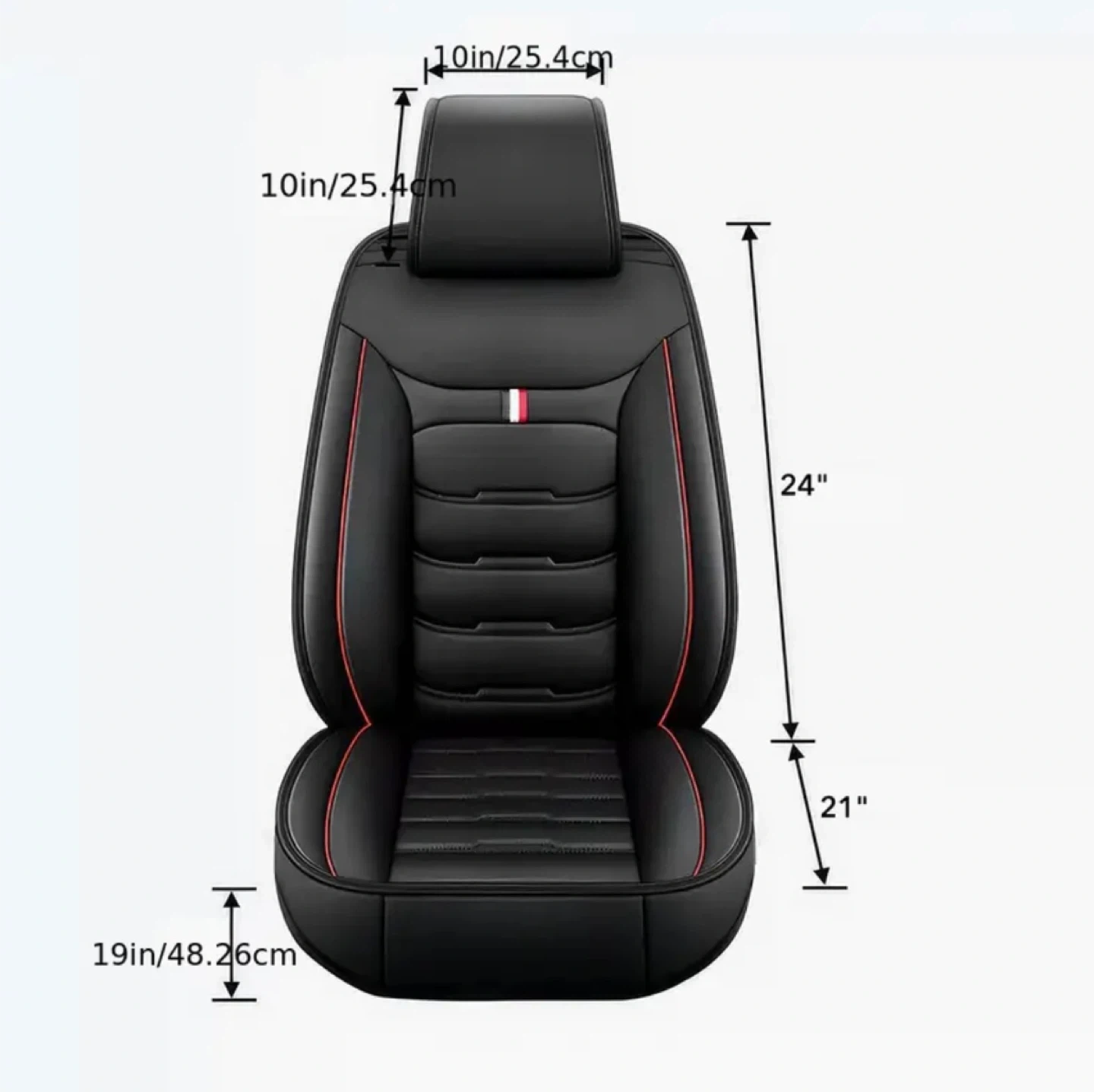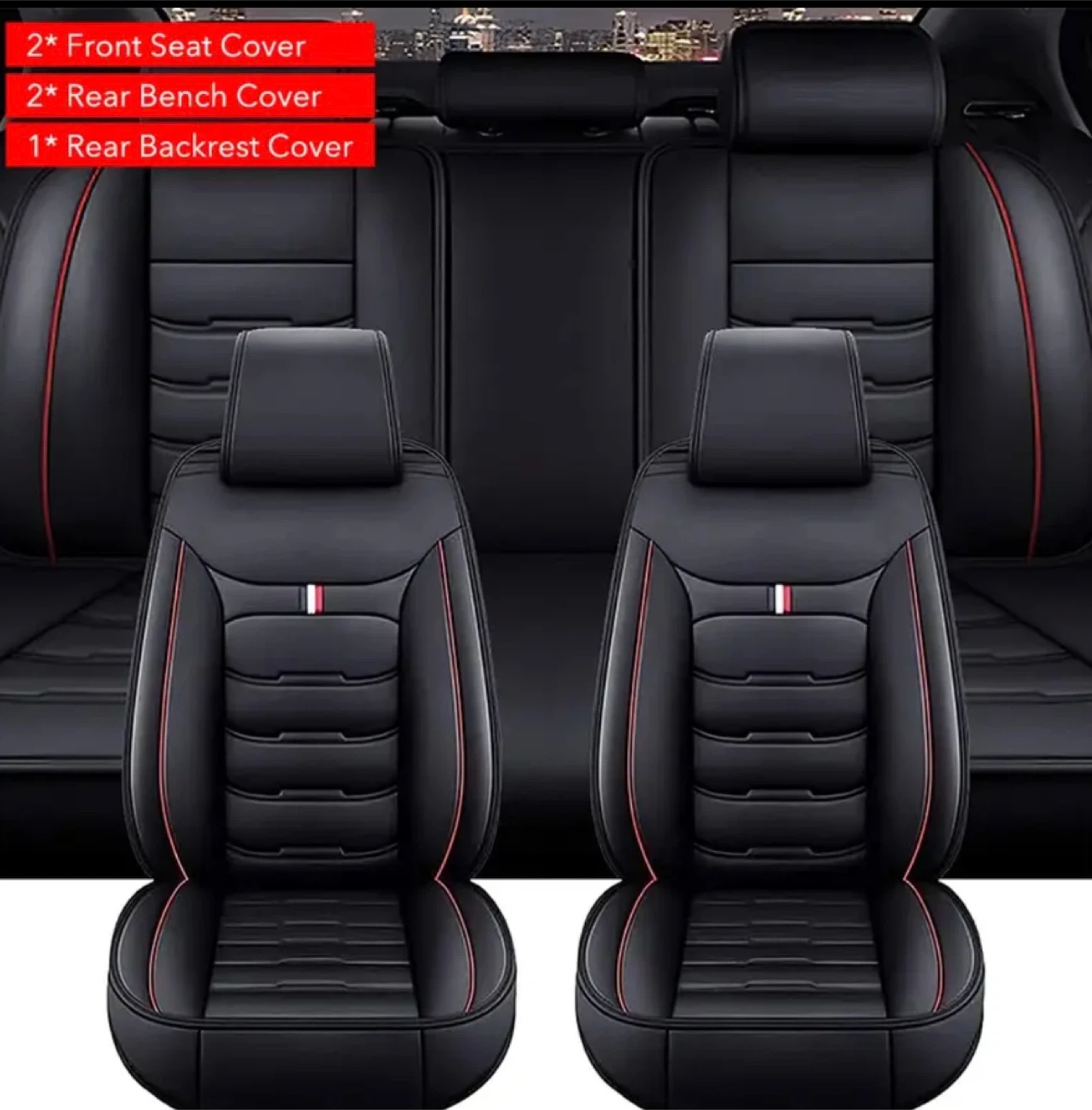 Selling a set of car seat covers in black with red trim. Includes 2 front seat covers, 2 rear bench covers, and 1 rear backrest cover. Dimensions are shown in the pictures, please take a look to see if they'll fit your car!
