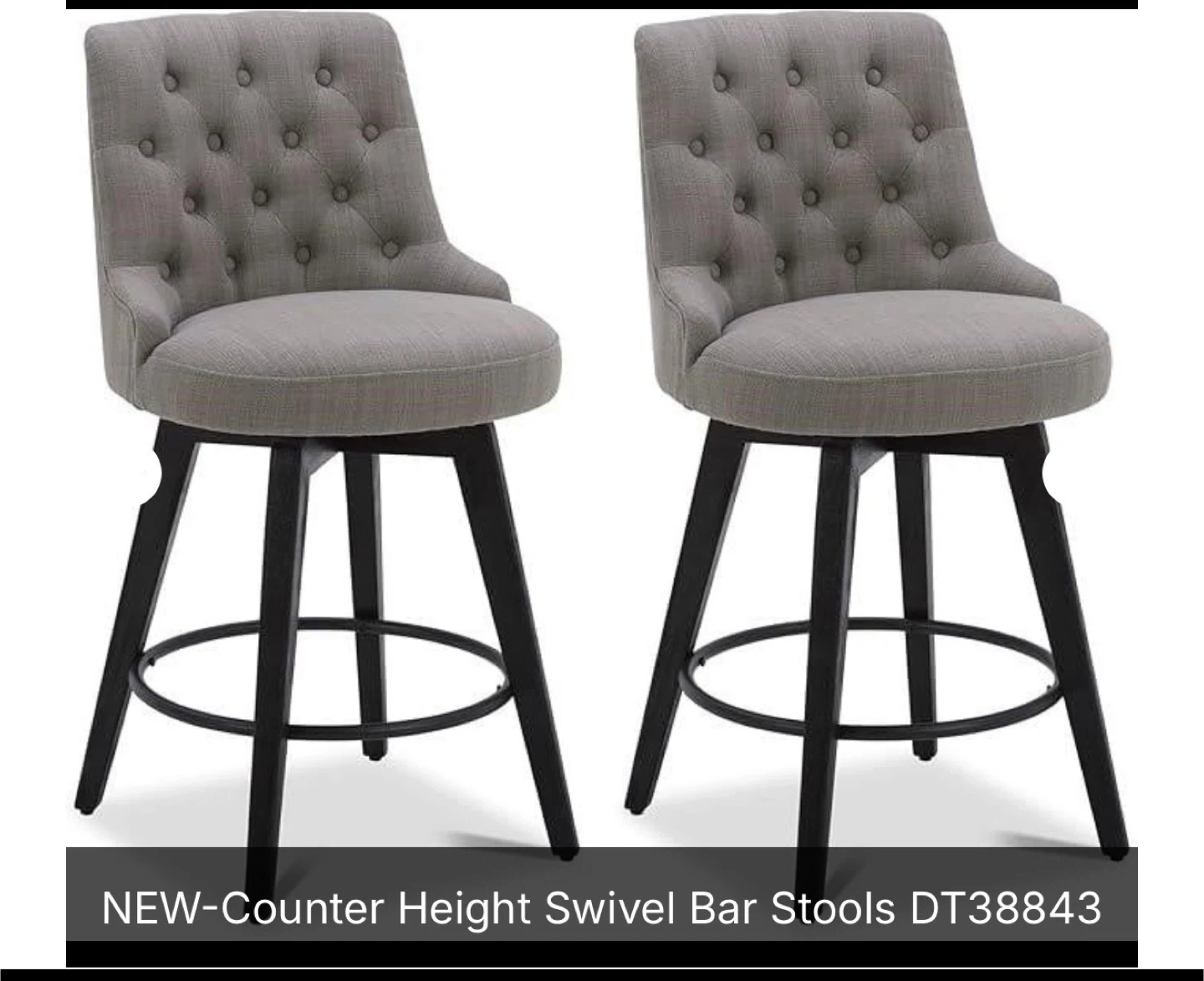 Selling a set of counter height swivel bar stools. They feature a button-tufted back and a sturdy black base. Perfect for your kitchen island or bar area!