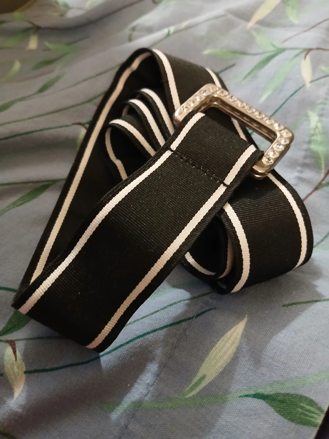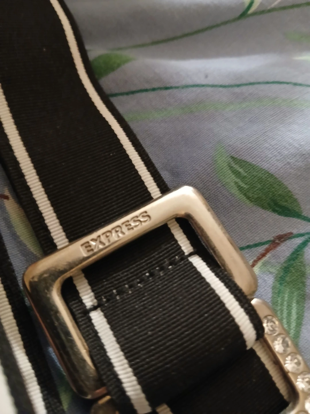Selling a cute Express belt! It's black with white stripes and has a sparkly buckle. It's in great condition and ready for a new owner