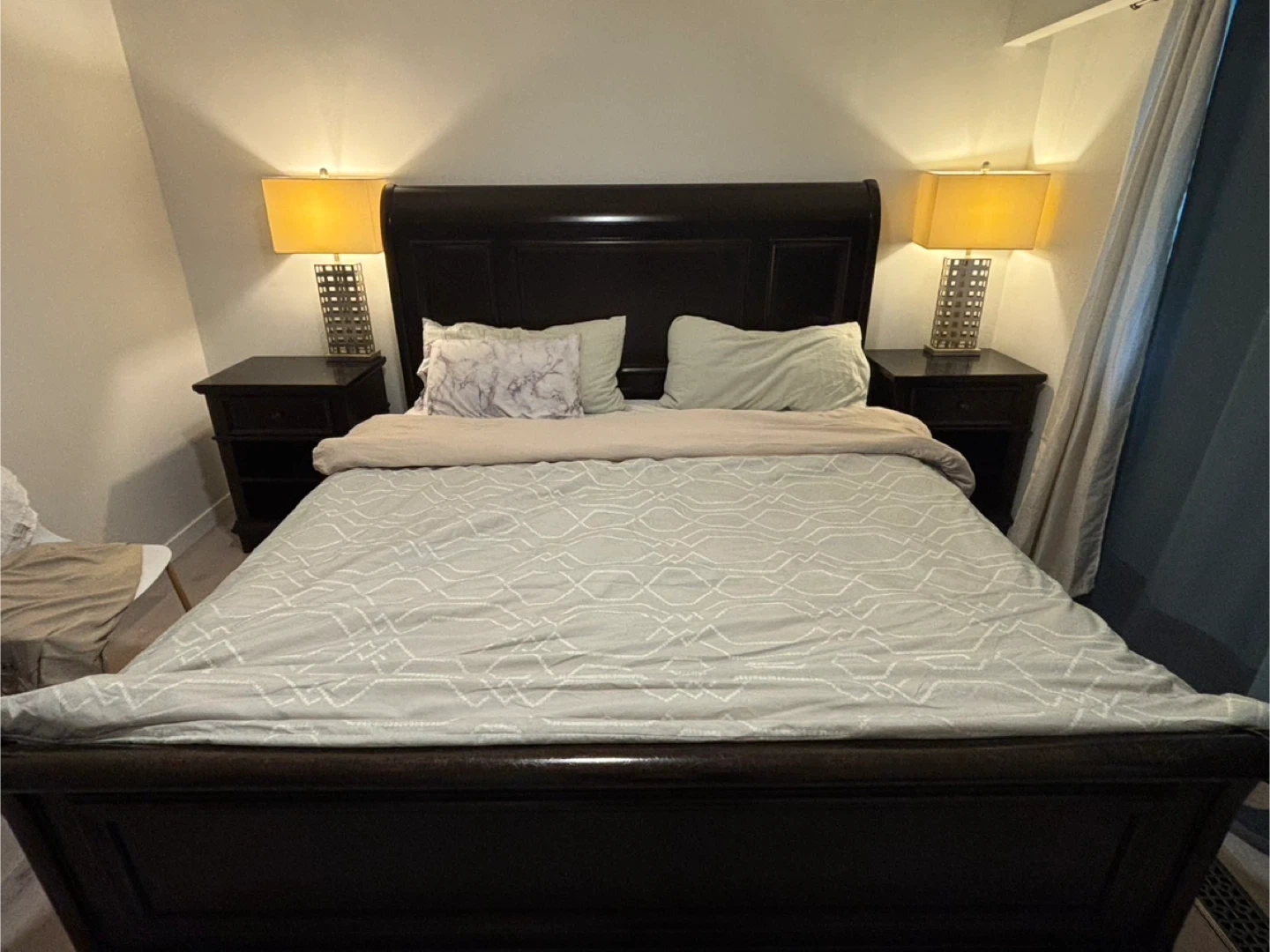The set includes one king-size bed frame and two matching nightstands. All pieces are in excellent condition and ready for a new home.