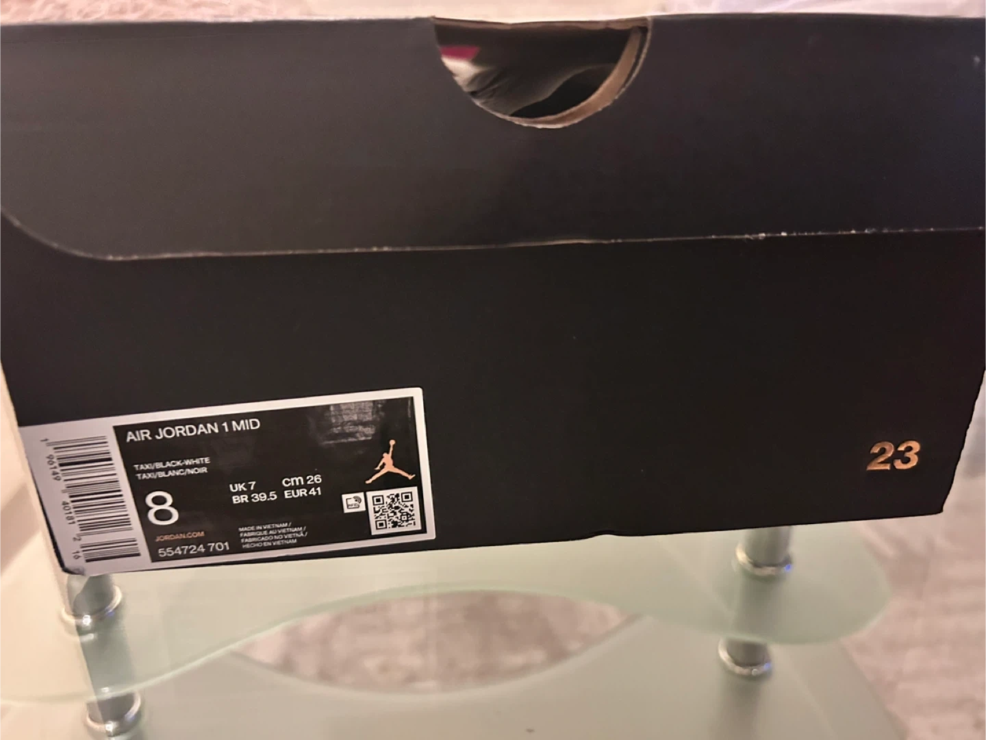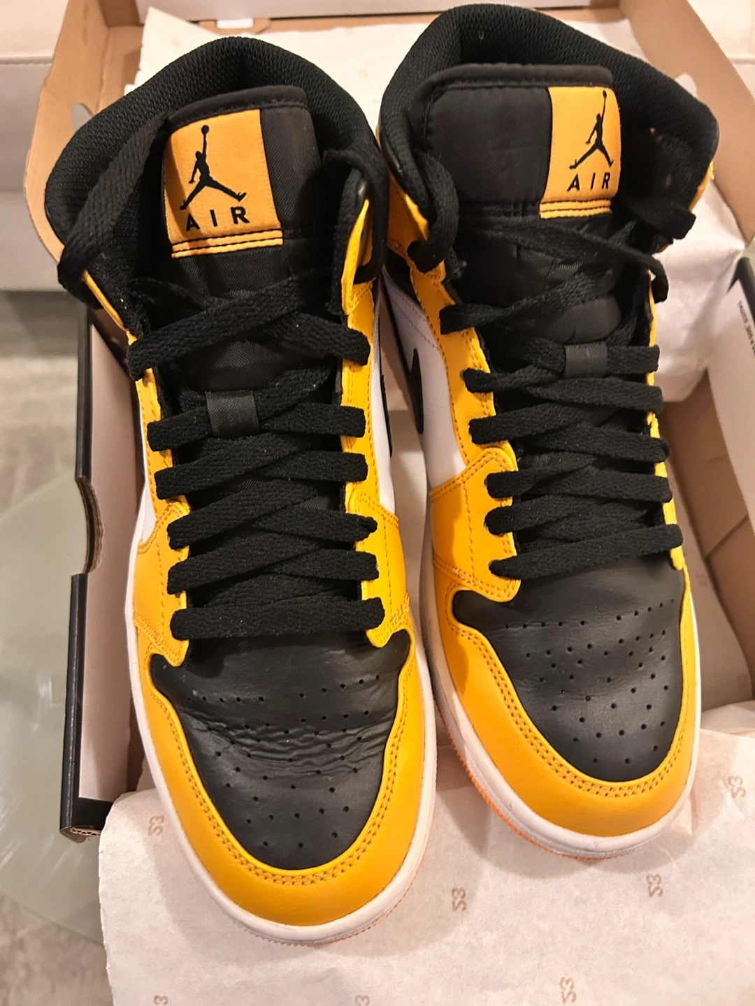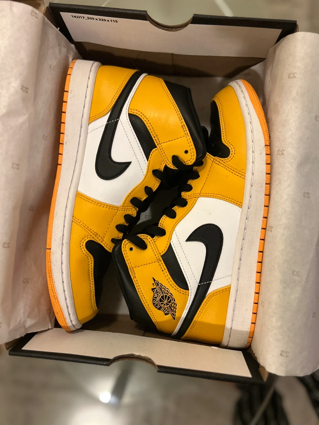 Selling a pair of Air Jordan 1 Mid sneakers in the Taxi/Black/White colourway. They are a size 8 and come with the original box. Perfect for adding a pop of colour to your fit! Gentle used .