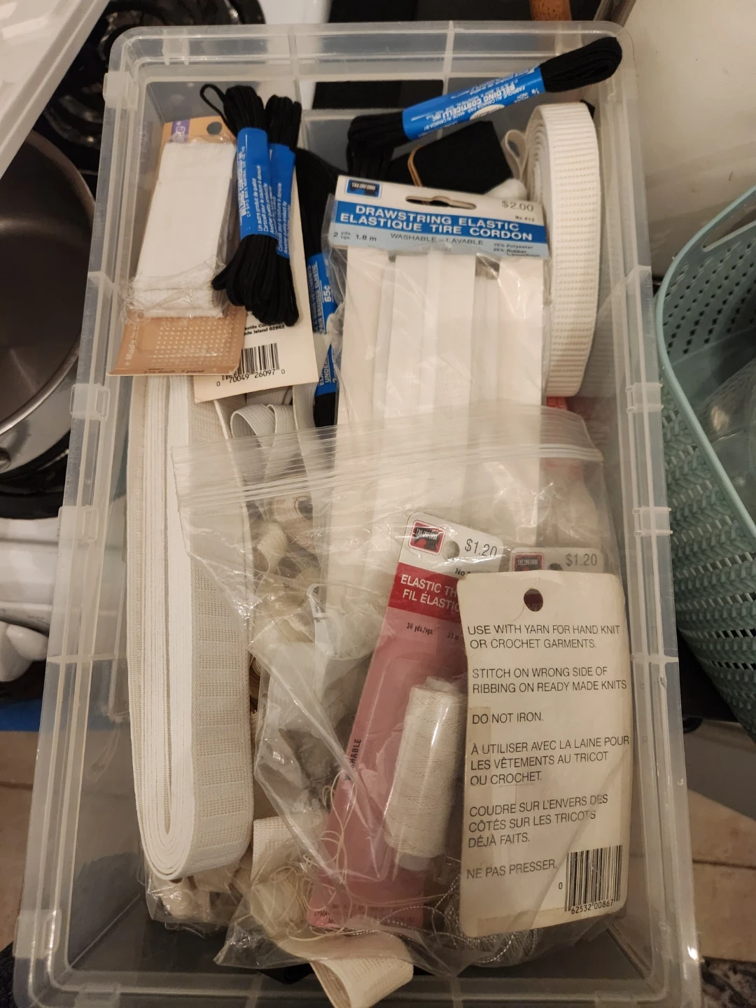 A variety of elastic bands and sewing supplies, perfect for your crafting projects! Includes drawstring elastic, elastic thread, and various widths of elastic bands. Get everything you need in one convenient lot - sewing elastic of all shapes and sizes! Smoke and bug free home. I'm keeping the storage box so pls bring a big bag to transport everything.