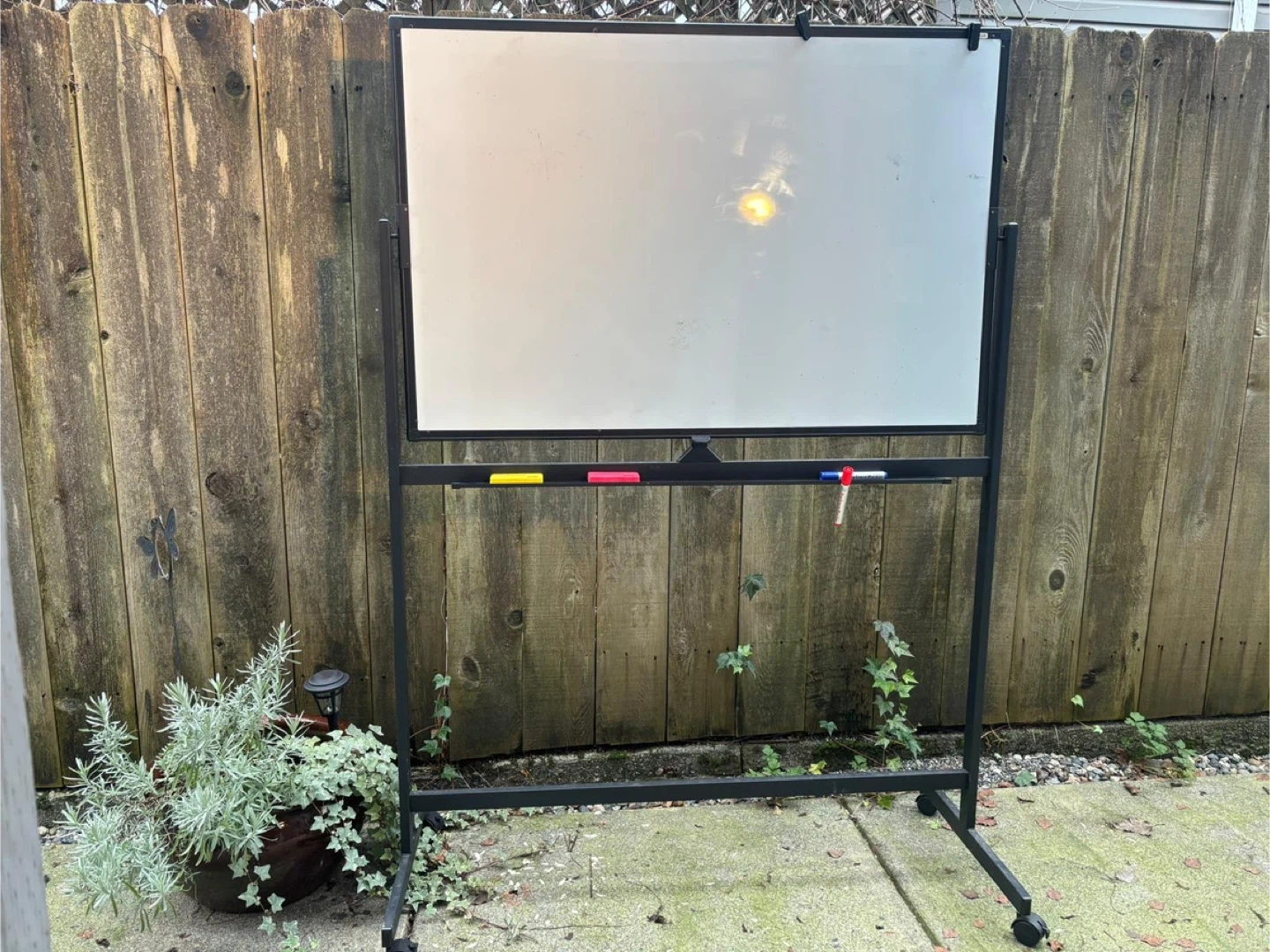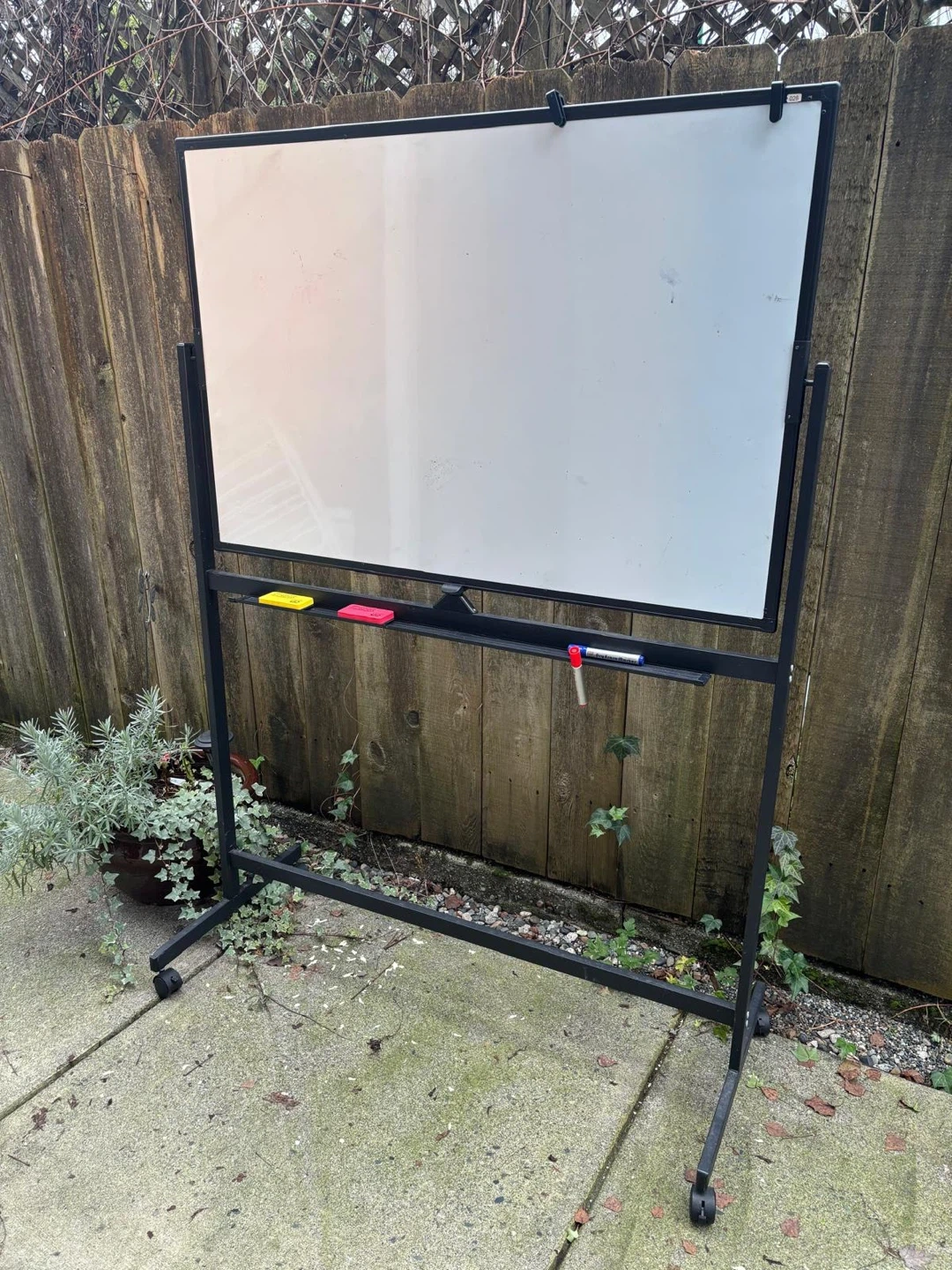 Selling a rolling whiteboard that's perfect for brainstorming or teaching! It comes with a few markers and erasers, so you're all set to start using it right away. The whiteboard is in good condition and ready for a new home in your office or study space. You can also flip it to the other side.
