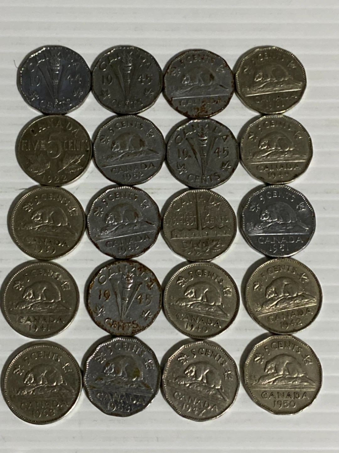Selling a collection of vintage Canadian five cent coins. These coins feature various designs and dates, including some from the 1940s and 1950s. Great for collectors or anyone interested in Canadian history!