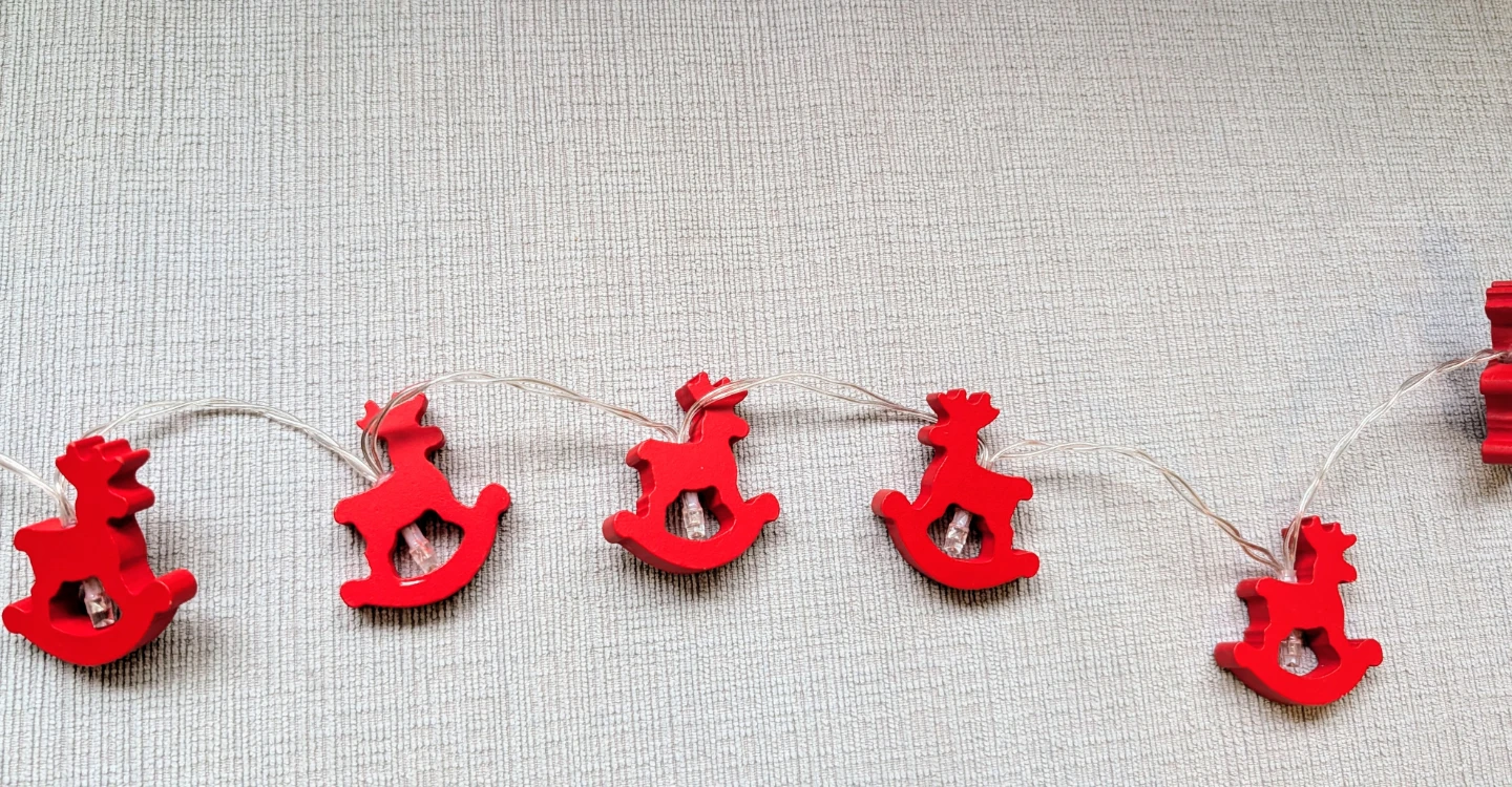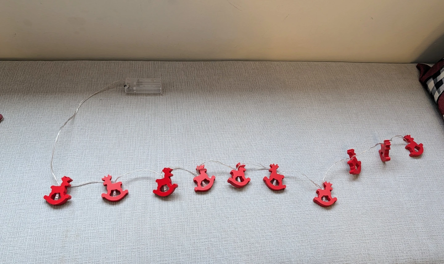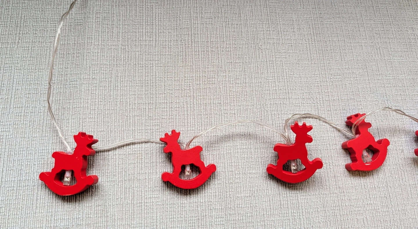 Cute red rocking horse string lights to add a festive touch to any room! They are battery operated, making them easy to place anywhere without needing a plug. They take 2 AA batteries.