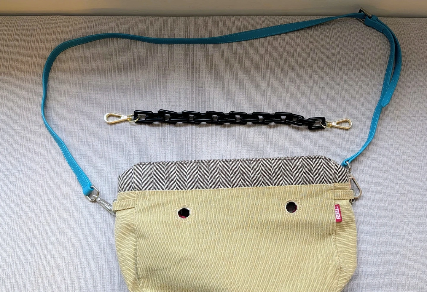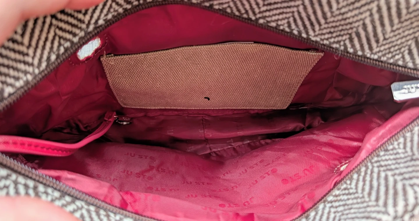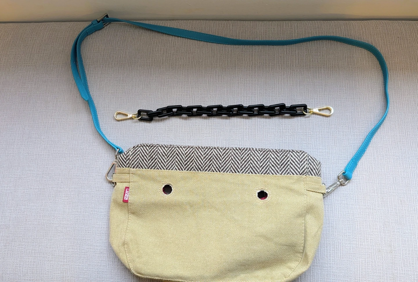 This JUSTO shoulder bag features a unique design with a herringbone pattern on top and a beige bottom. It comes with a blue shoulder strap and a black chain strap, so you can switch up the look! The interior is lined with a vibrant pink fabric and includes a convenient pocket.