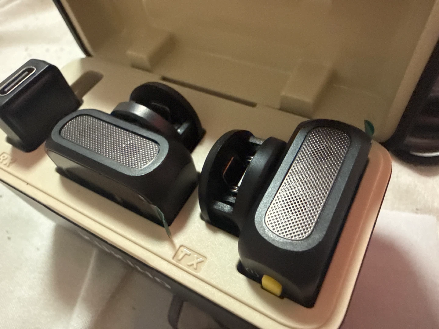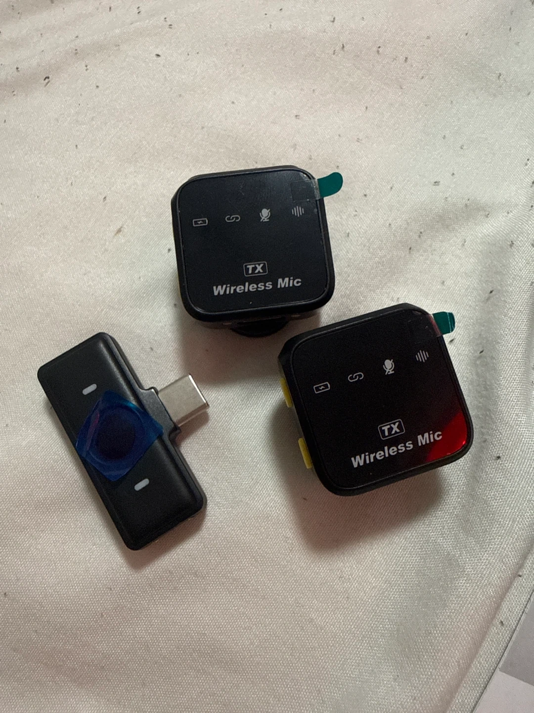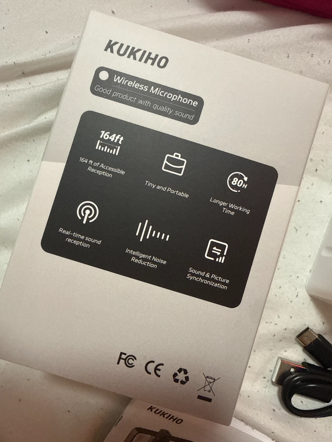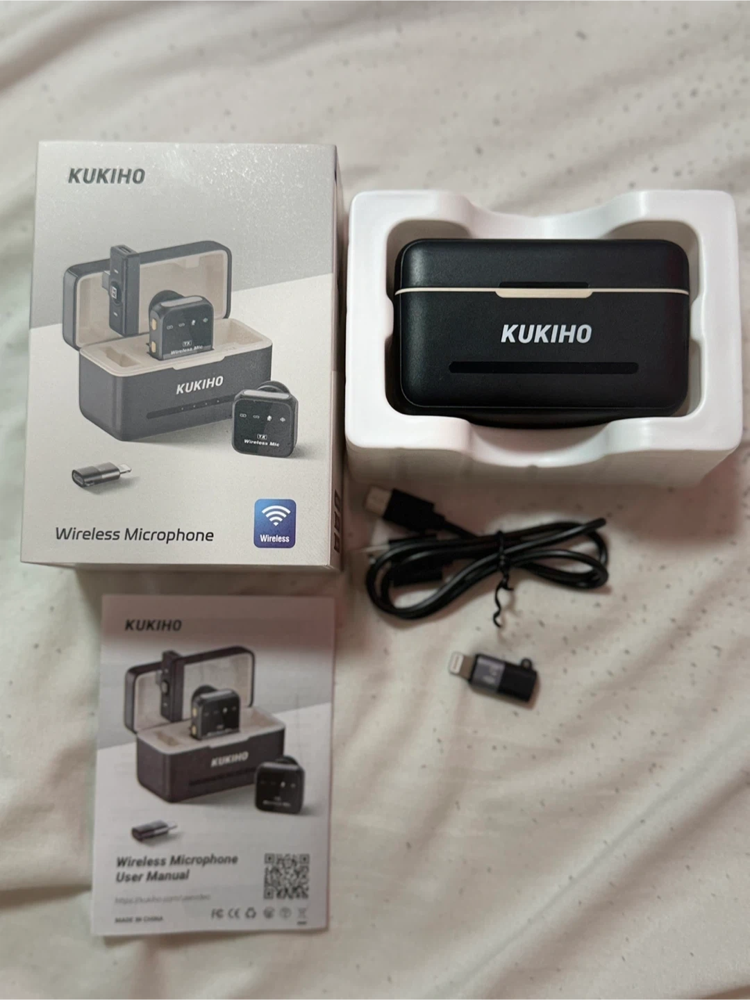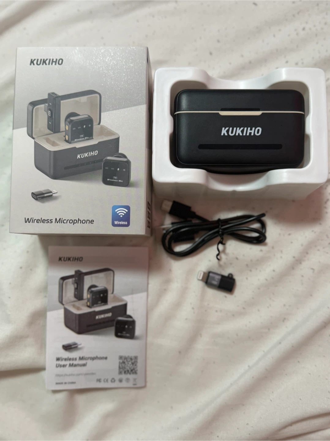 Selling a brand new KUKIHO wireless microphone set, still in its original box! It comes with all the components you see in the pictures, including the charger and user manual. Perfect for anyone looking for a compact and easy-to-use wireless mic setup. Easily put in every cellphones!