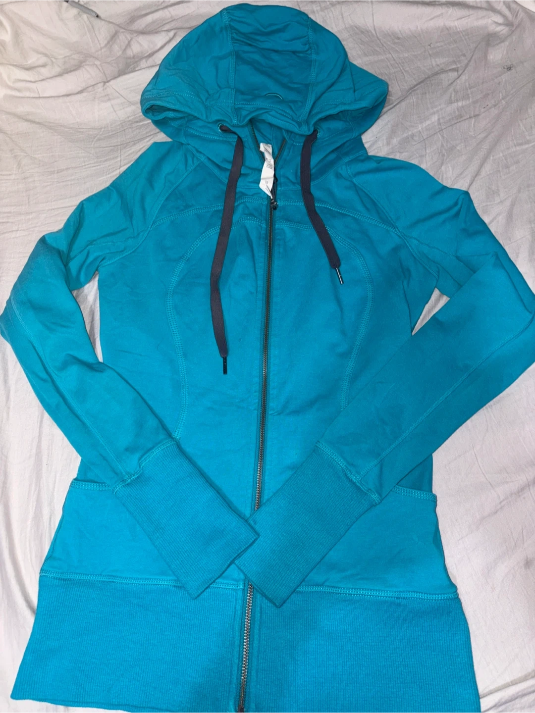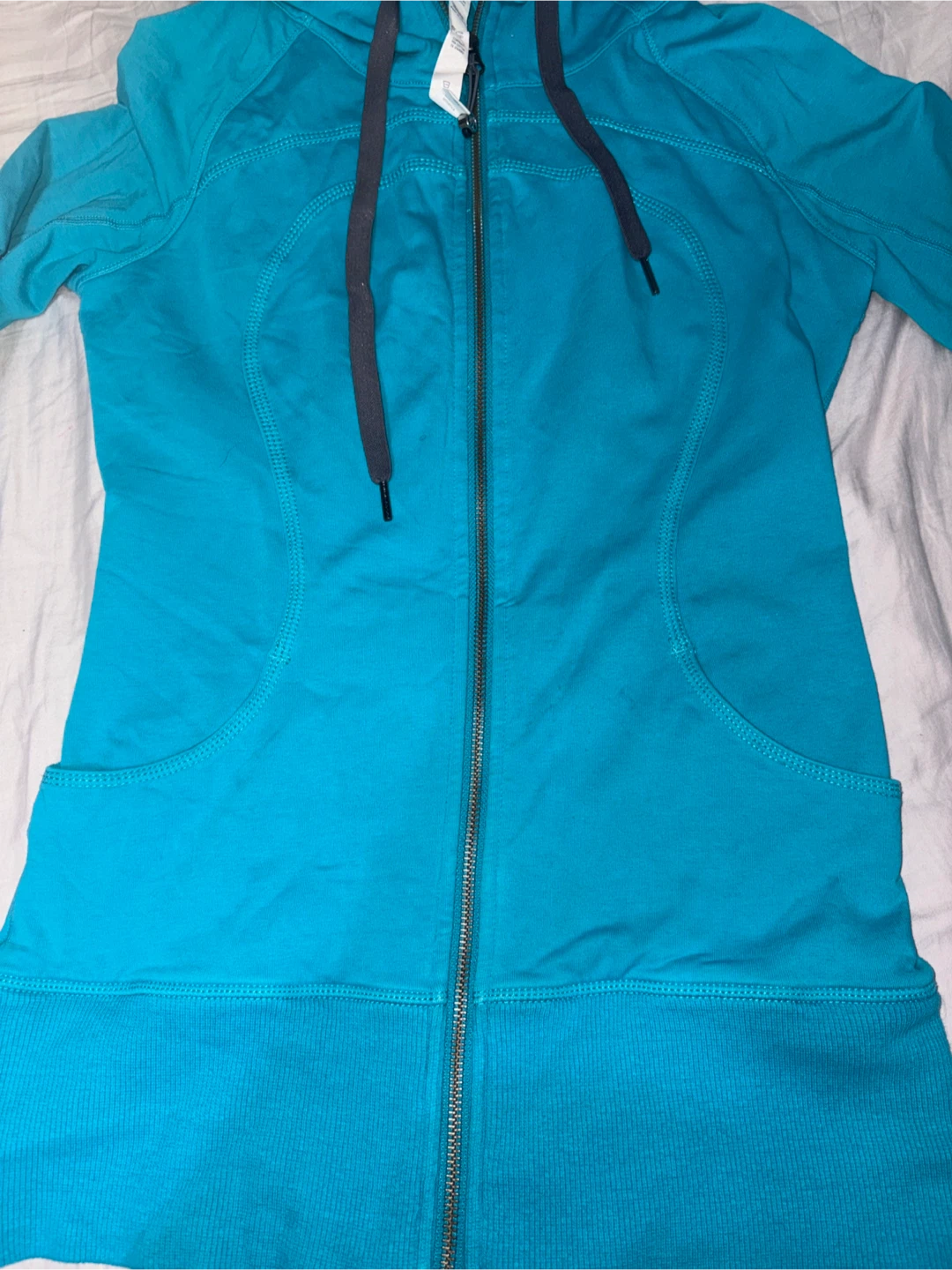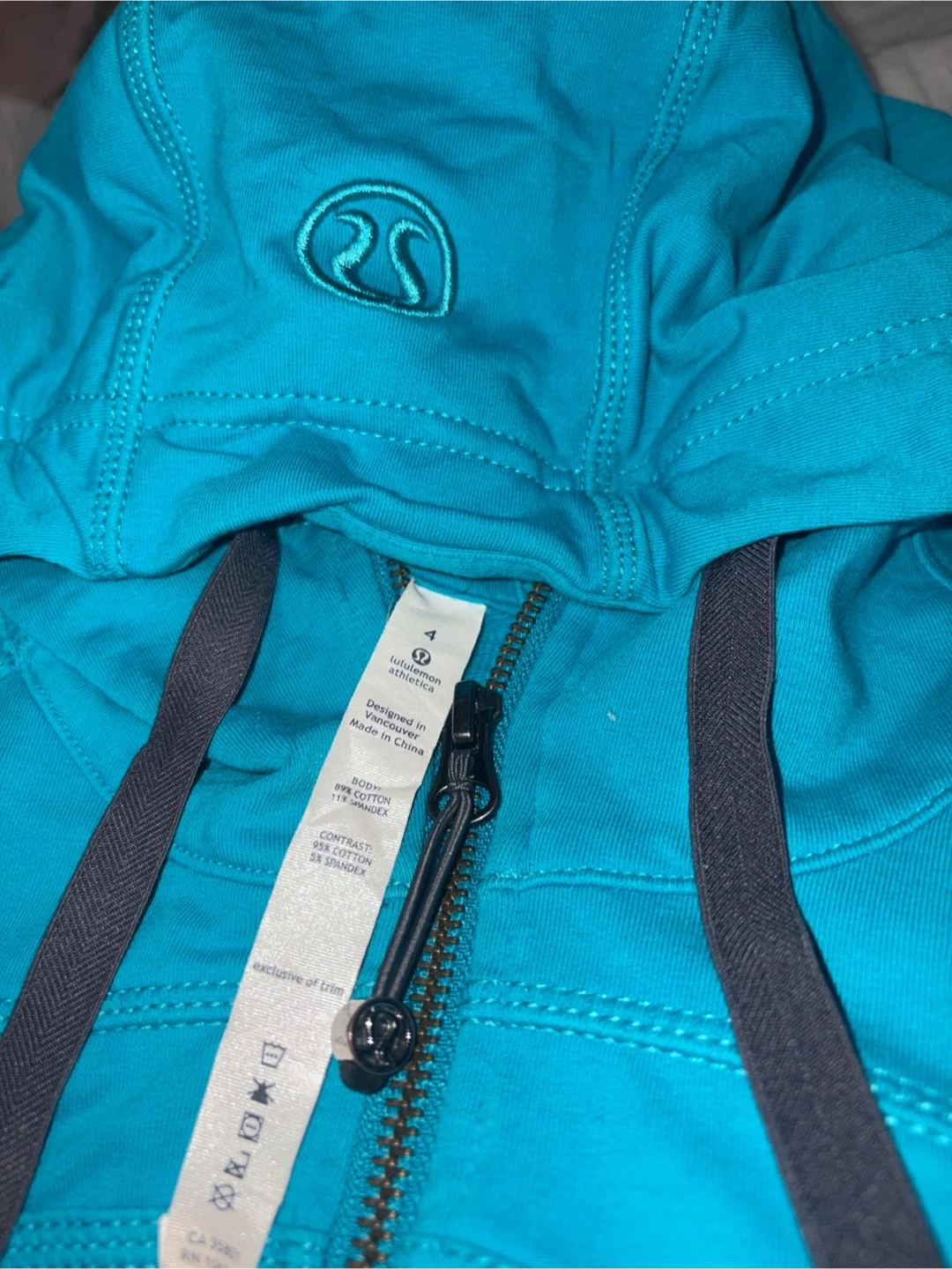 Selling a Lululemon Scuba Hoodie in a vibrant teal color! It's in great condition and a size 4. This hoodie is perfect for workouts or just lounging around. It's made with a comfortable blend of cotton and spandex. New condition!!!