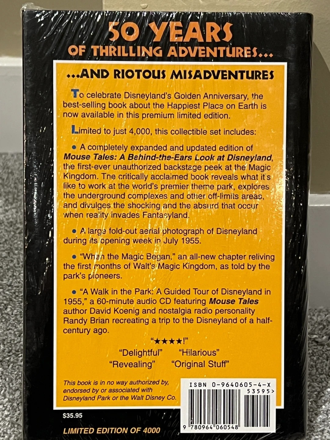 Selling a sealed special Golden Anniversary edition of Mouse Tales: A Behind-the-Ears Look at Disneyland by David Koenig. This is a limited edition of 4000. Includes a completely updated edition of the book and a large fold-out aerial photograph of Disneyland during its opening week in July 1955. Also includes "When the Magic Began," an all-new chapter reliving the first months of Walt's Magic Kingdom, as told by the park's pioneers, and "A Walk in the Park: A Guided Tour of Disneyland in 1955," a 60-minute audio CD featuring Mouse Tales author David Koenig.