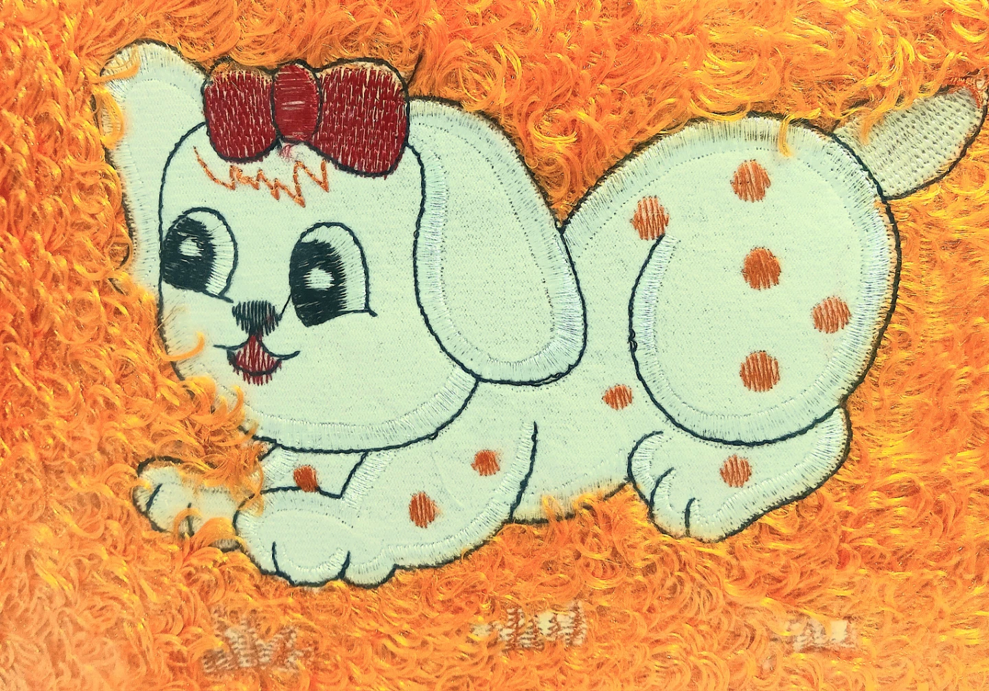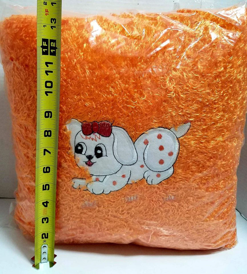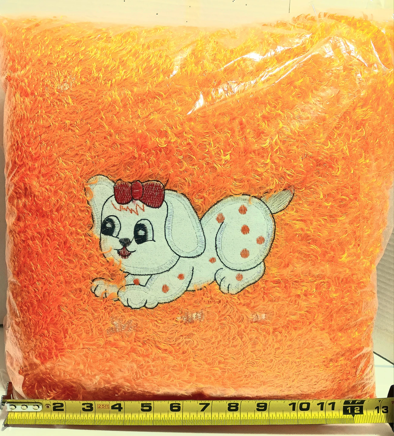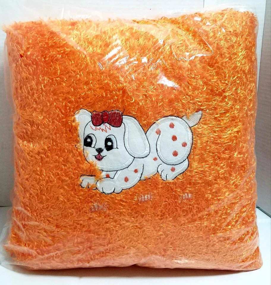 Add a touch of whimsy to your living space with this adorable decorative pillow. Featuring an embroidered dog with a cute bow, this orange pillow measures approximately 12 inches by 12 inches. It's in new condition.
