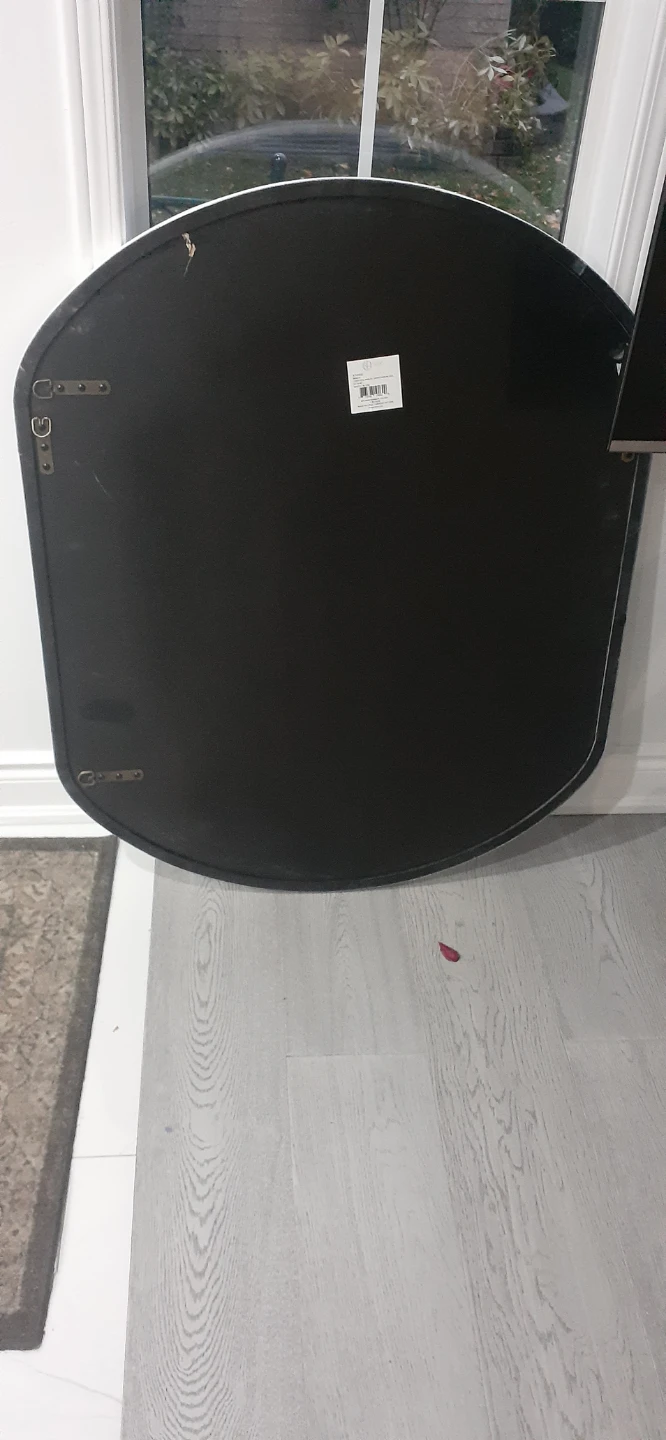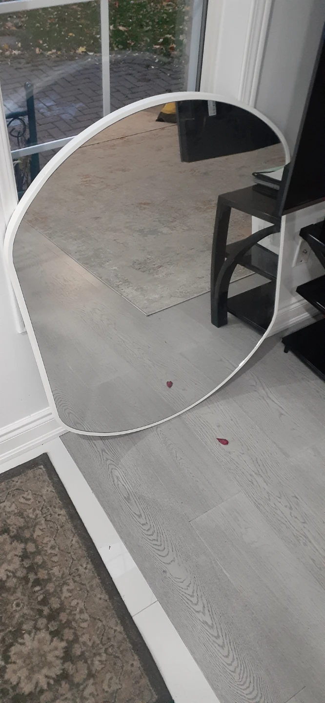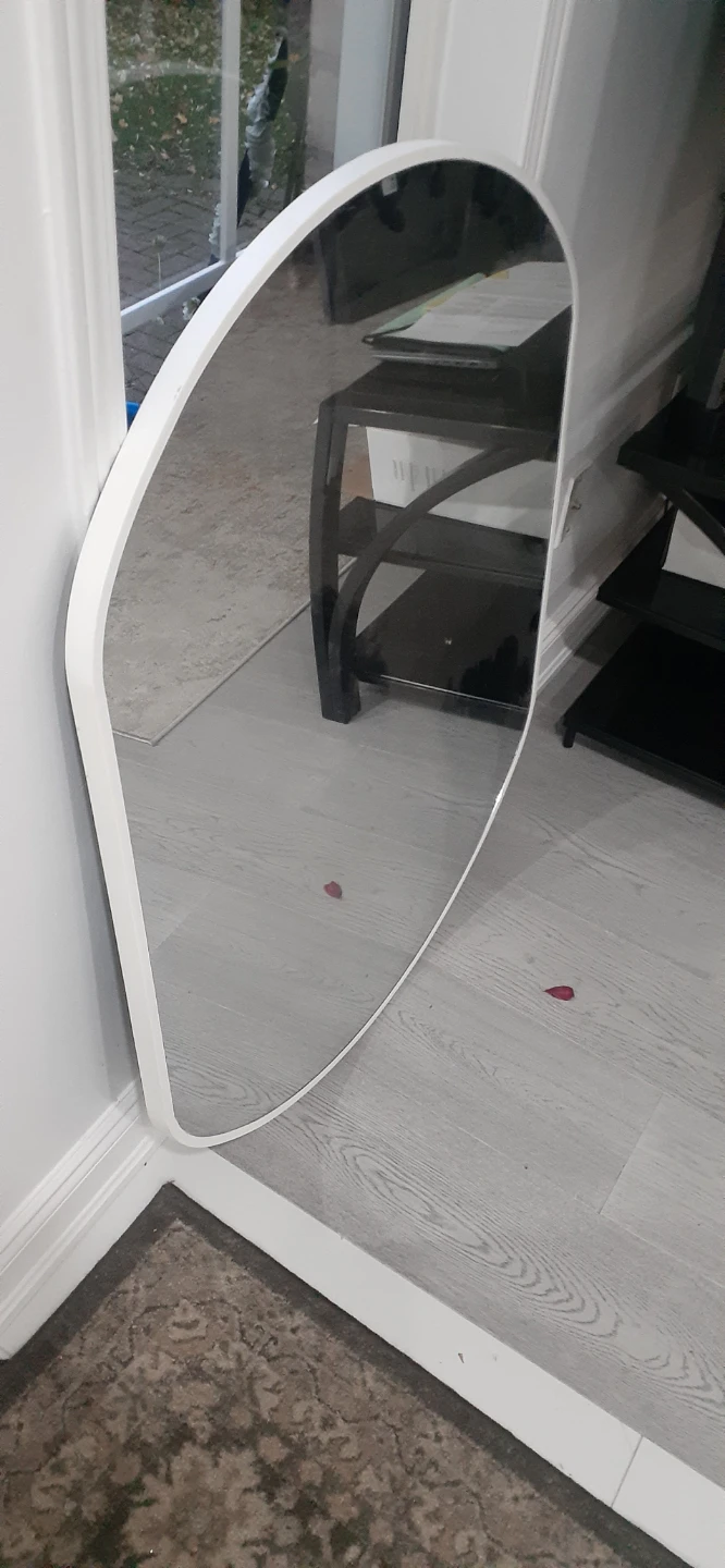 Selling a stylish white framed mirror. It's in great condition and would look lovely in any room. It has a unique, slightly rounded shape that adds a touch of modern elegance