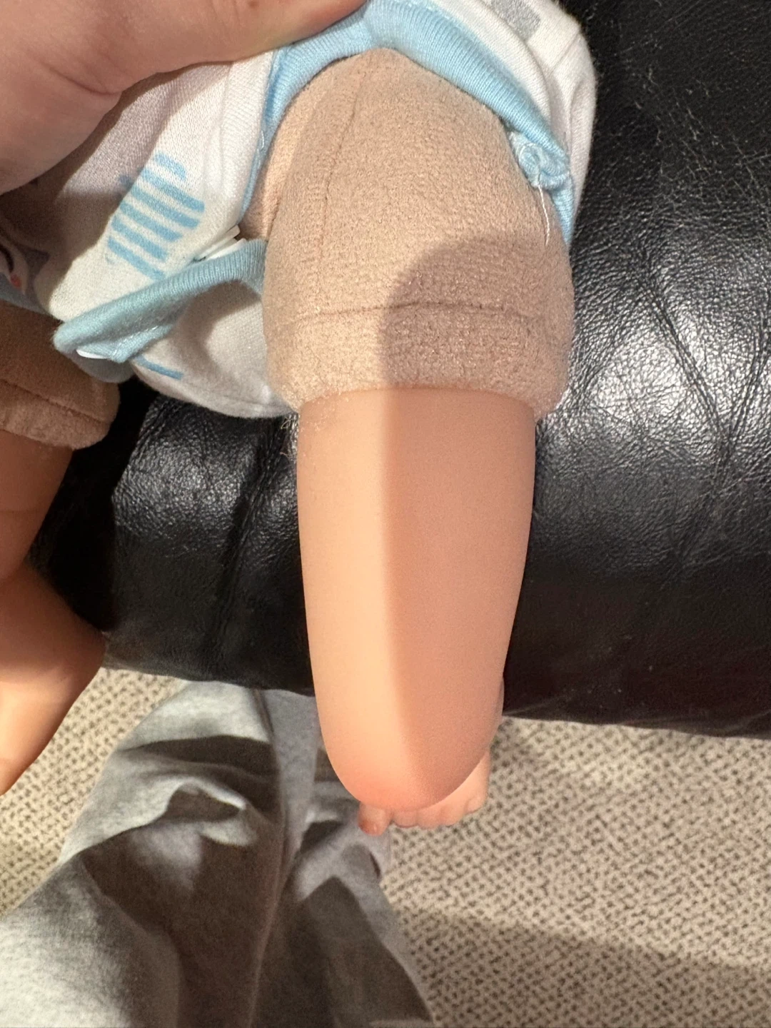 This is a cute reborn baby doll with blue eyes and brown hair is 16 inches. The doll is wearing a white outfit with a star pattern and also comes with a blue hat!