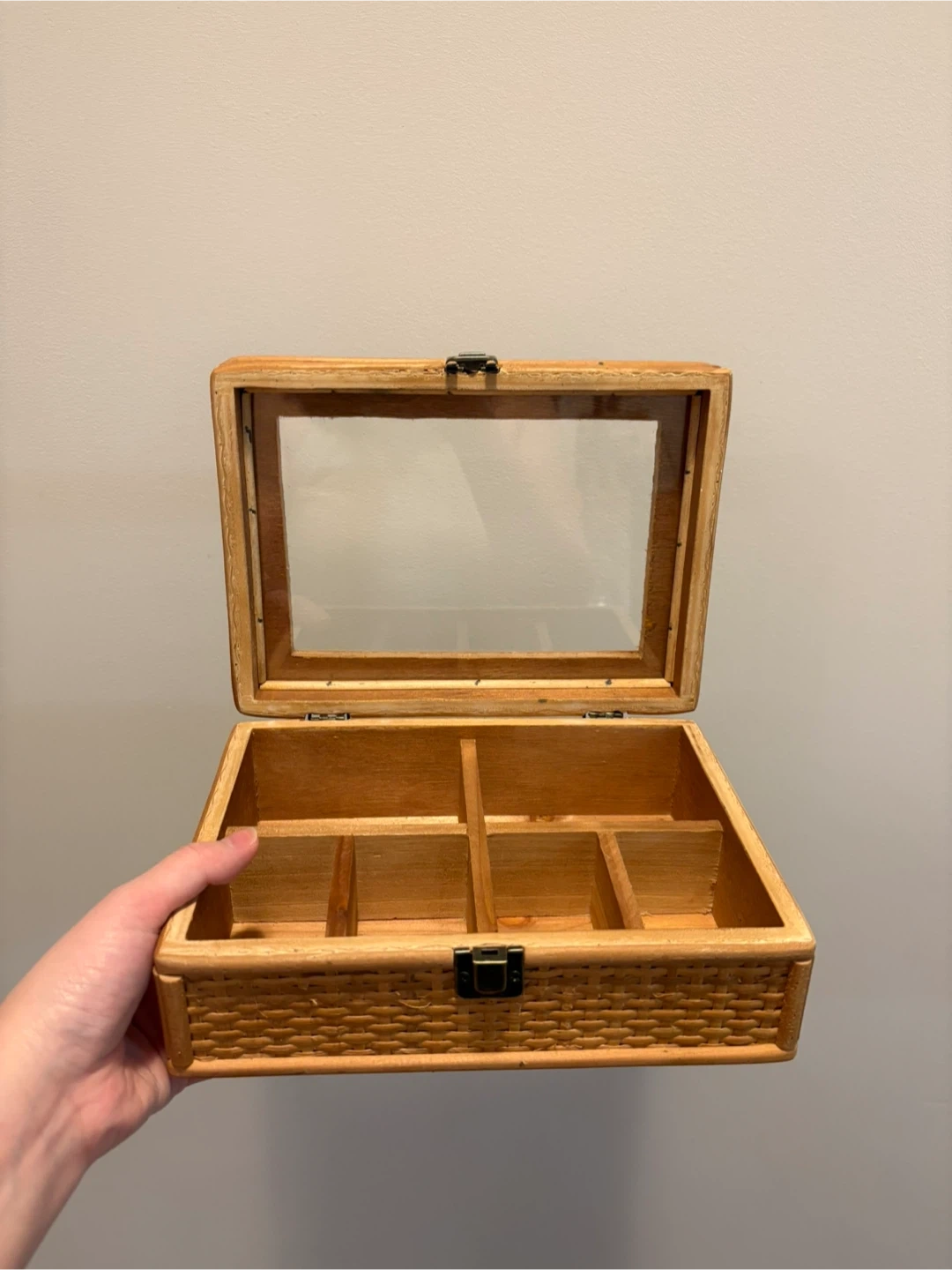 Wooden box with multiple compartments and a clear glass lid—great for organizing or displaying collectibles.