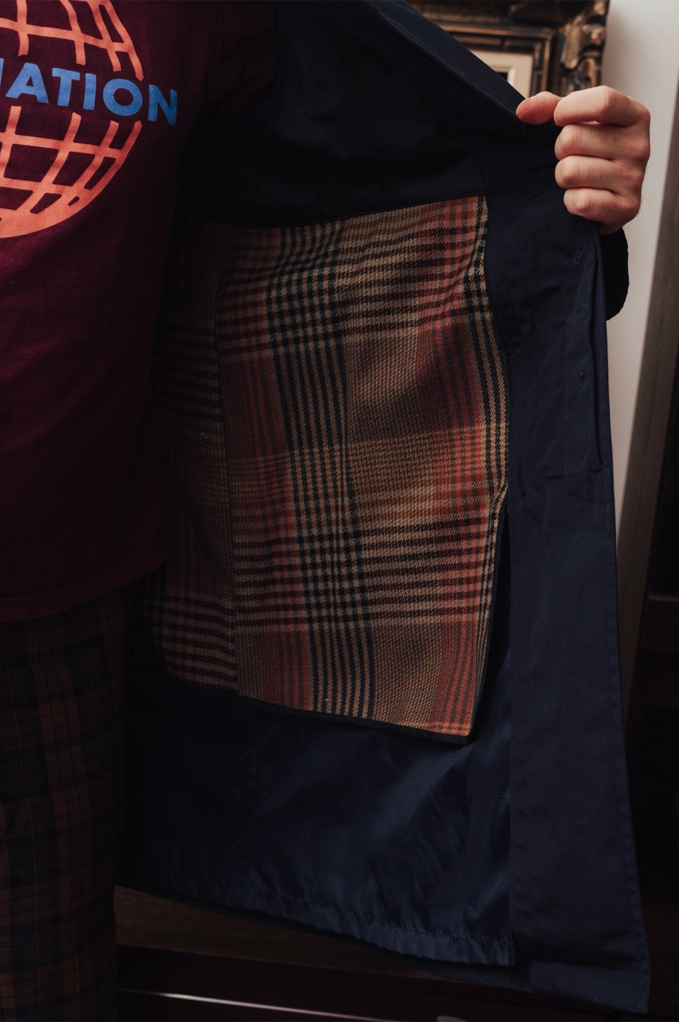 Timeless vintage navy trench coat with a beautiful plaid interior lining. Clean, classic silhouette with a tailored fit.