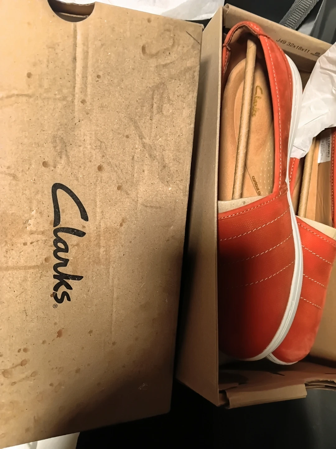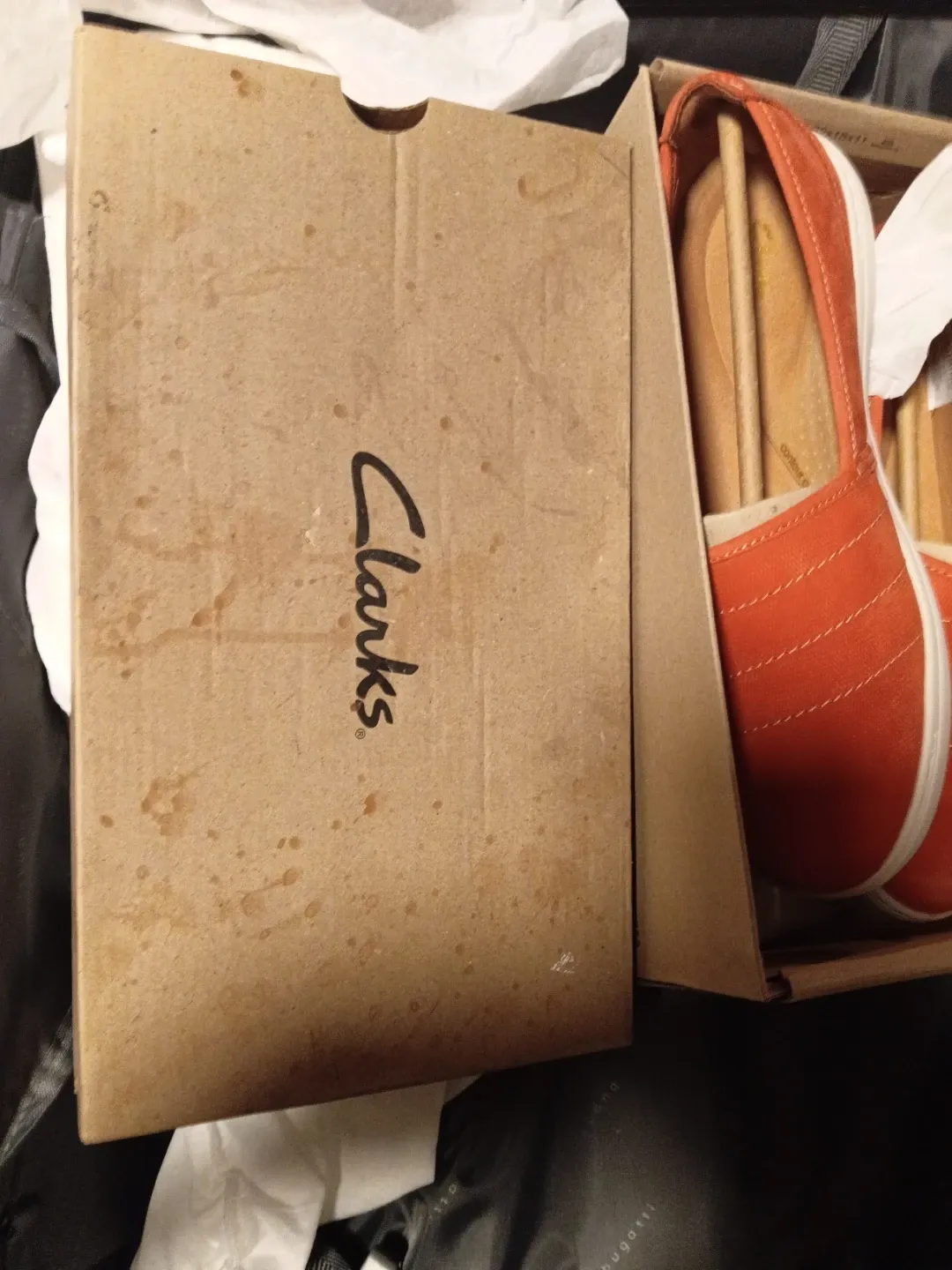 Selling a pair of Clarks slip-on shoes in a vibrant orange colour! They come with the original box. Perfect for adding a pop of colour to your outfit and super comfy for everyday wear