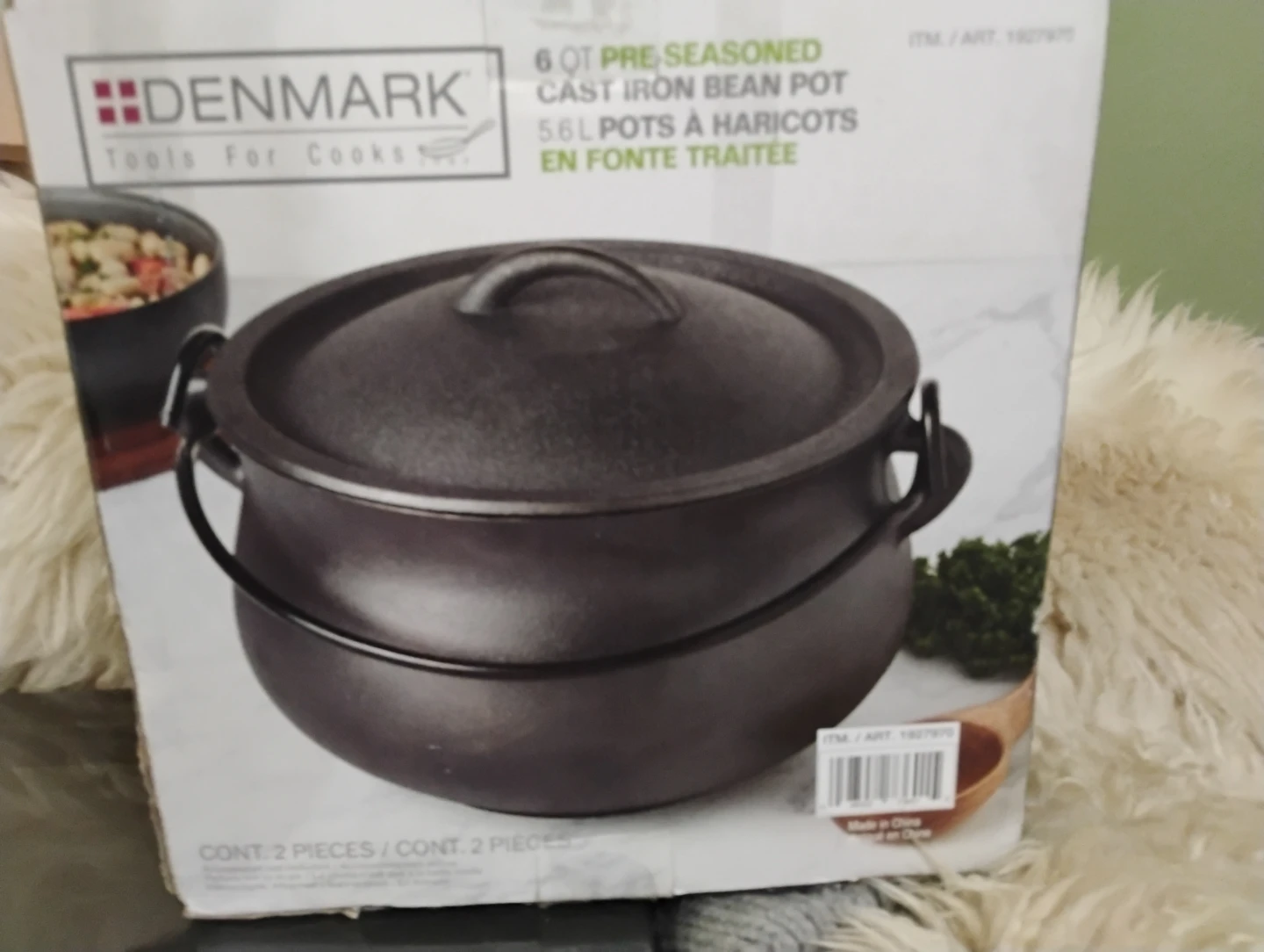 Selling a brand new Denmark 6 QT pre-seasoned cast iron bean pot! It's still in the box and has never been used. This pot is 5.6L and comes with 2 pieces, perfect for cooking up some delicious meals!