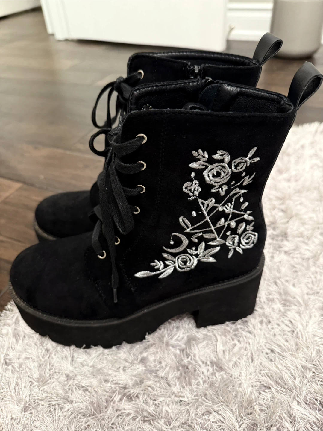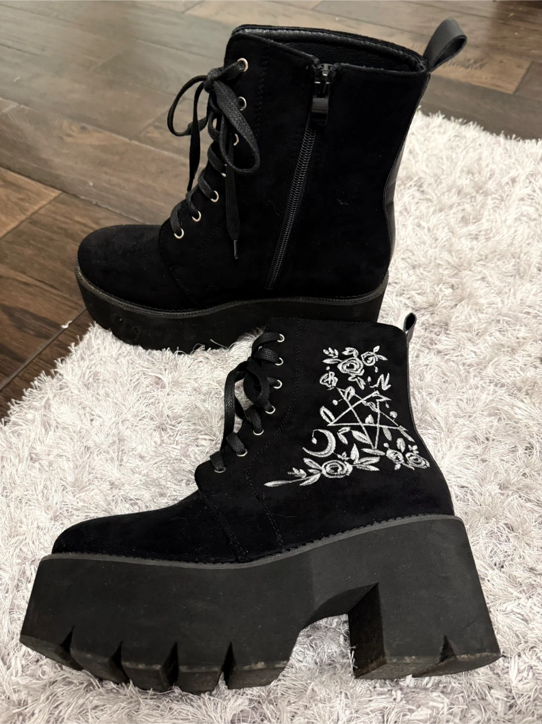These are a pair of black lace-up platform boots. They feature a decorative embroidery design on the sides. The boots have a lace-up front with metal eyelets, a side zipper, and a chunky platform sole. These boots are LIGHTWEIGHT not heavy.