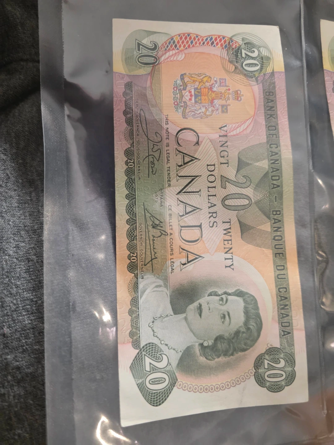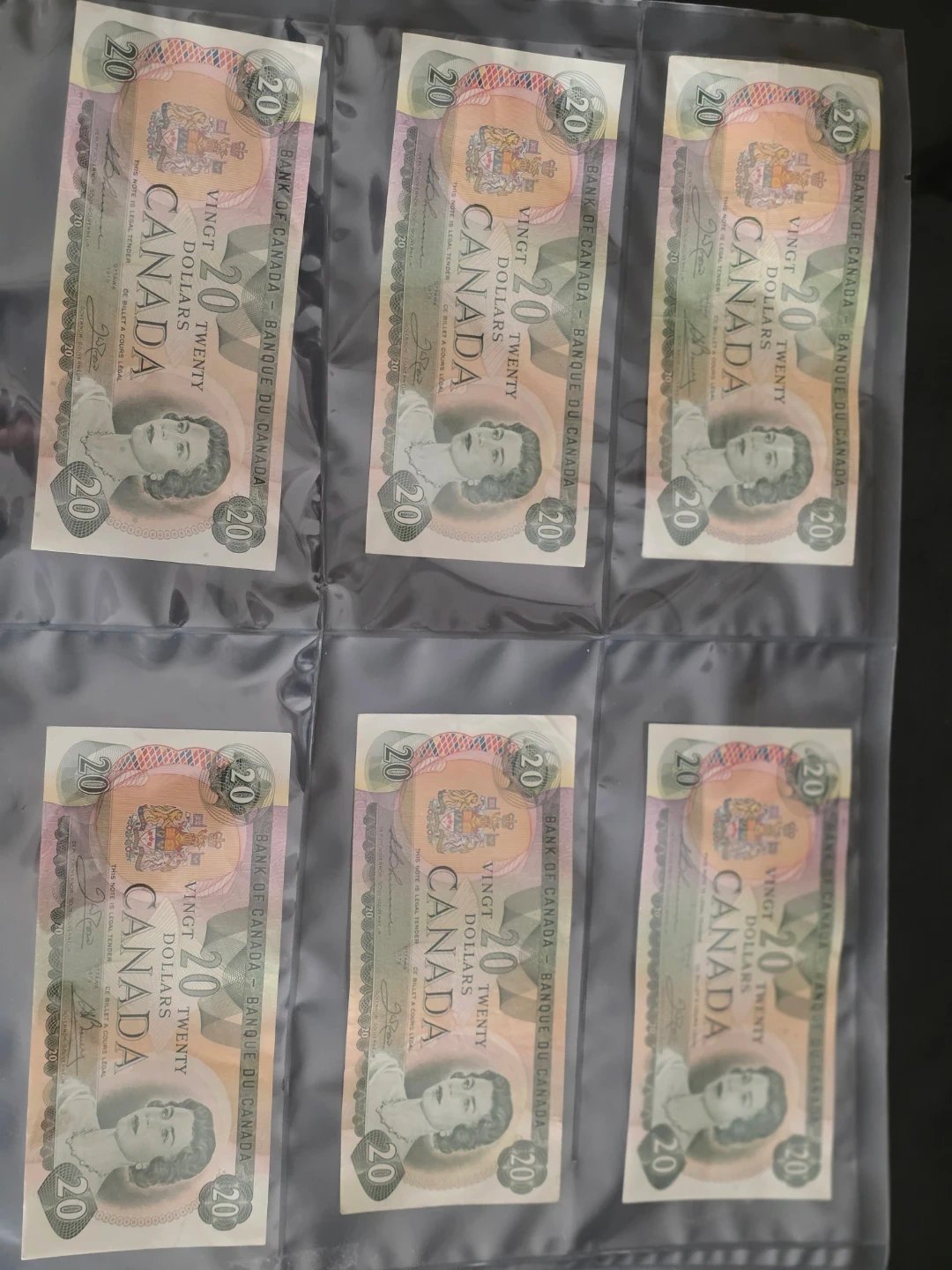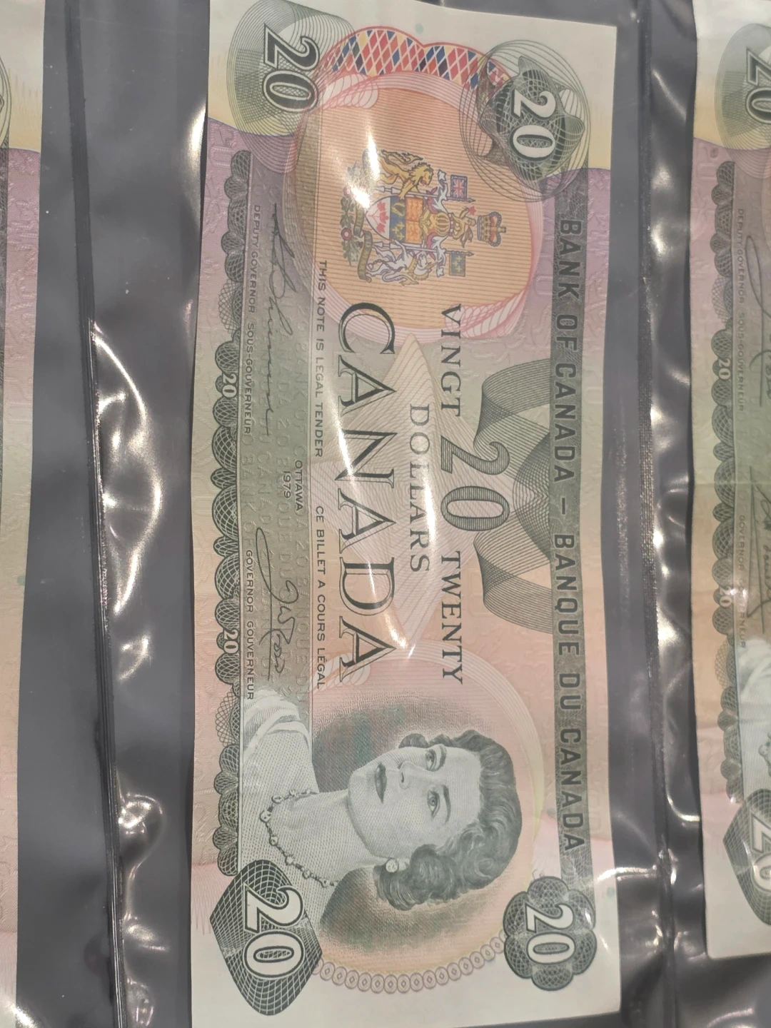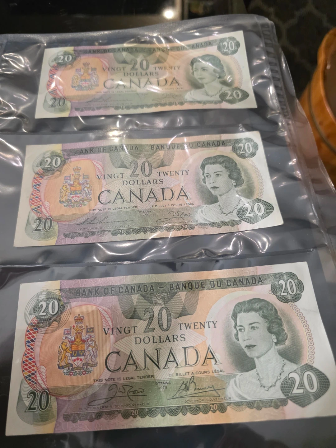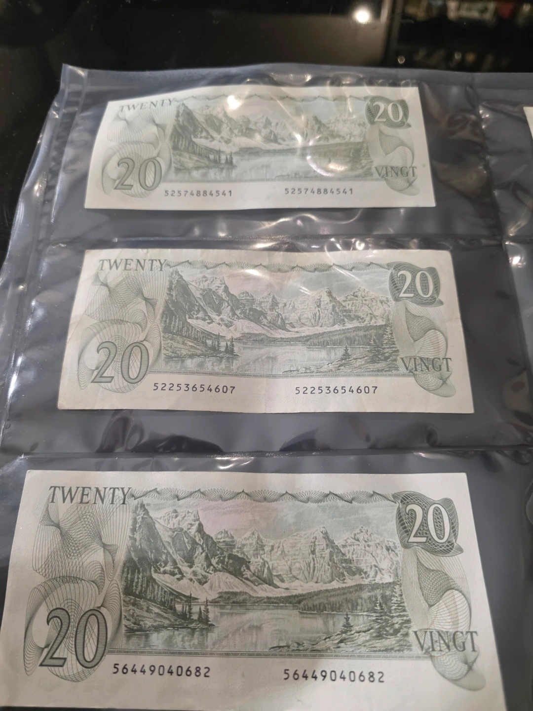 Selling (or trade for silver or collectible coins) a collection of Bank of Canada $20 bills. They feature Queen Elizabeth II and a landscape scene on the back. Great for collectors!