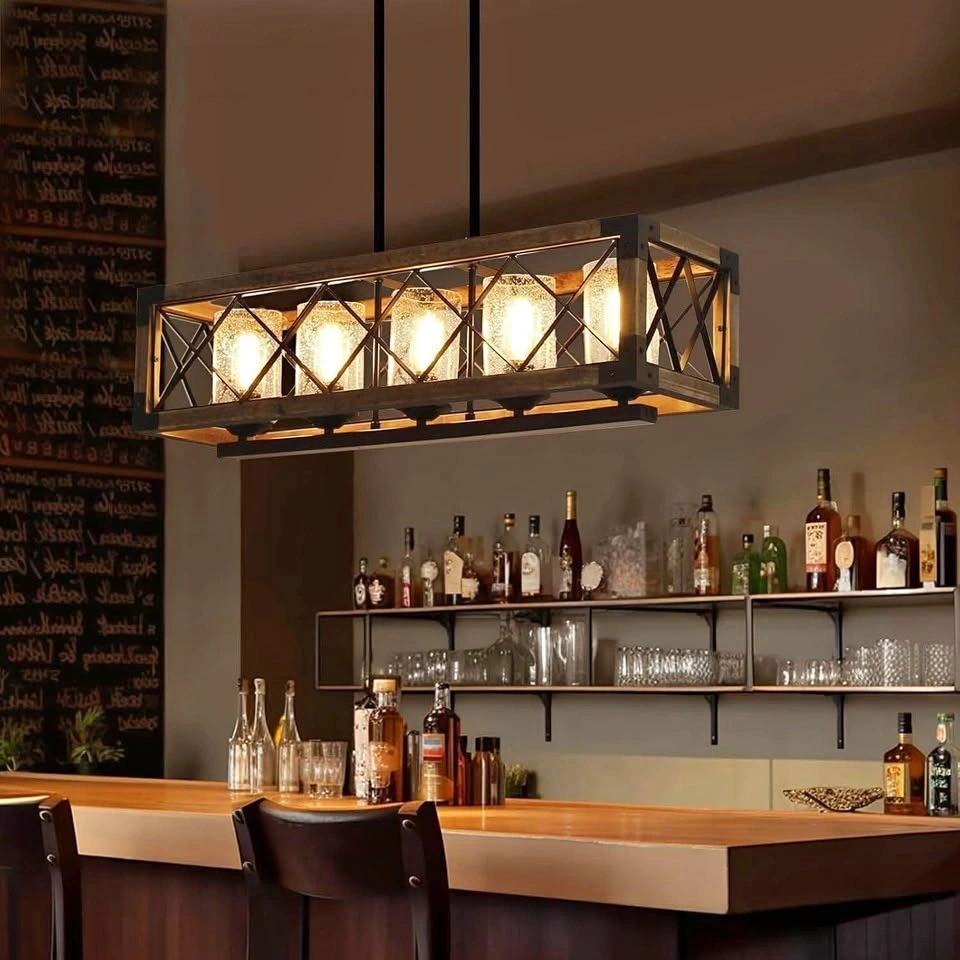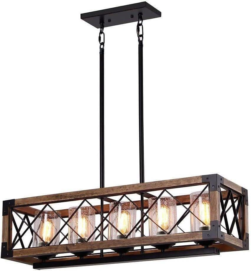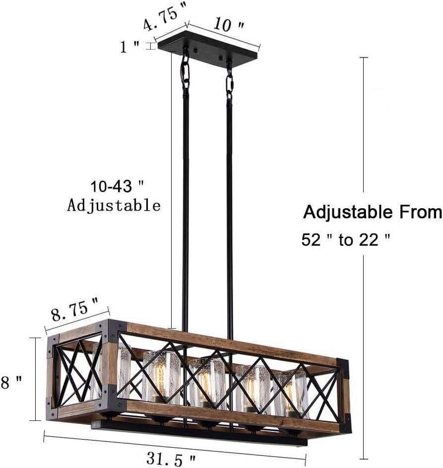 UNIQUE APPEARANCE: Exquisite metal&wood, high transmittance glass and ancient ways finish creates a truly unique look. Not only a retro chandelier kitchen table lamp but also an ornament for breakfast nook. NICE & SHINY: This wood pendant lighting looks gorgeous above the log cabin home. Good design and well made. Great to add a bit of rustic to modern design. The chandelier lamp brings a rustic look and will surely add lustre to any decor conditions. DIMENSION: Canopy: 10"x 4.75". Lamp Body: 31.5"L x 8.75"W x 8"H, Metal Rod Length: Max 40"-Min 9.8" (adjustable). ADJUSTABLE HEIGHTS & SUGGESTED SPACE: Adjustable metal rod, free to get the lighting effect you want. Perfect for kitchen island, hallway, dining room table, bedroom, living room, bathroom, entryway, coffee, bar, club, loft, doorway.
