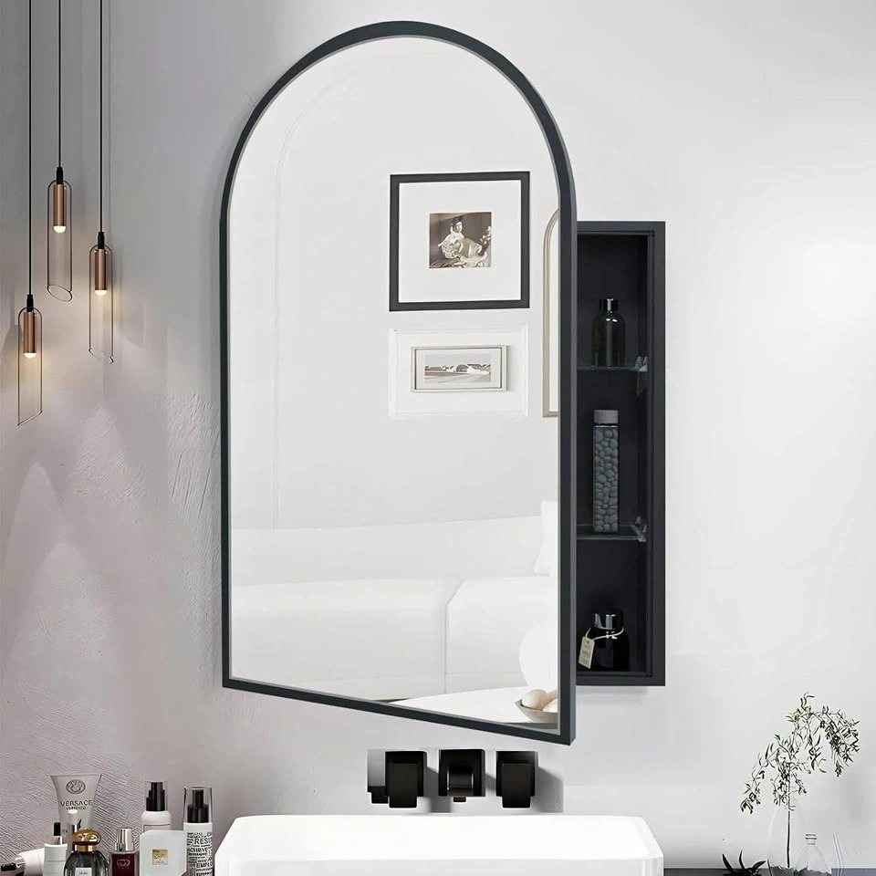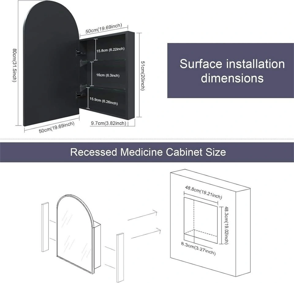 Premium & Stylish Arched Mirror Cabinet Matte black metal body and lightweight aluminum-framed door blend elegance with safety. Highly moisture and rust-resistant for long-lasting use, featuring an HD eco-mirror for crystal-clear reflections. Spacious Storage This mirror cabinet for bathroom features two adjustable tempered glass shelves, offering ample space for toiletries, cosmetics, and essentials. Keep your space organized and clutter-free. High-Definition Reflection This black bathroom medicine cabinet features a quality copper-free mirror. It provides a clear, and non-deformed reflection. It accurately shows your true self daily, making it convenient for makeup and grooming. Flexible Installation Blending classic and contemporary styles, this elegant mirrored cabinet suits any space. With both surface and recessed mounting options, it s perfect for entryways, living rooms, bathrooms, and dressing rooms. Its pre-assembled design ensures quick setup mount it on the wall or inset into drywall with ease. Silent Soft-Close Medicine cabinet Premium stainless steel soft-close hinges enable a noiseless, smooth closure, creating a safer and more peaceful makeup and dressing experience without slamming noises.
