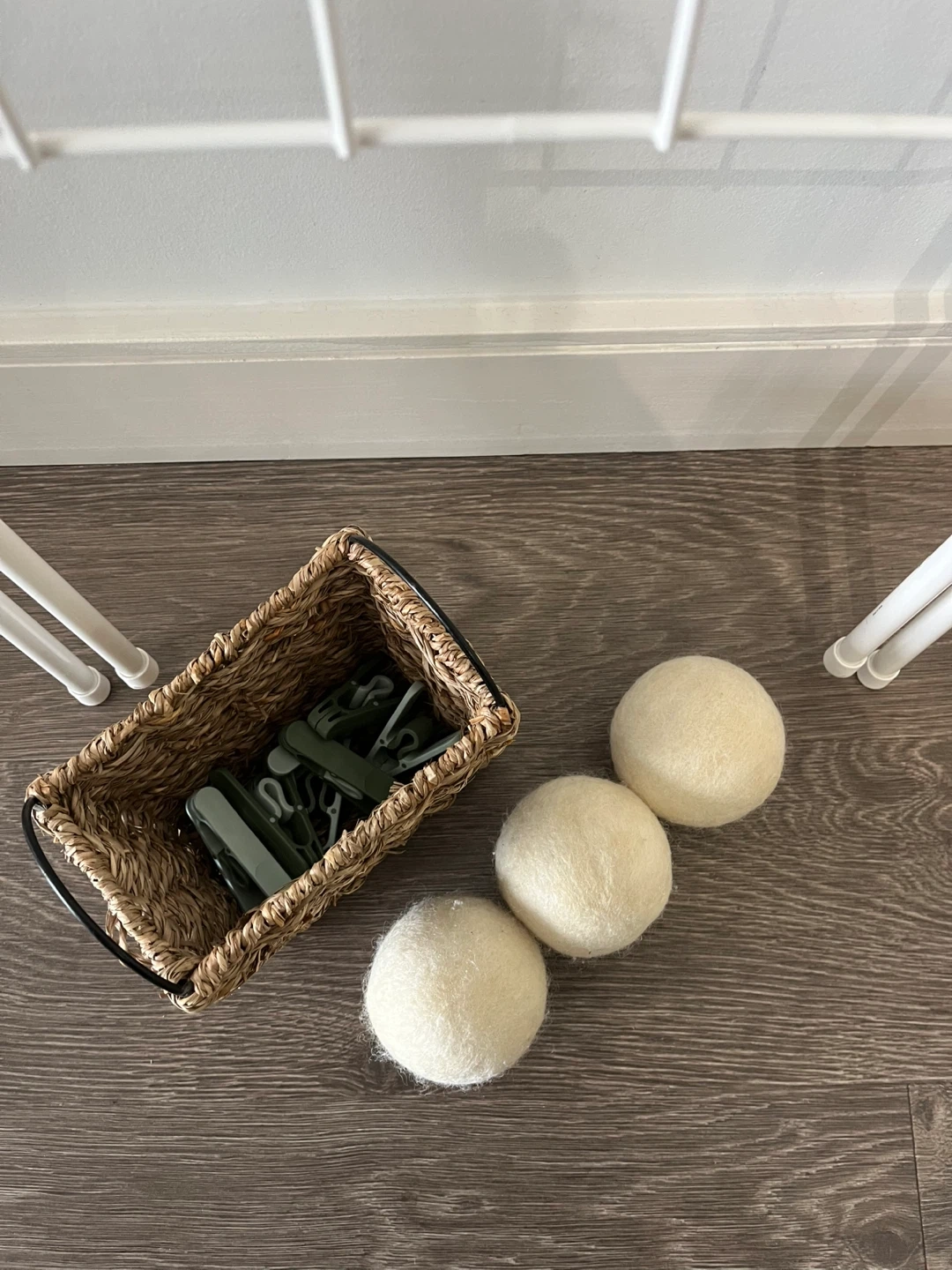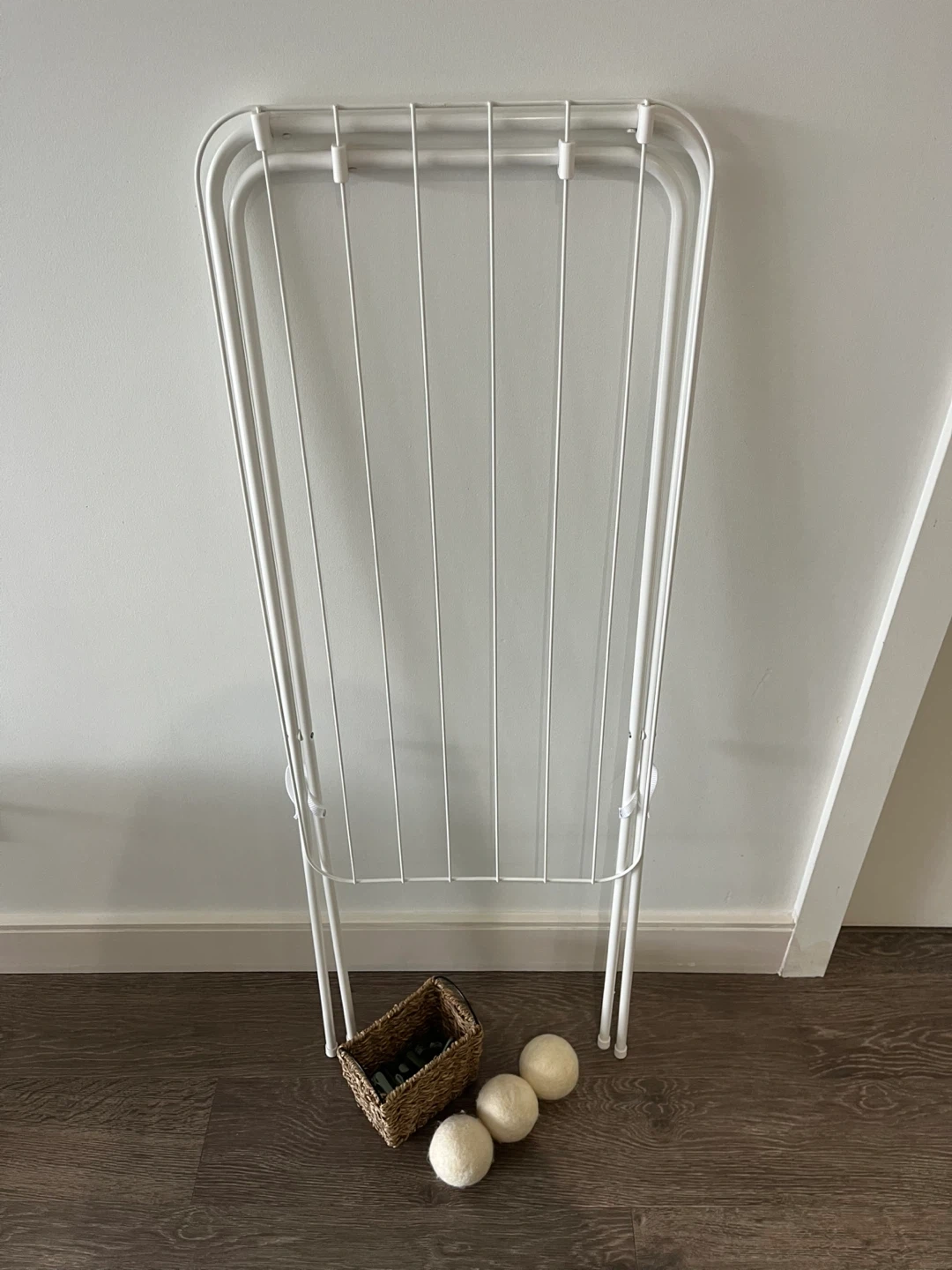 Selling a white clothes drying rack in new condition! It's perfect for small spaces and folds up easily for storage. Also included are wool dryer balls and a basket of clothespins.