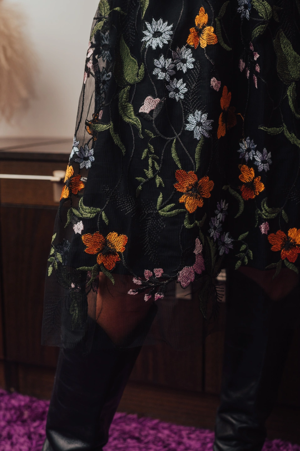 Beautiful vintage sheer mesh skirt with embroidered floral detailing throughout. Lightweight, flowy, and incredibly flattering — perfect for dressing up or styling casually with boots or sandals.