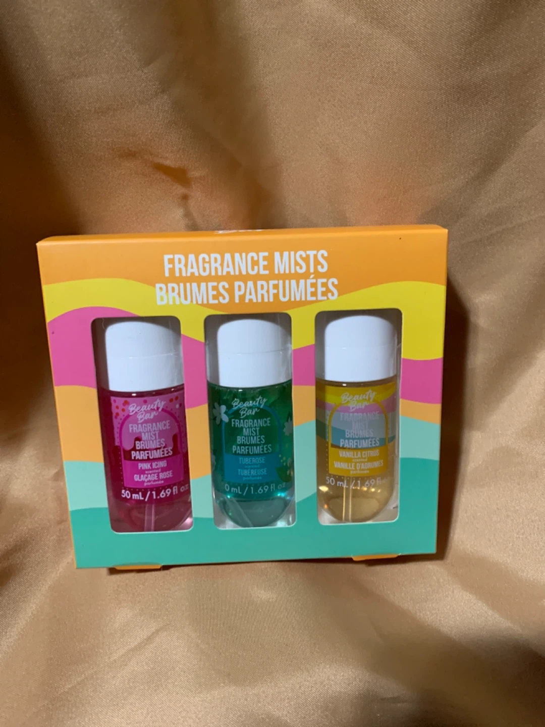 Selling a set of Beauty Bar fragrance mists! The set includes three different scents: Pink Icing, Tuberose, and Vanilla Citrus. Each bottle contains 50ml/1.69 fl oz of fragrance mist. Perfect for trying out new scents or gifting!