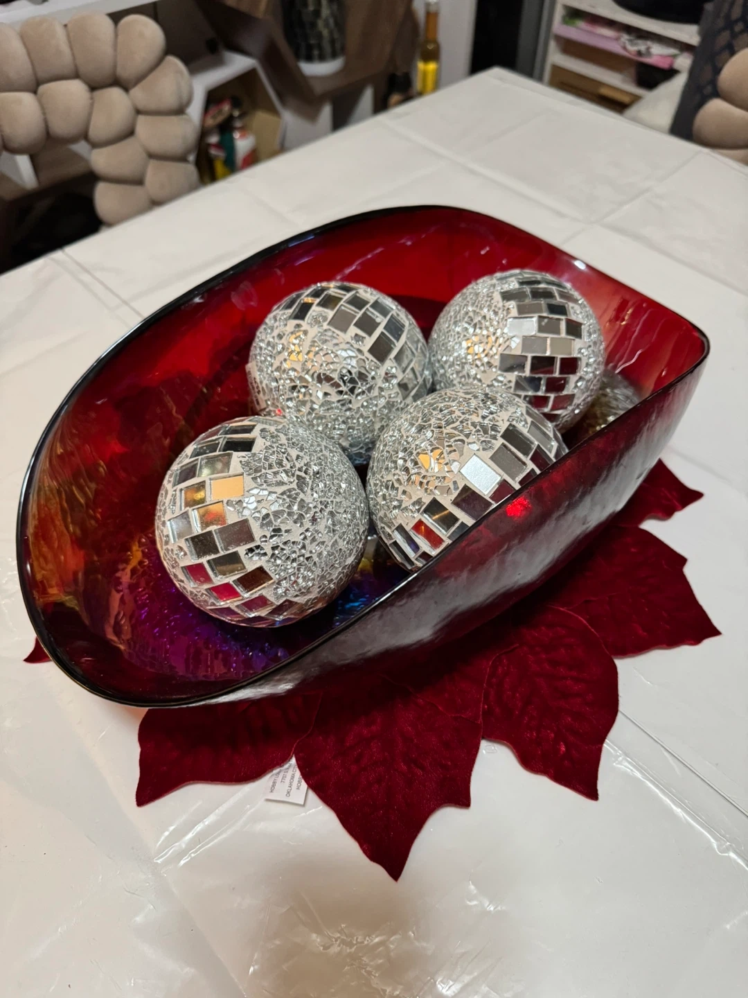 Add a touch of sparkle to your home with this lovely red glass bowl!. Perfect for a centerpiece or accent piece to brighten up any room. It does not include the spheres.