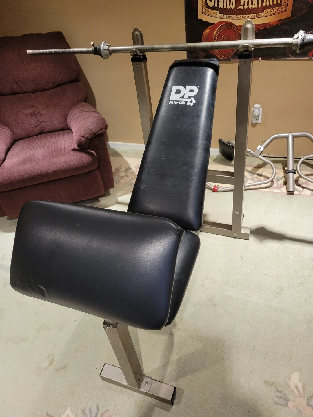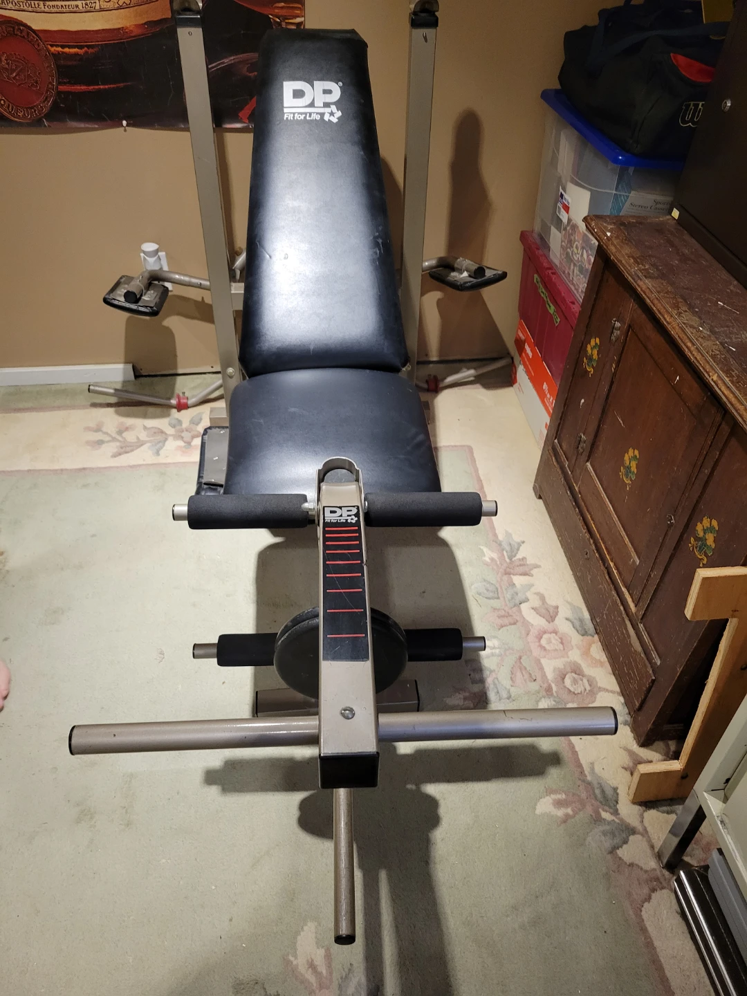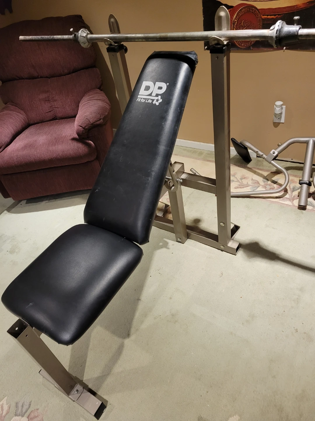 Selling a DP Fit for Life weight bench. It's in good condition and ready for your home gym! Perfect for various exercises and strength training. Attachments for curls, flys, and leg work. 2 inch square tubing. Quality bench purchased at Sears. Bar included.
