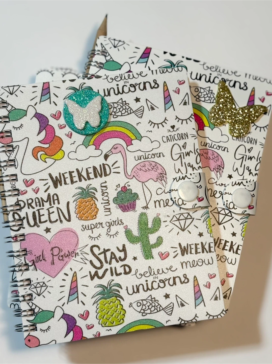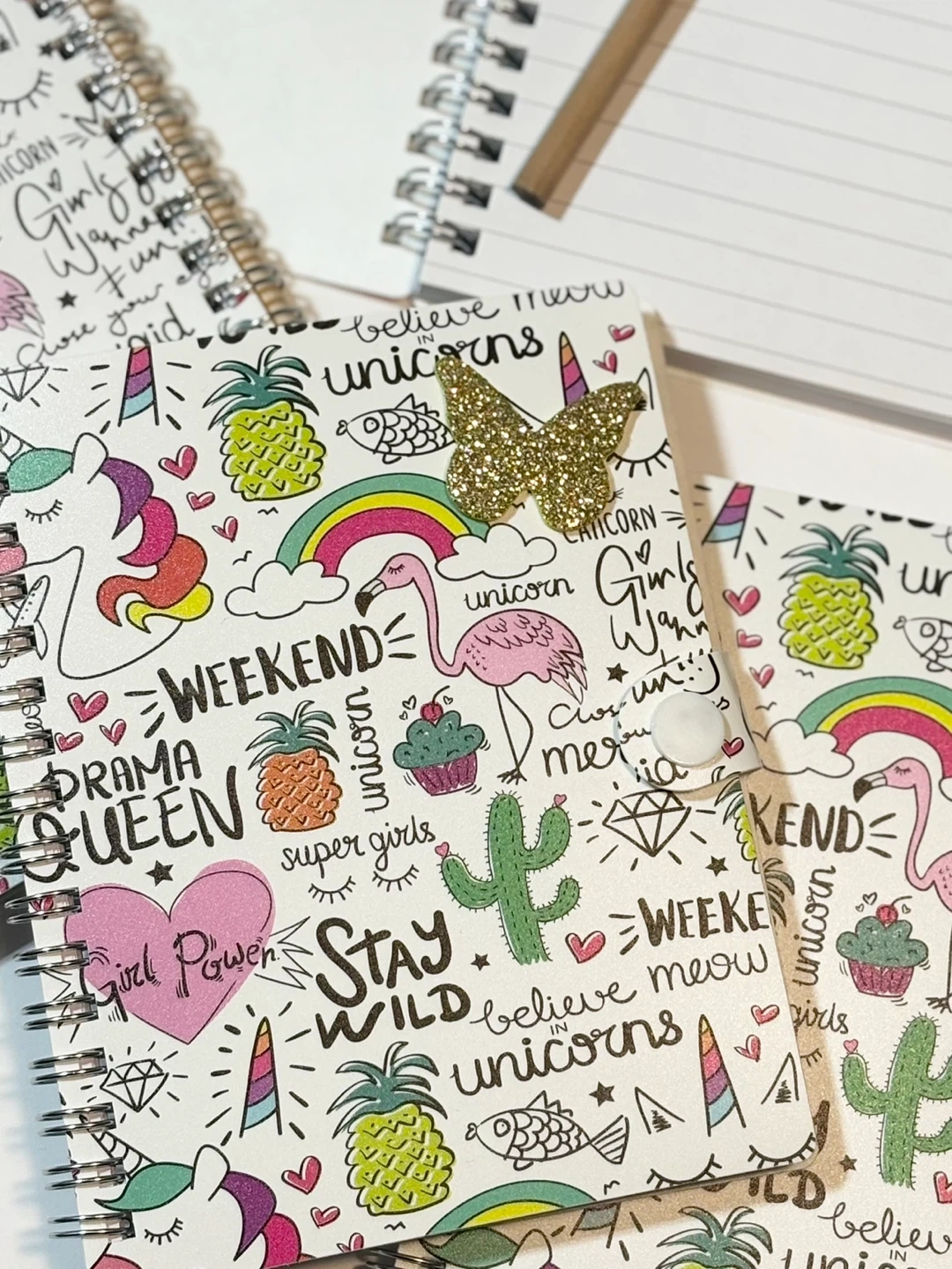 Check out these cute notebooks with a fun unicorn design! They're perfect for school, work, or just doodling. They have a spiral binding and hard cover with a button to keep your secrets out of sight. ;-)