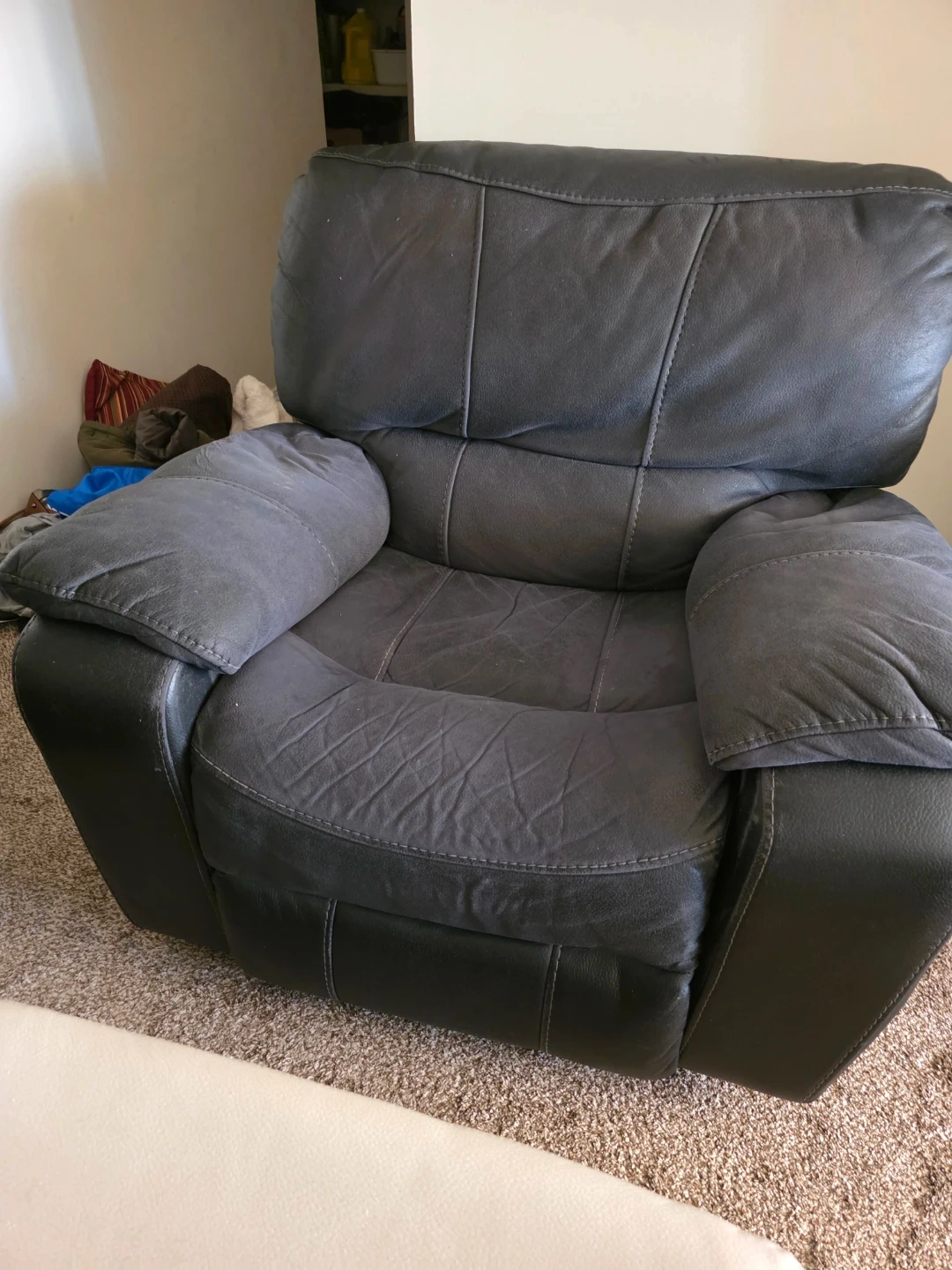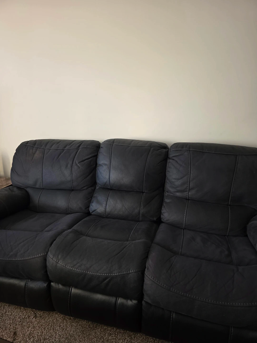 Selling a black leather reclining sofa. It's in used condition, the photos. It's still very comfortable and perfect for a living room or den. A matching reclining chair is also available!