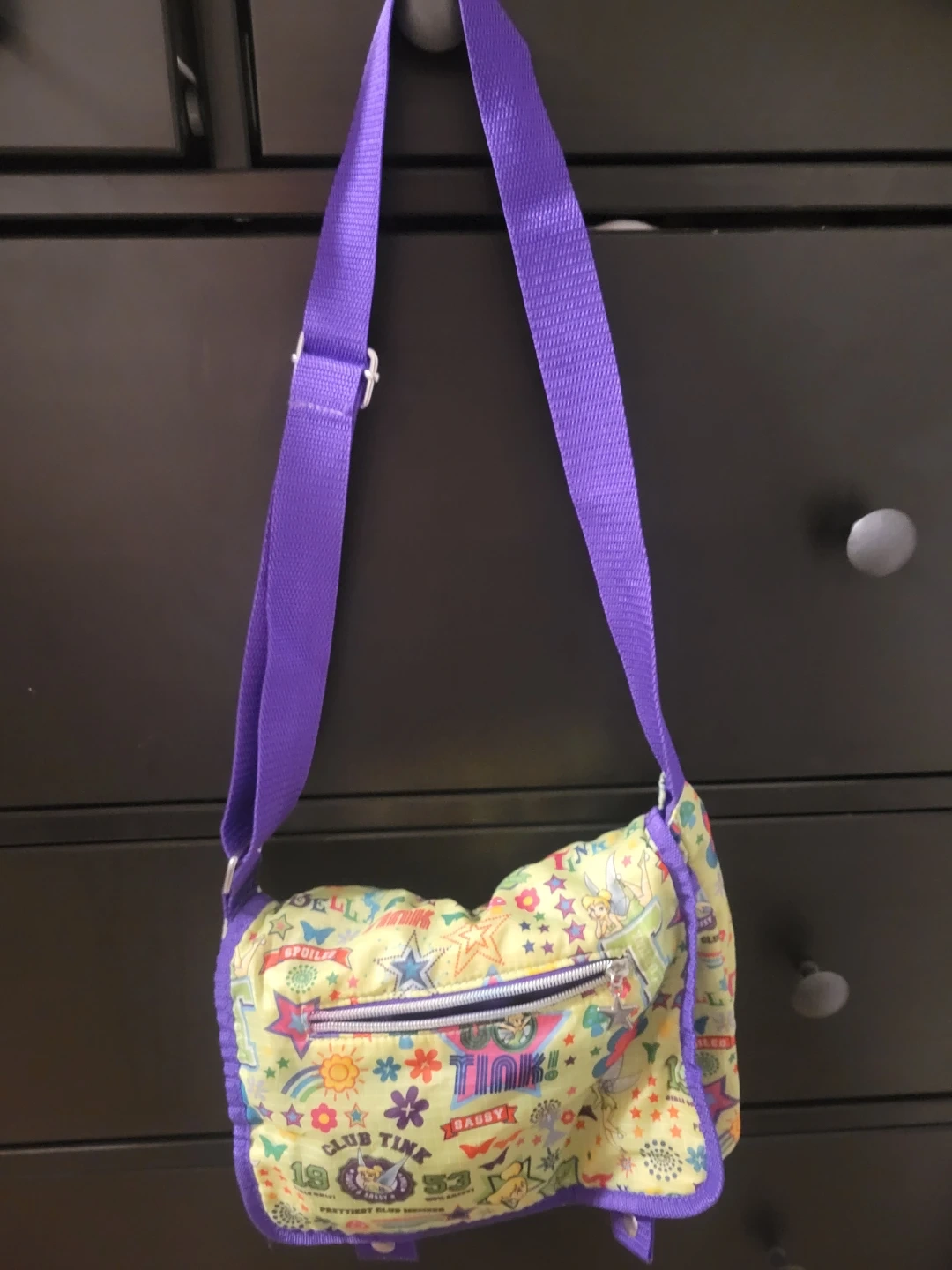 Check out this cute Disney Fairies Tinkerbell crossbody bag! It features a colourful design with Tinkerbell and other fairy-themed graphics. The strap is purple and adjustable, perfect for any Disney fan