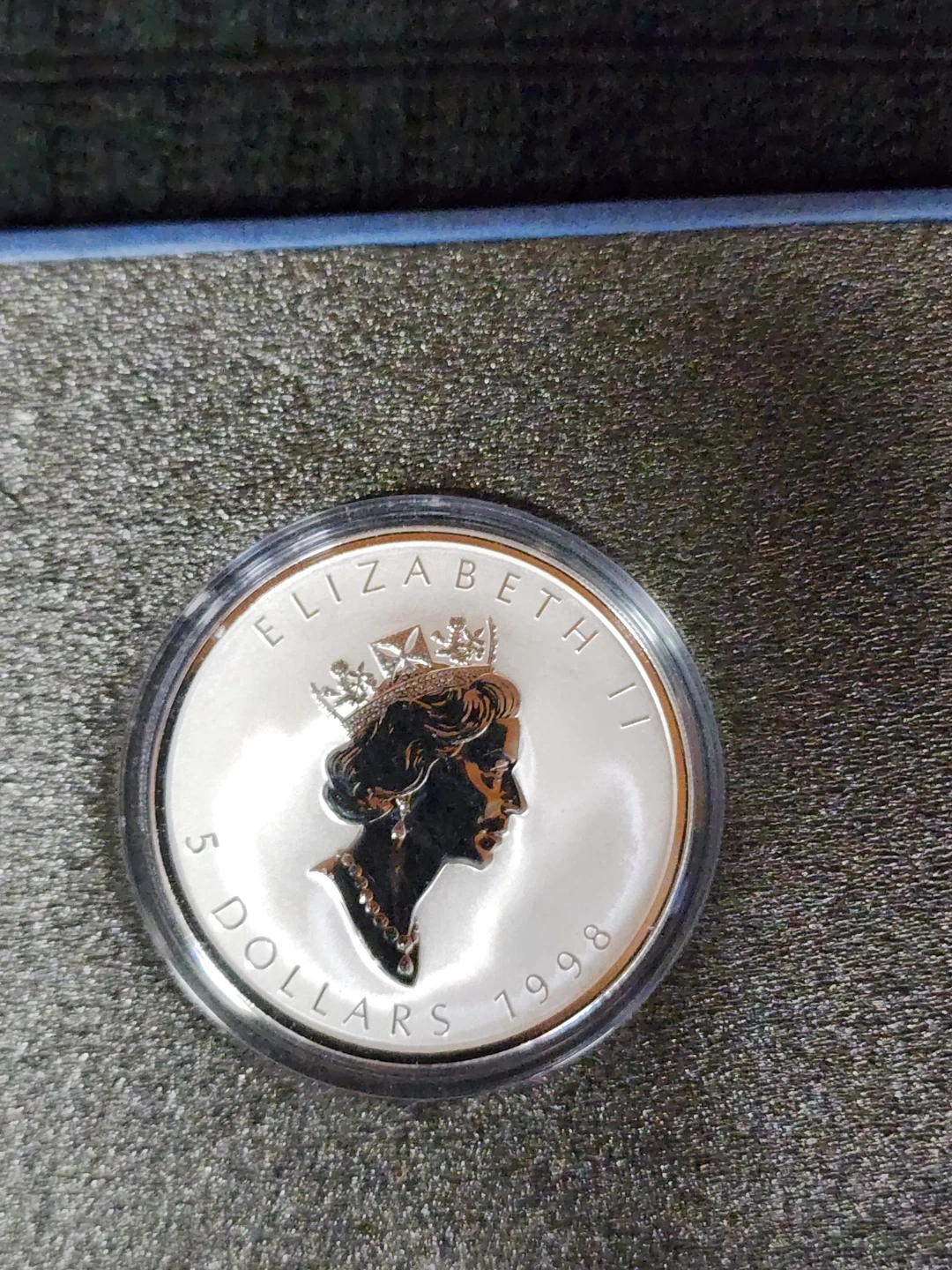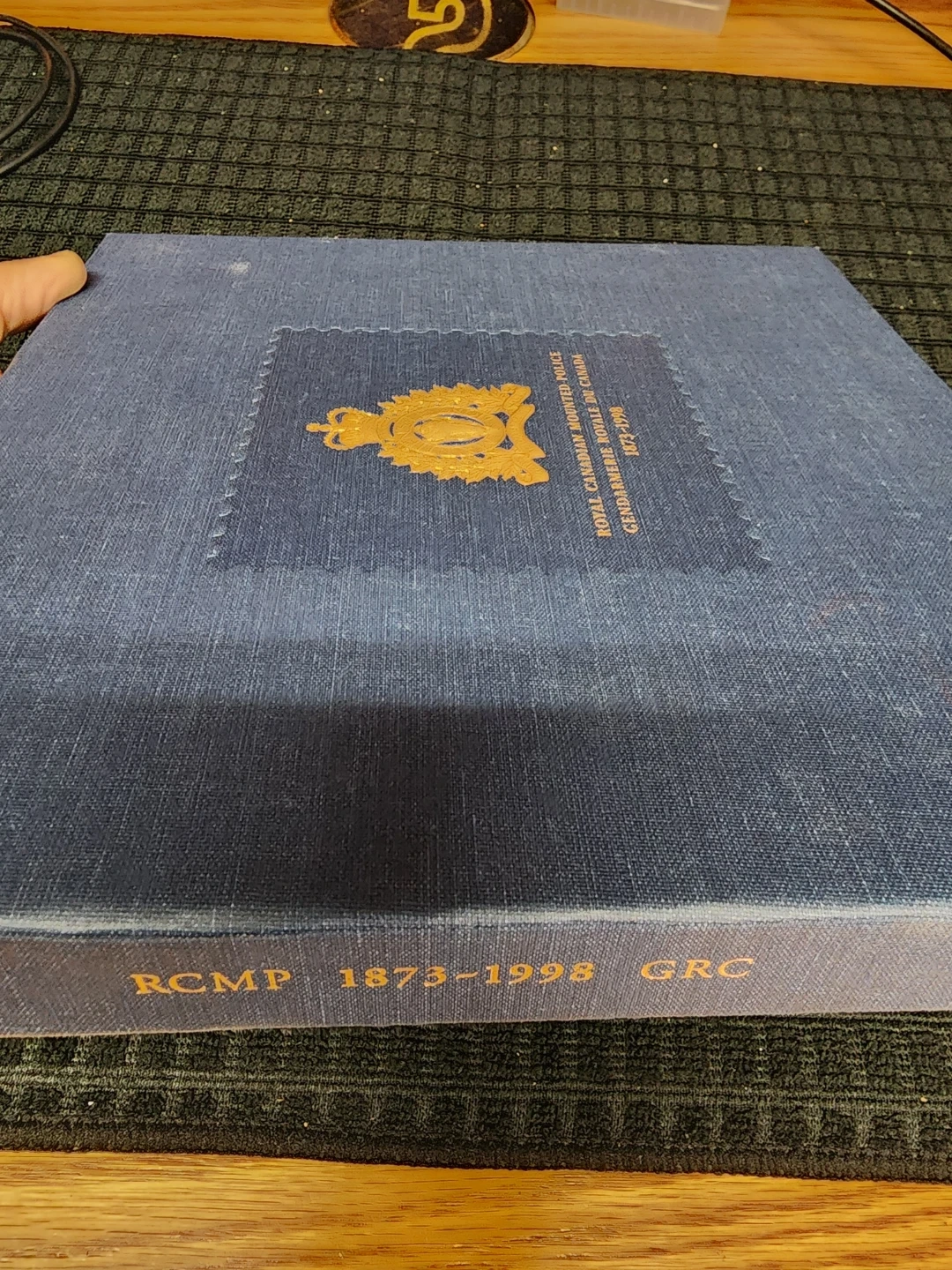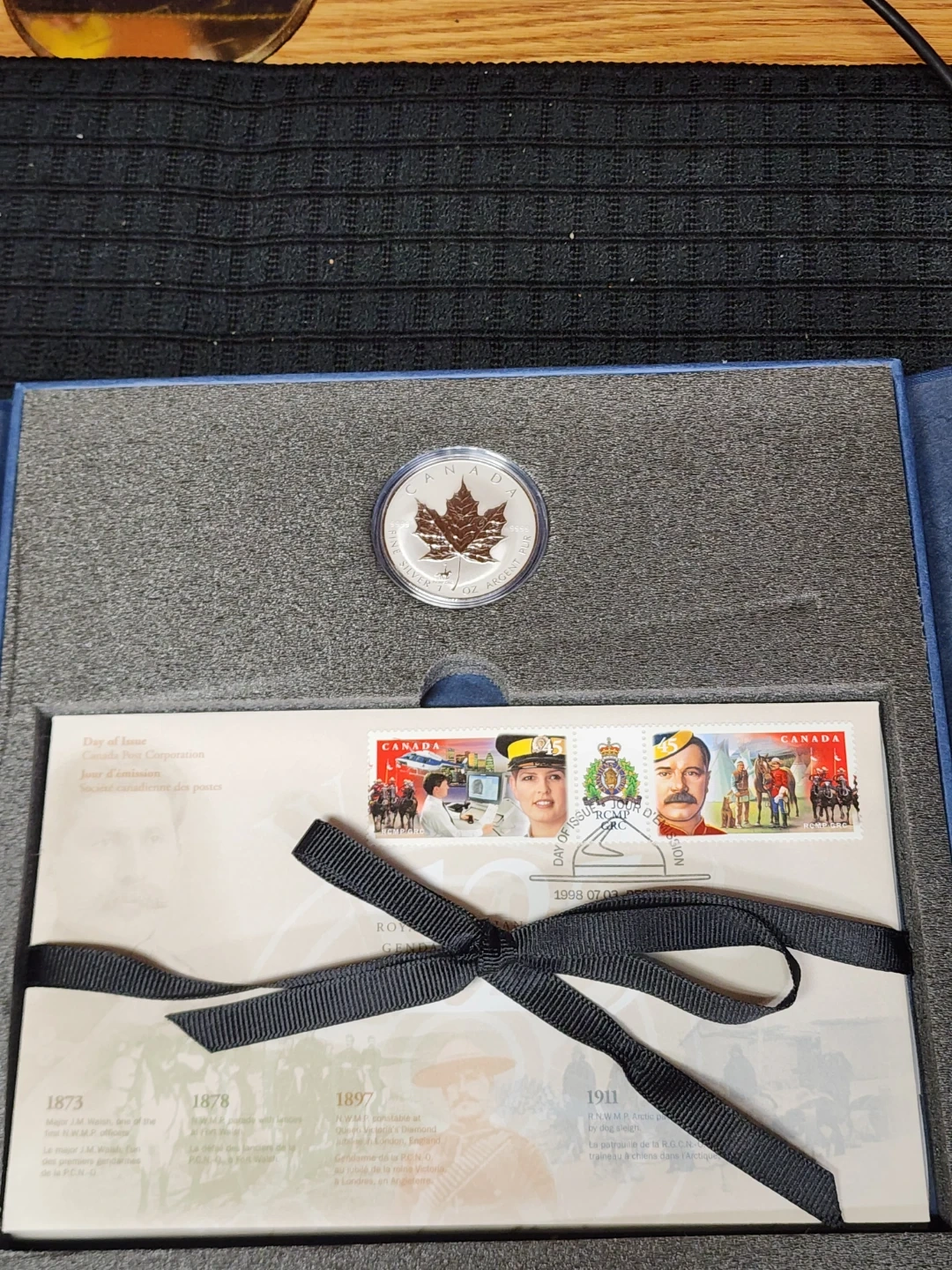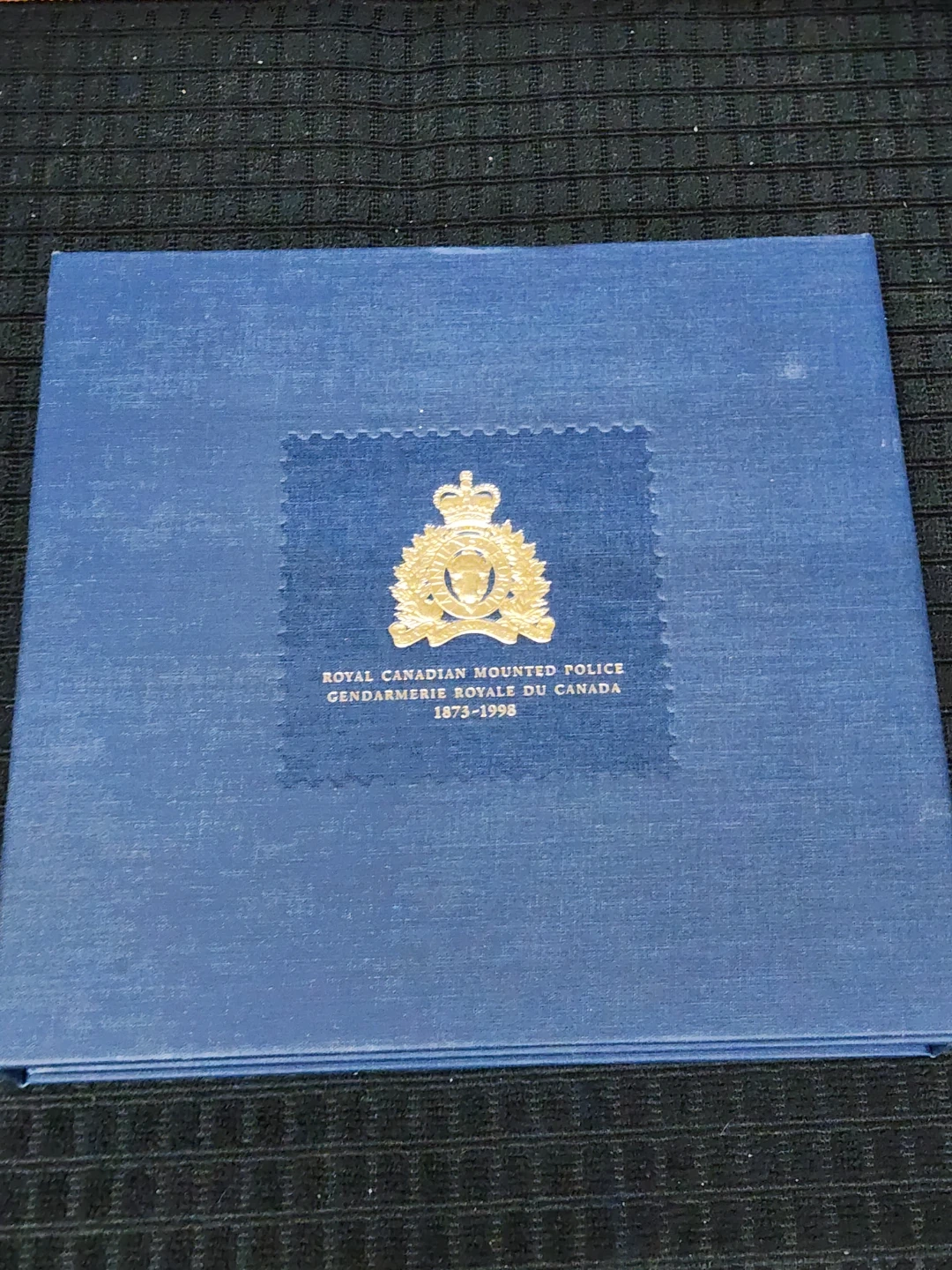 Selling a commemorative book celebrating the Royal Canadian Mounted Police from 1873-1998. It includes a 1oz silver coin with a maple leaf design and a collection of commemorative stamps. A great piece for collectors or anyone interested in Canadian history!
