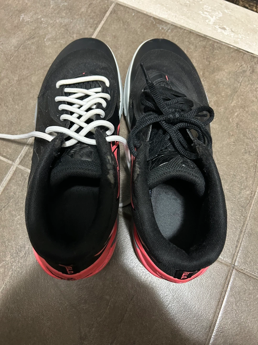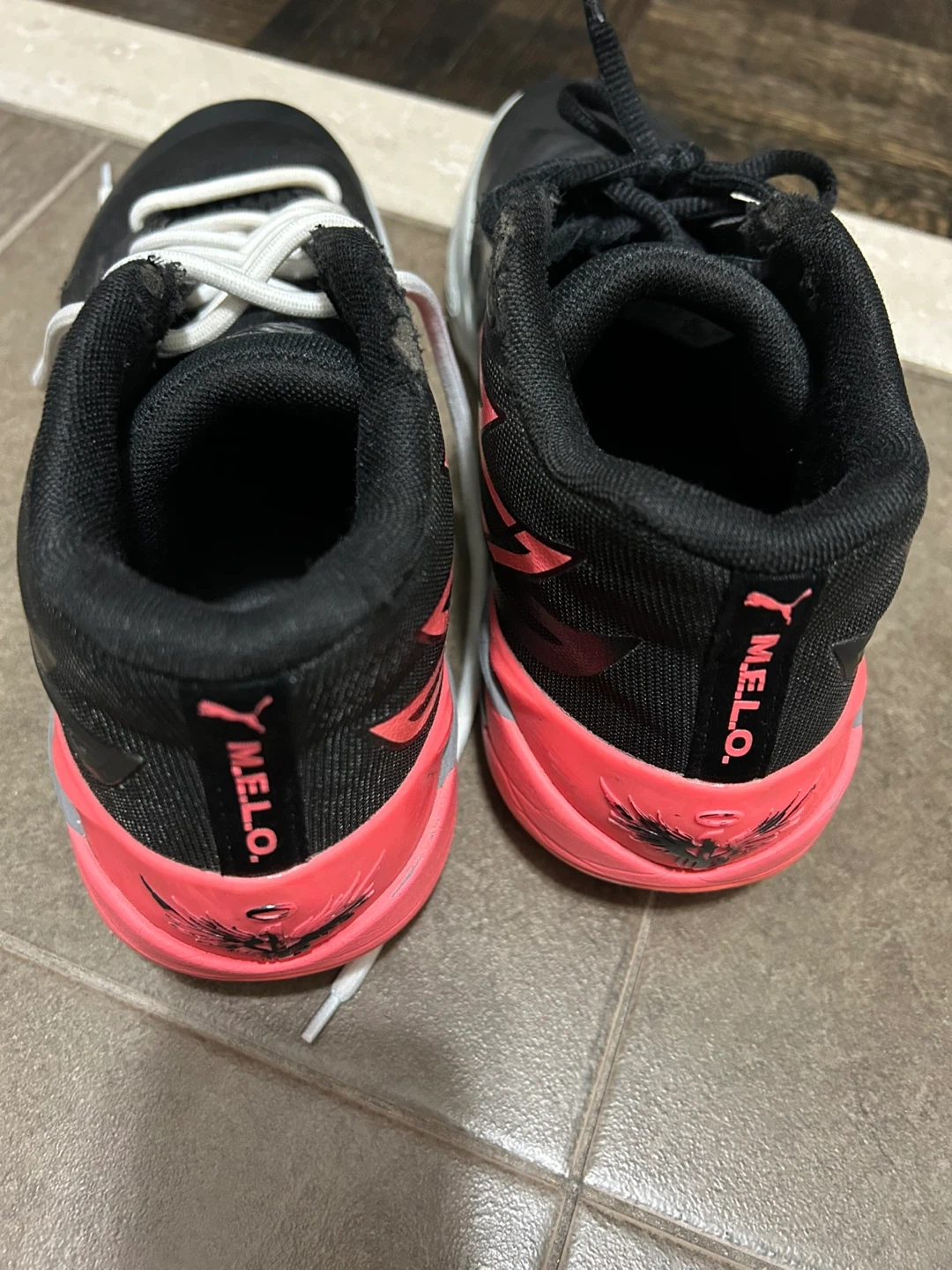 Selling a pair of Puma Melo basketball shoes in US size 10. They are black with a pink accent on the heel. Check out the photos for details!